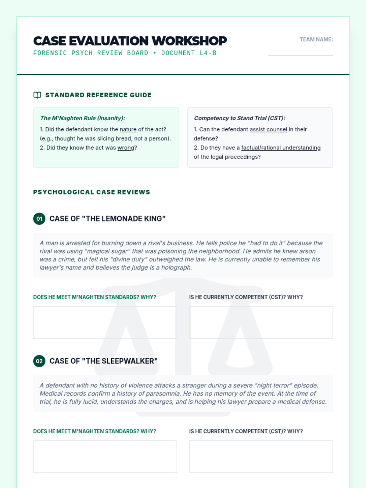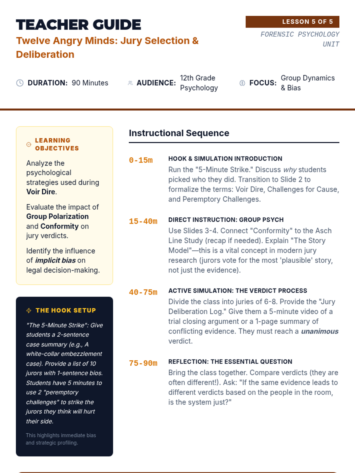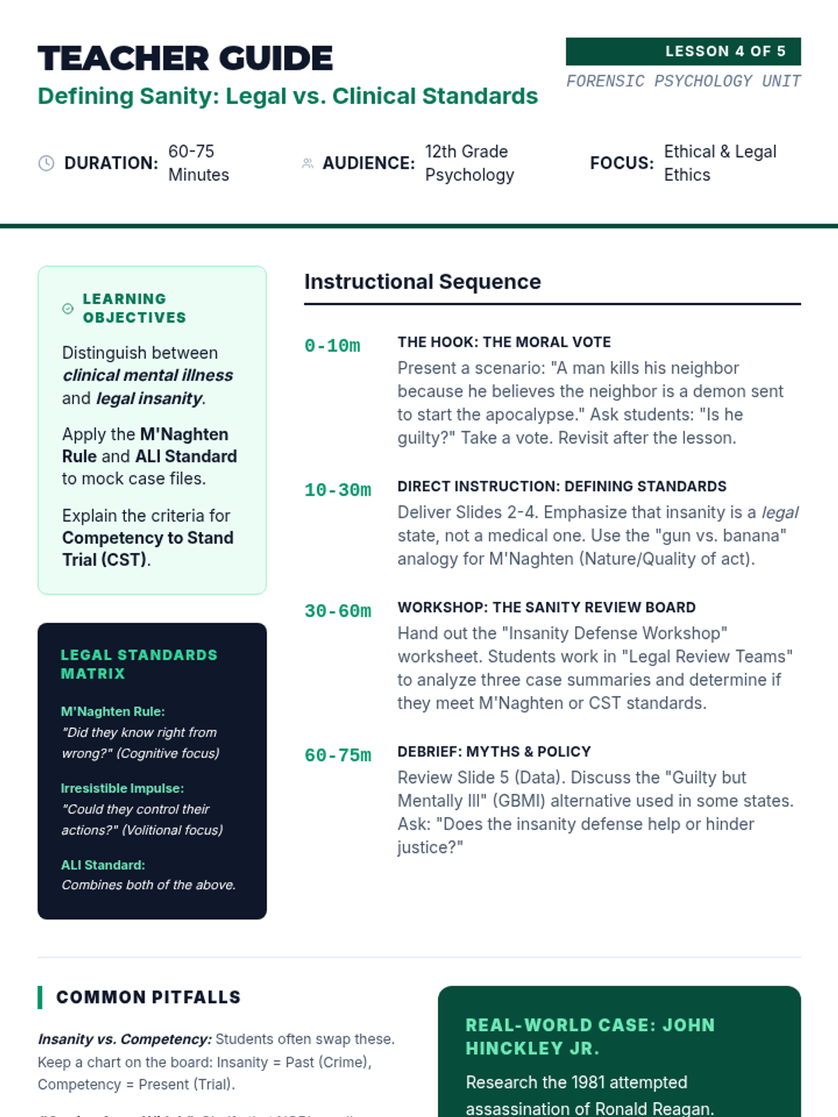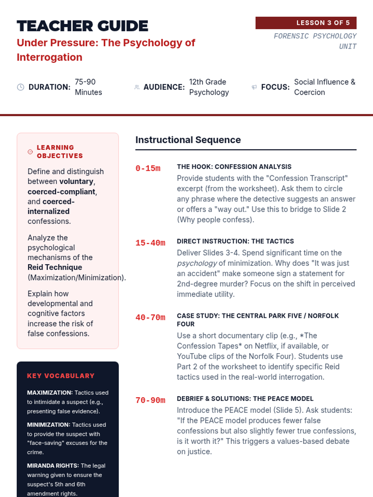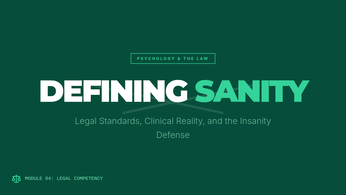 A comprehensive 12th-grade psychology unit exploring the intersection of human behavior and the legal system, covering profiling, memory reliability, interrogation techniques, legal standards for insanity, and jury dynamics.