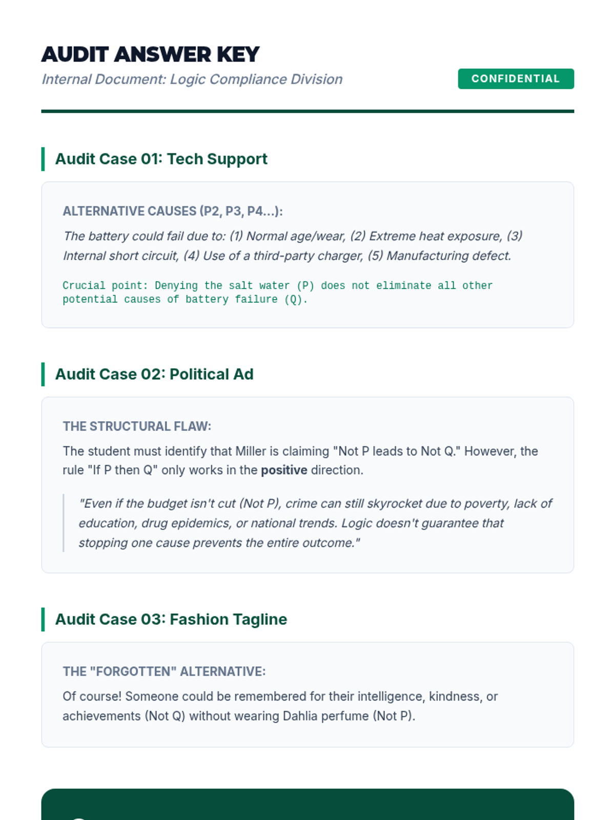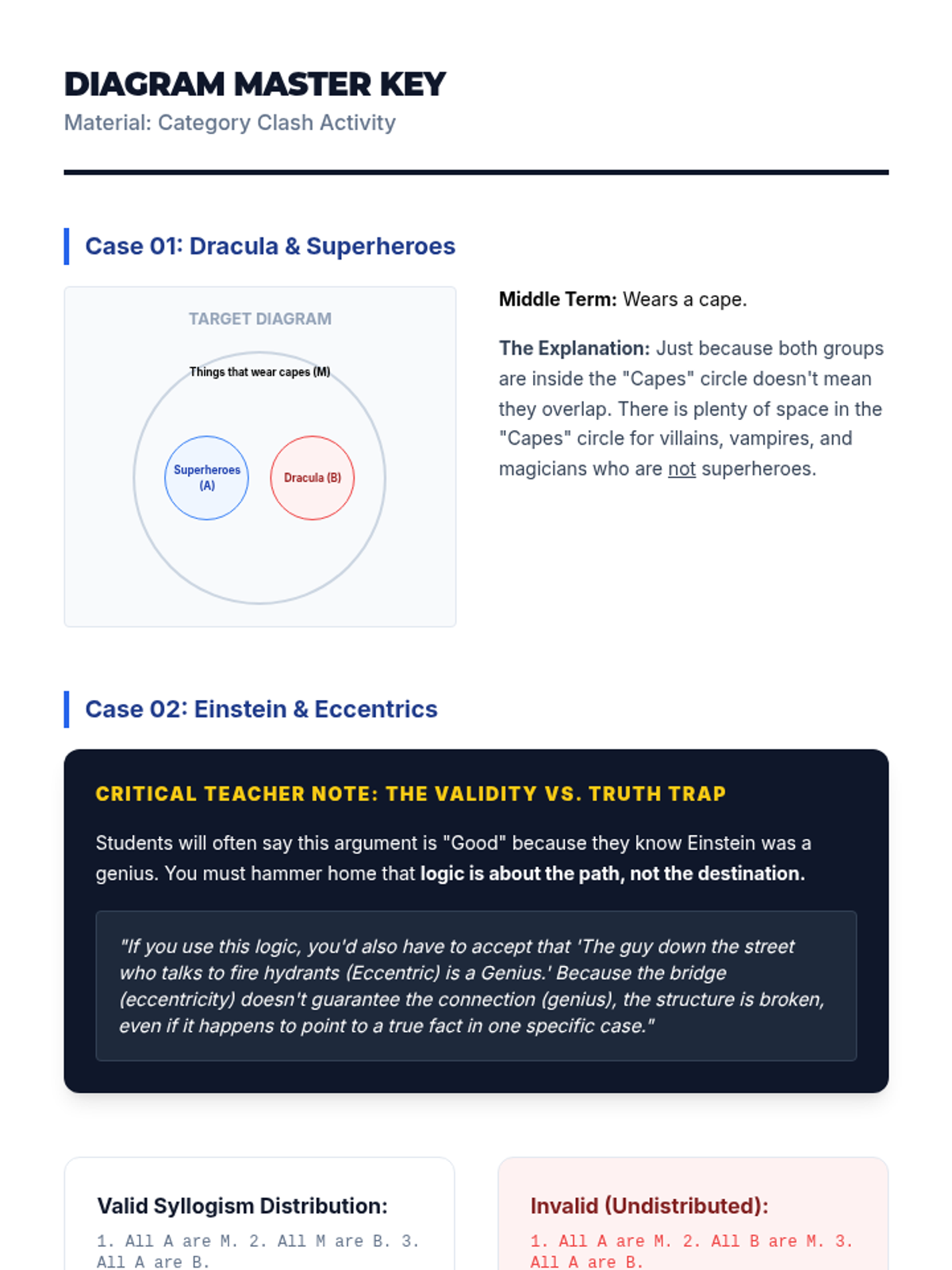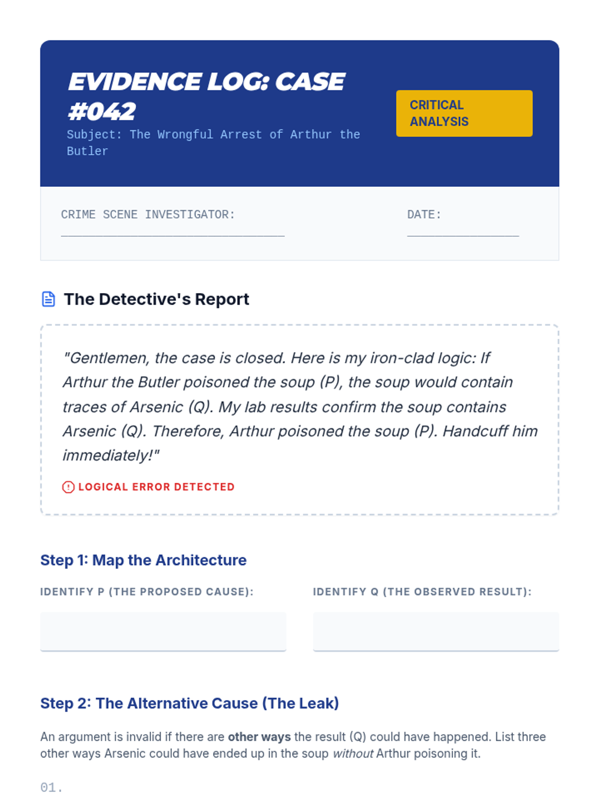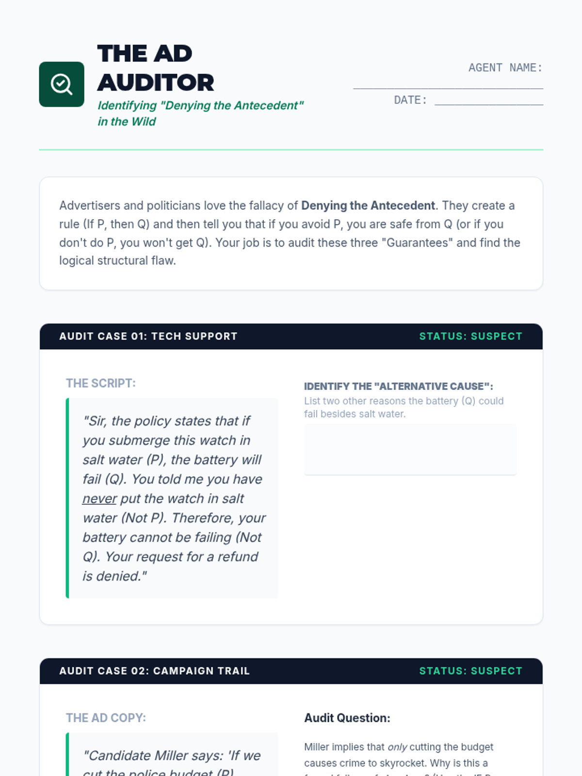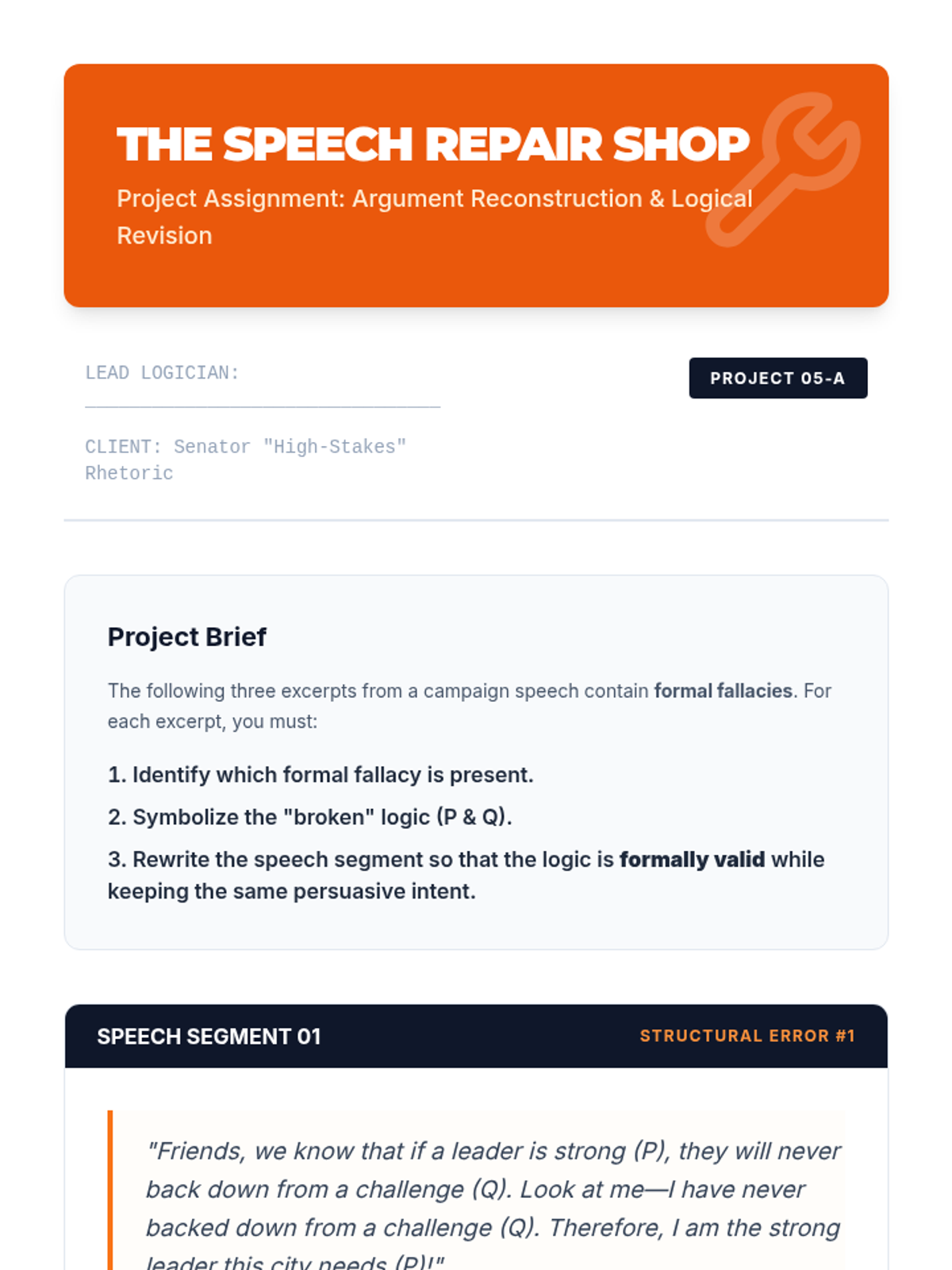 A high school ELA sequence focused on identifying structural errors in reasoning. Students learn to distinguish between informal fallacies (content-based) and formal fallacies (structure-based), specifically mastering affirming the consequent, denying the antecedent, and the undistributed middle.
