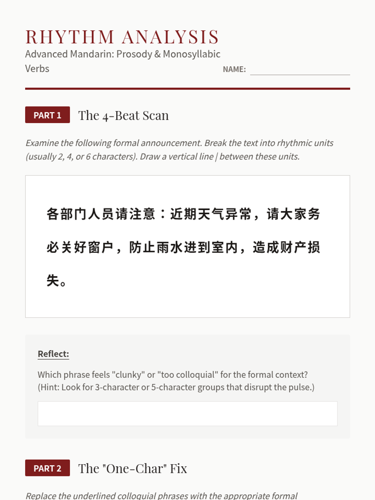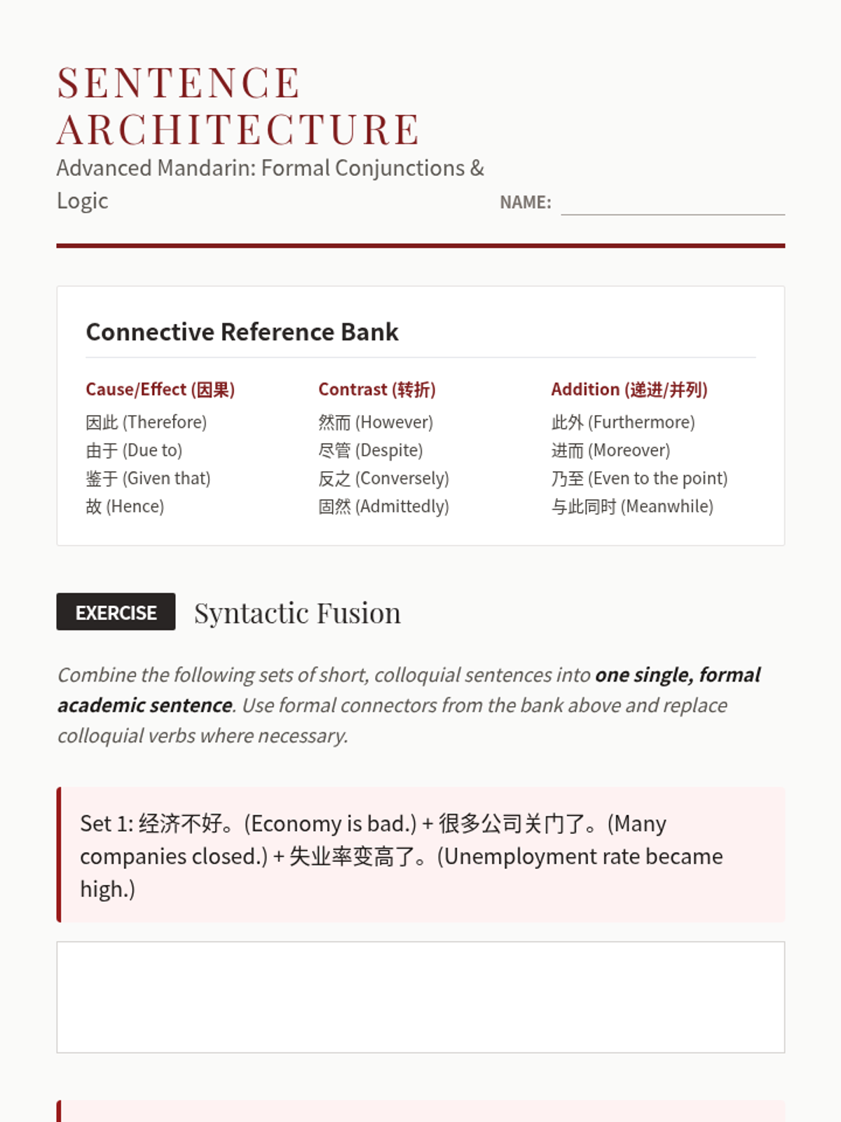 A comprehensive unit for advanced Mandarin learners focusing on the transition from colloquial speech to formal academic and bureaucratic written Chinese (Shumianyu). Students will master formal vocabulary, complex syntax, and stylistic registers.