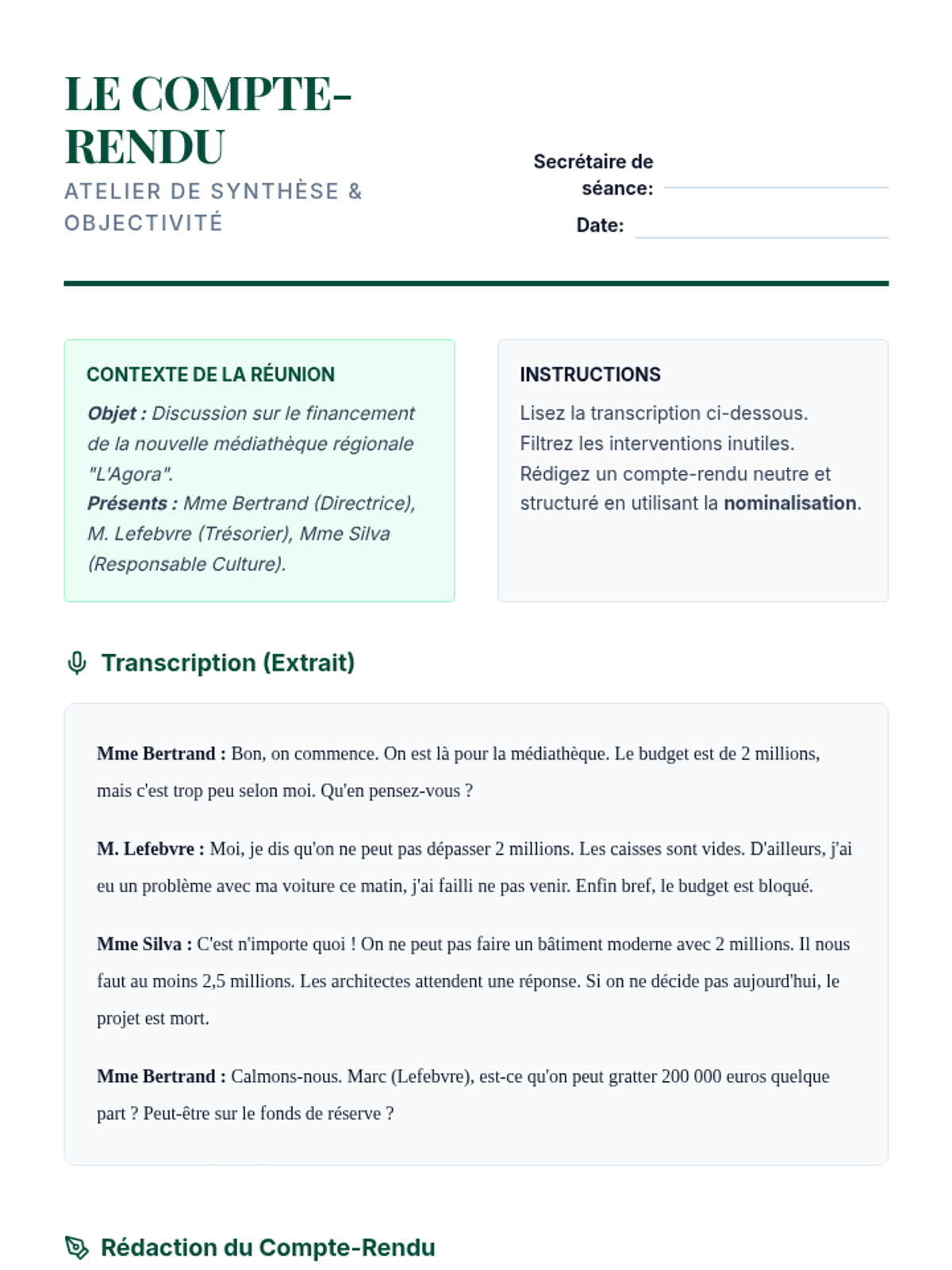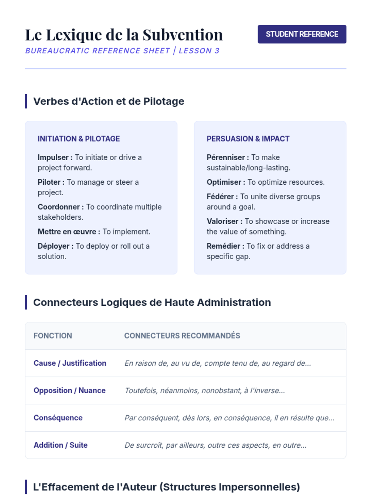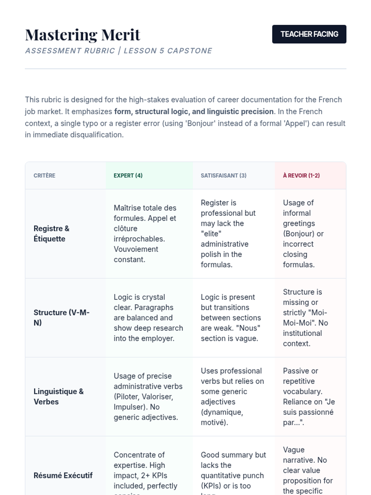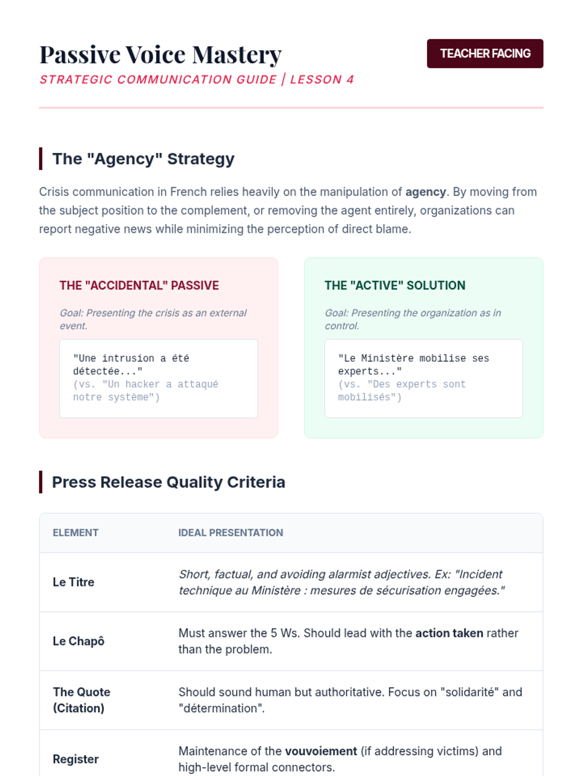 A comprehensive sequence for graduate students focusing on professional French writing, covering etiquette, reports, grant proposals, crisis communication, and career documentation. Students navigate a workplace simulation to master high-level register and organizational communication.