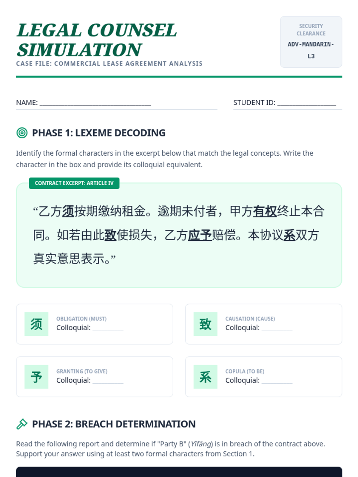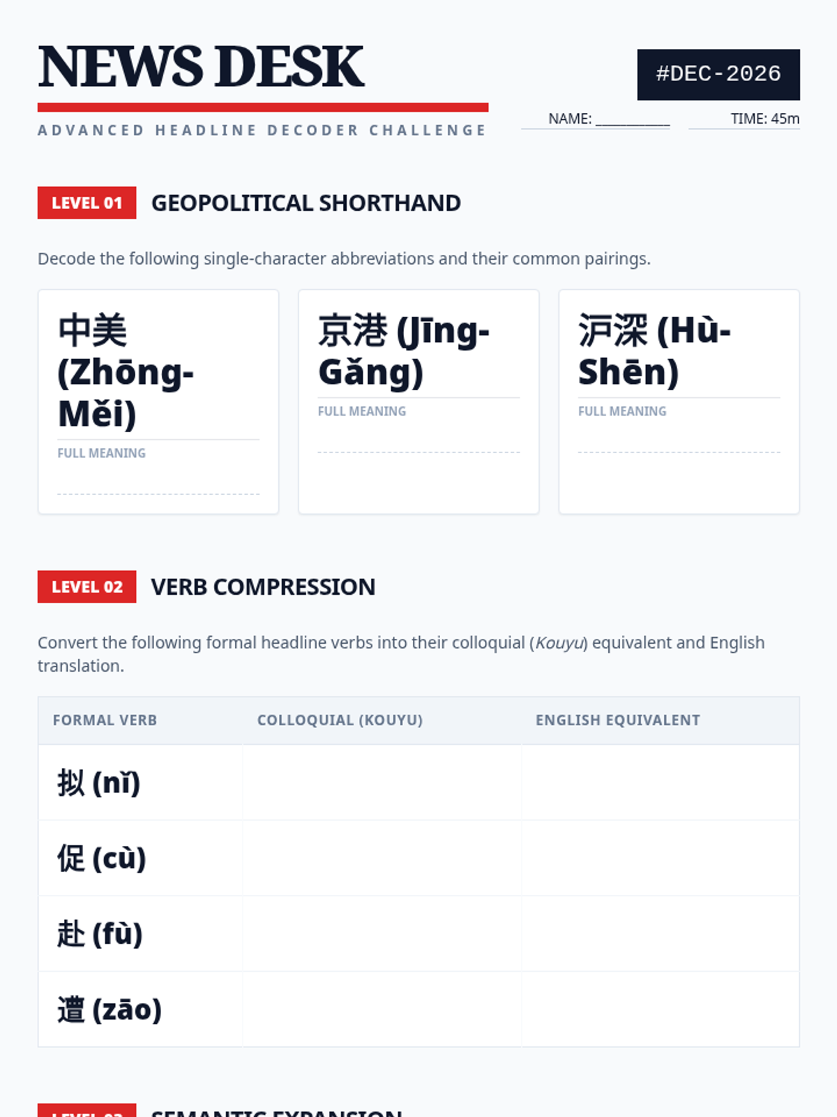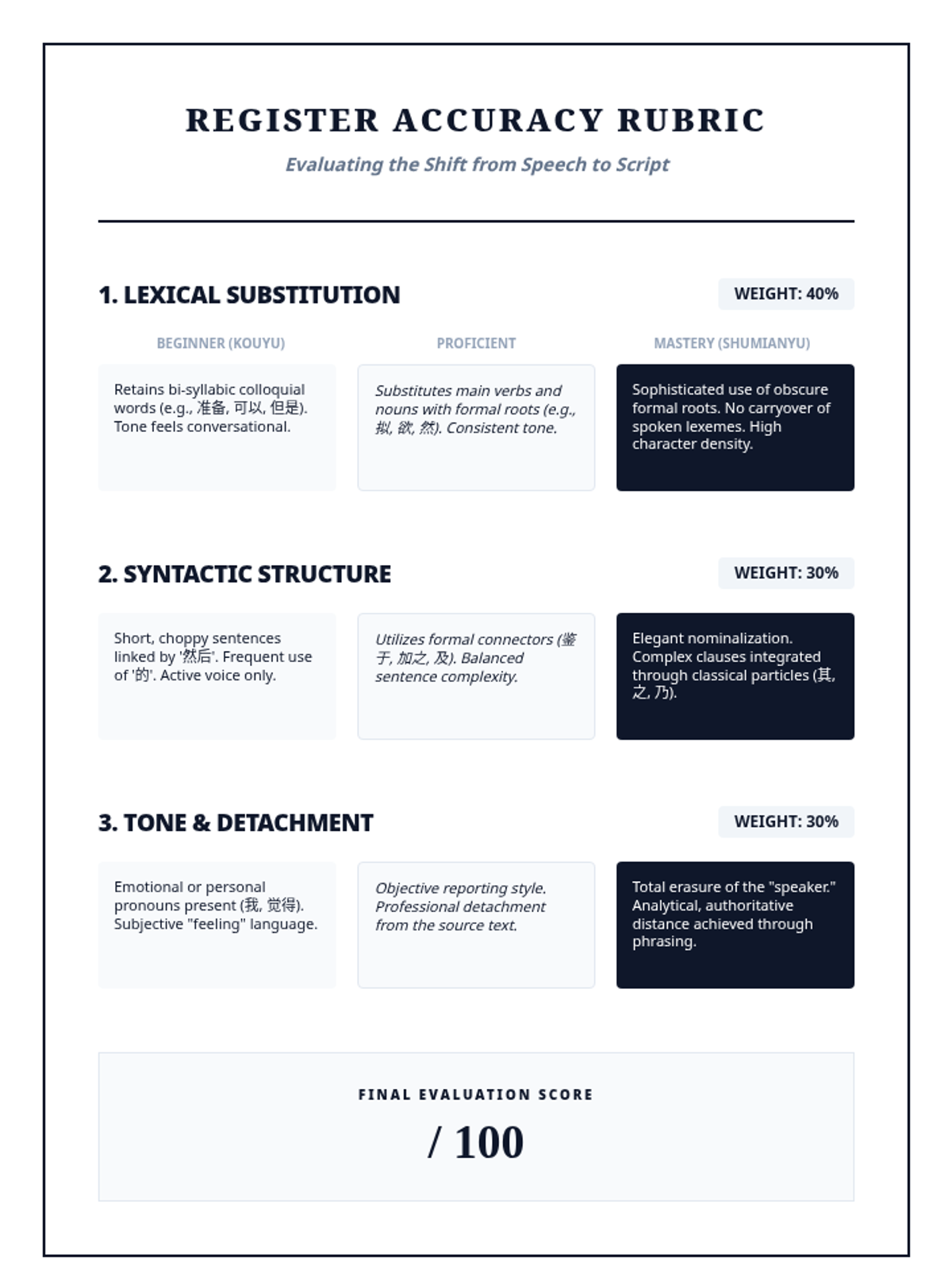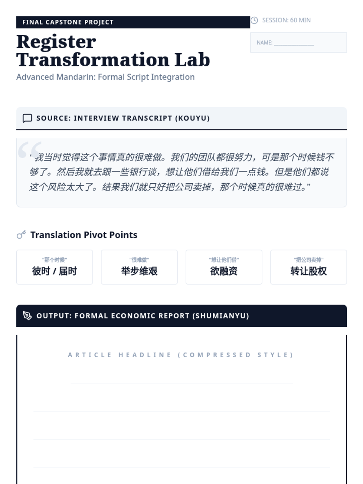 An advanced Mandarin Chinese sequence for graduate students focusing on the formal written register (Shumianyu). Students master monosyllabic roots, formal connectors, business/legal lexicon, and newspaper headline compression to achieve professional-level literacy.