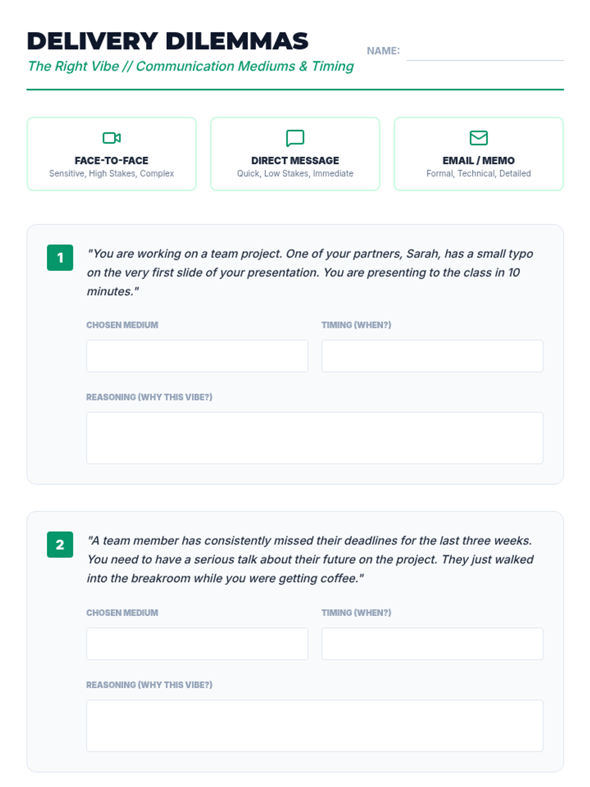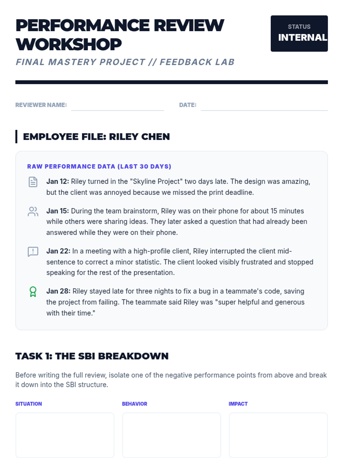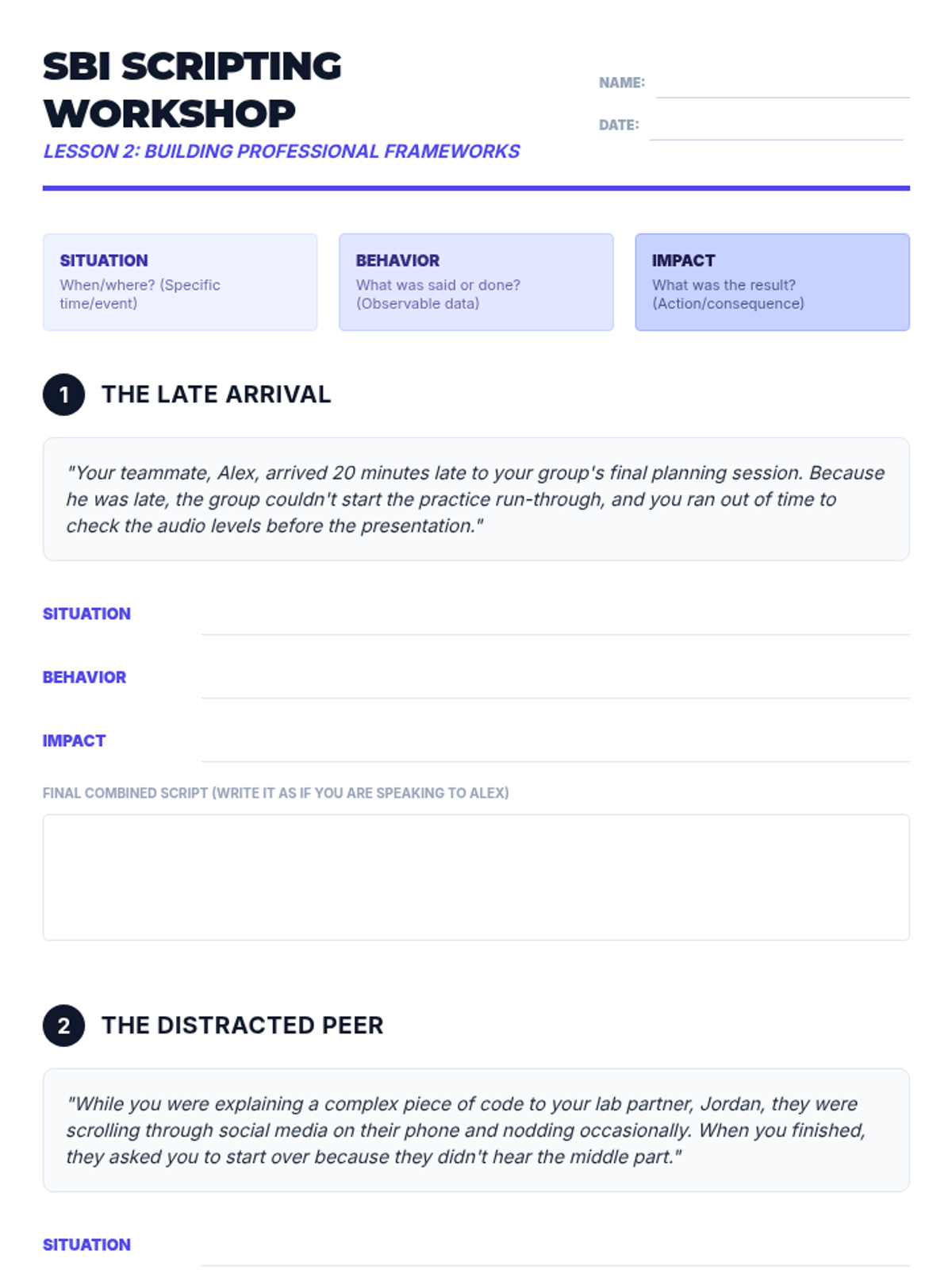 A comprehensive unit on professional communication focusing on the mechanics of constructive feedback. Students learn to move from subjective complaints to objective, actionable observations using the SBI model and refined delivery techniques.