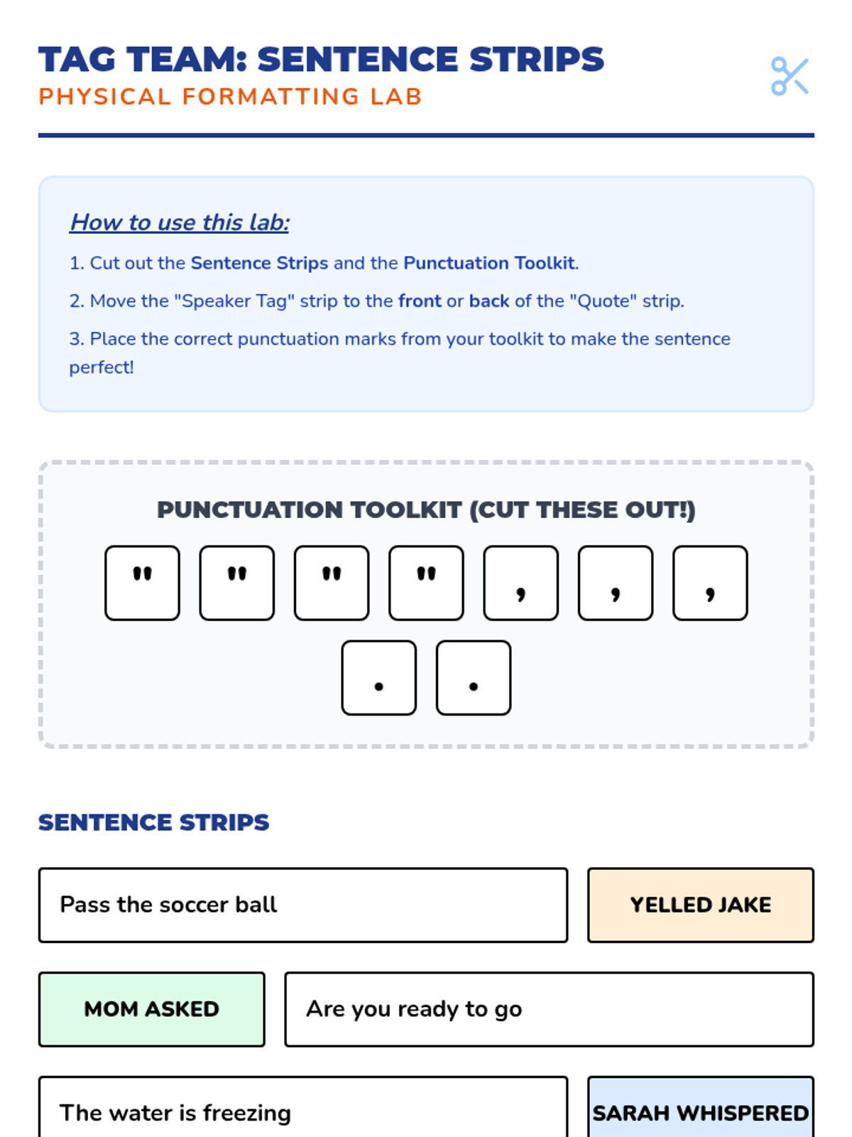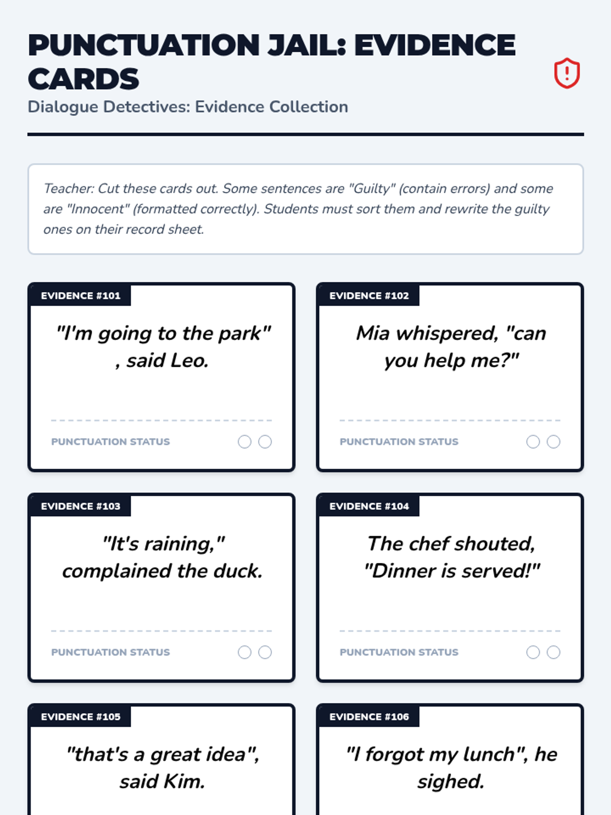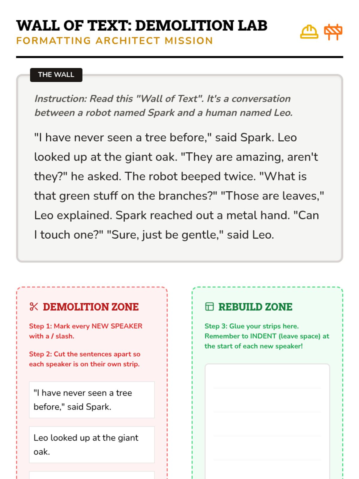 This sequence immerses students in the rules of formatting conversation within narrative writing. Starting with speech bubbles, students transition to quotation marks, commas, and capitalization. The learning arc emphasizes the visual rule of starting a new paragraph when a new speaker begins.
