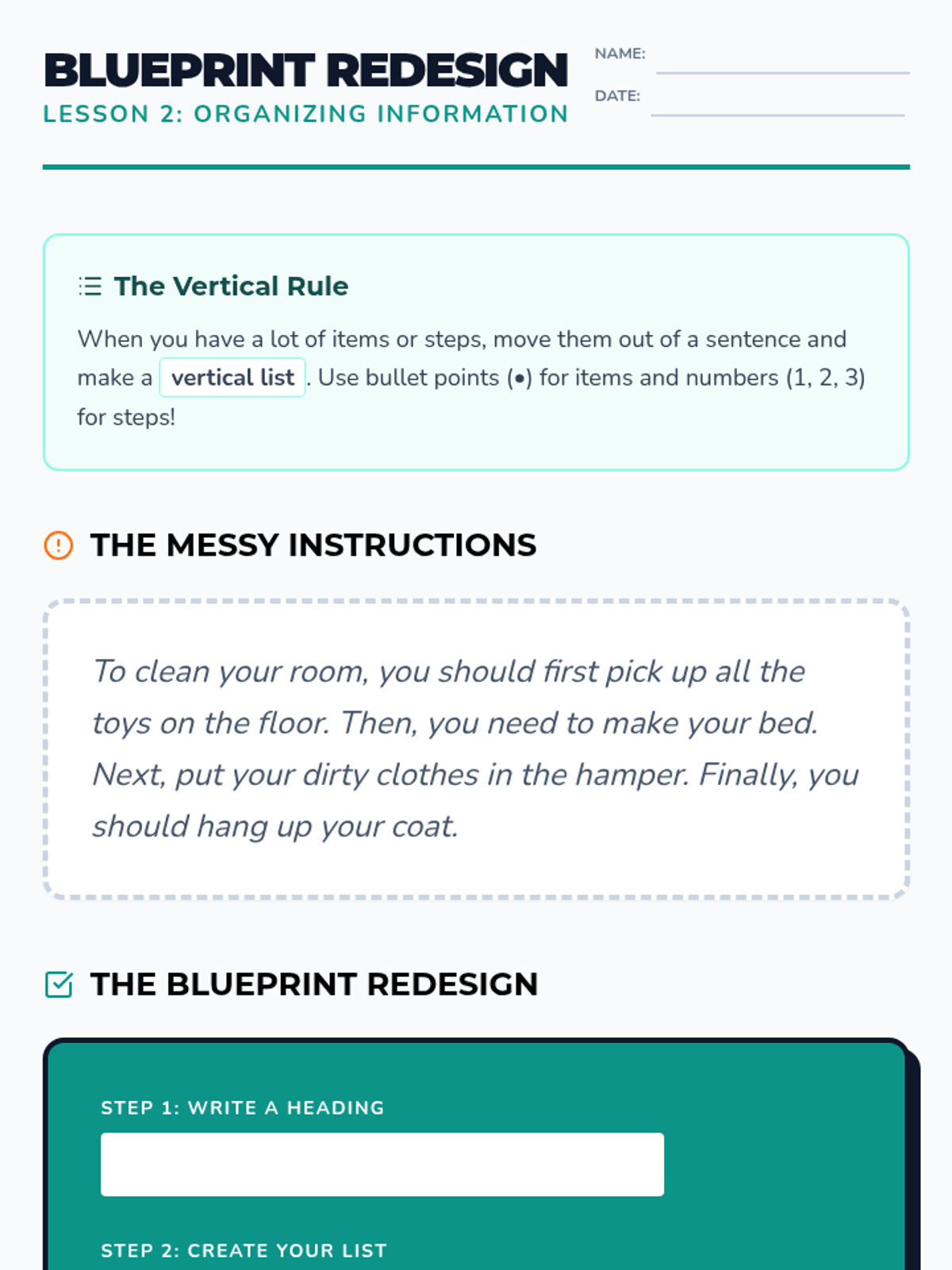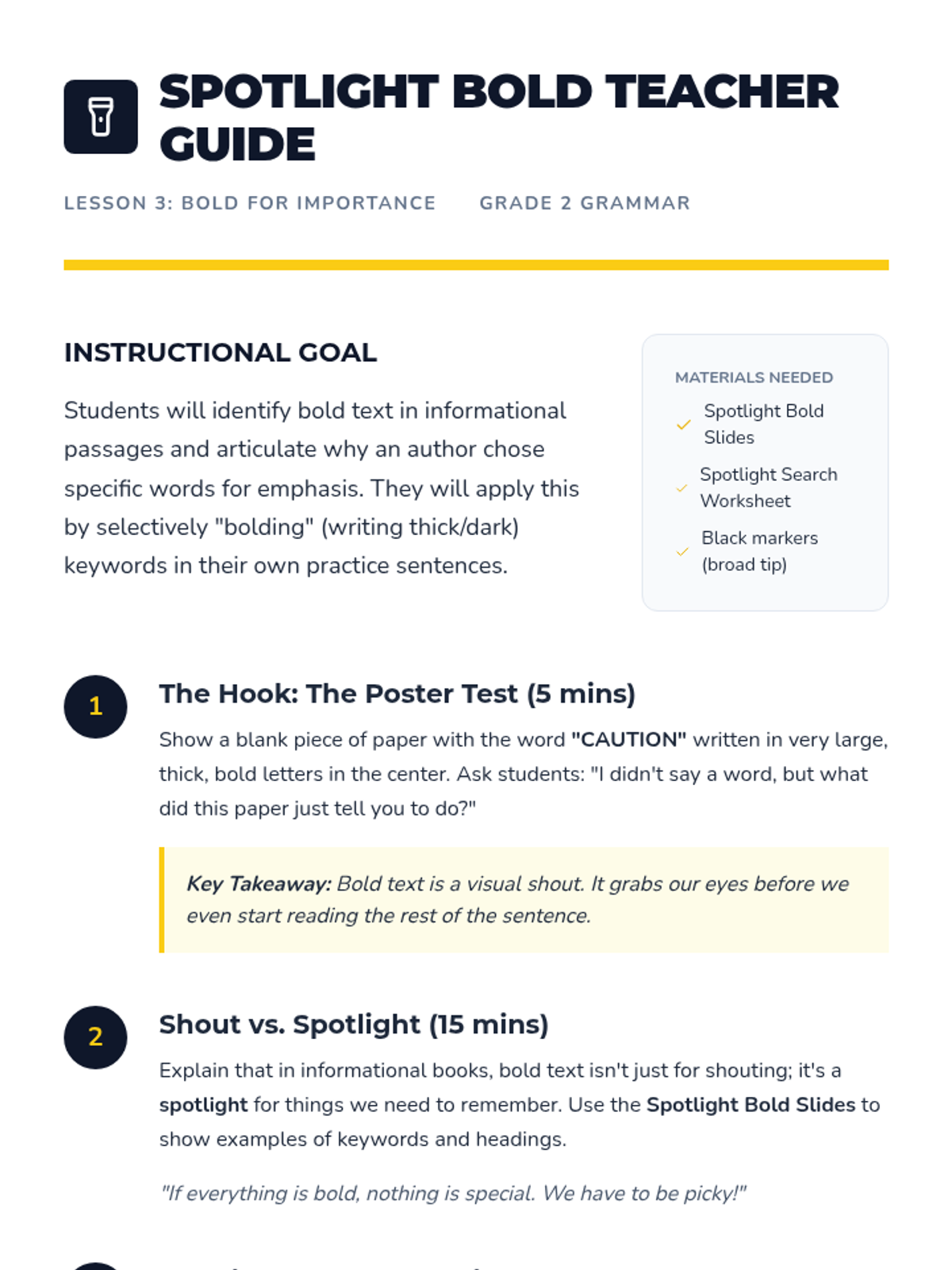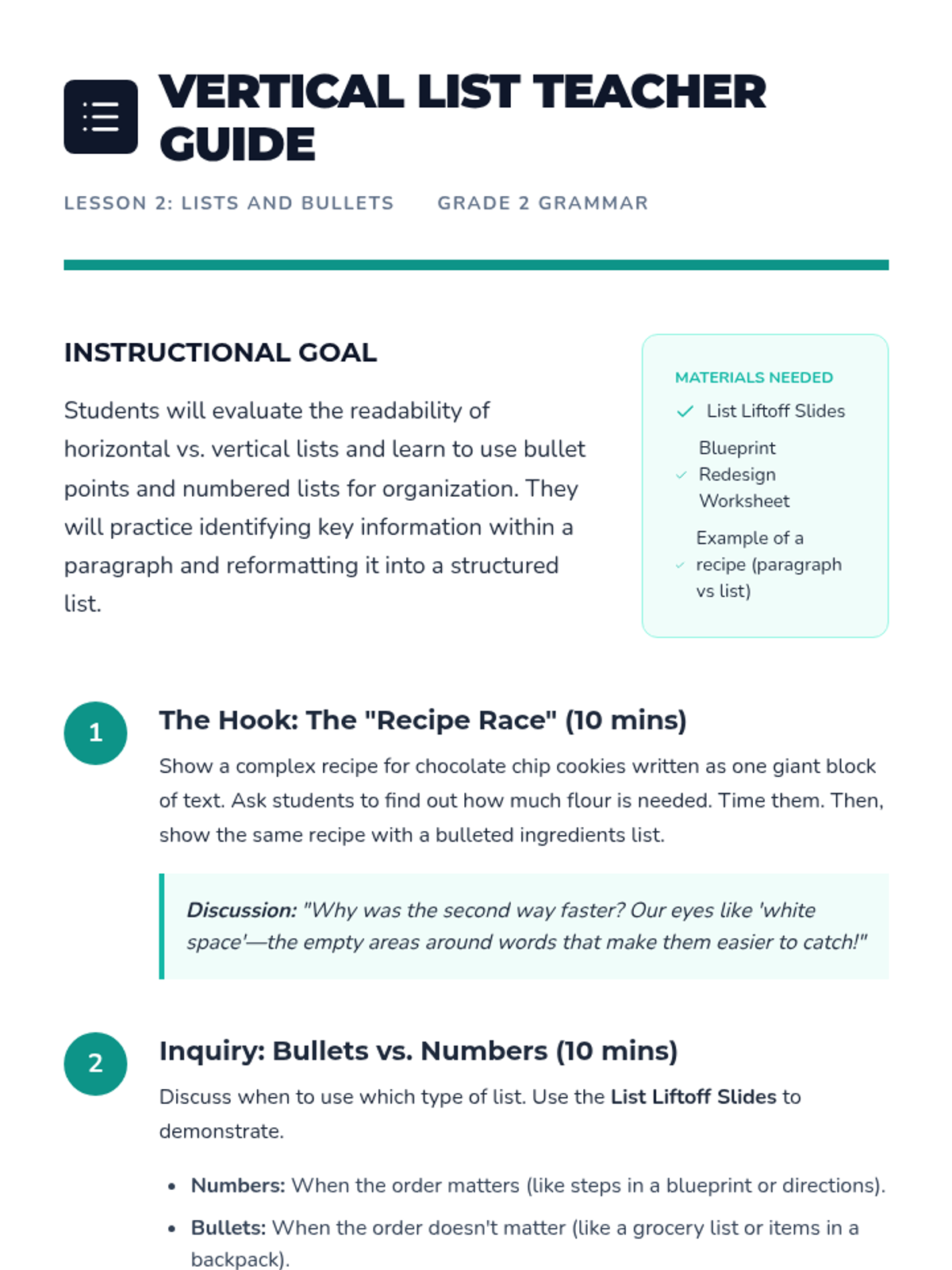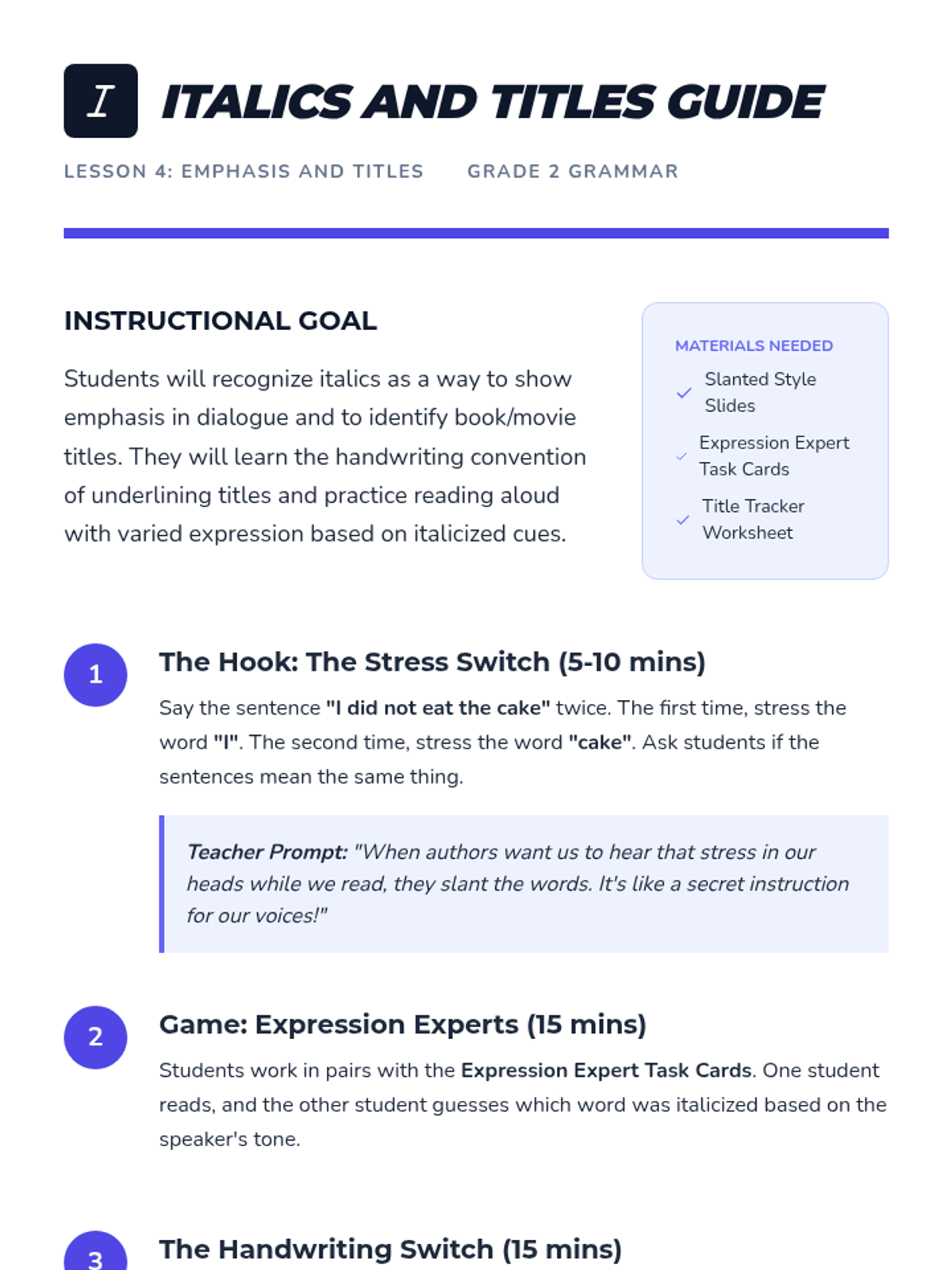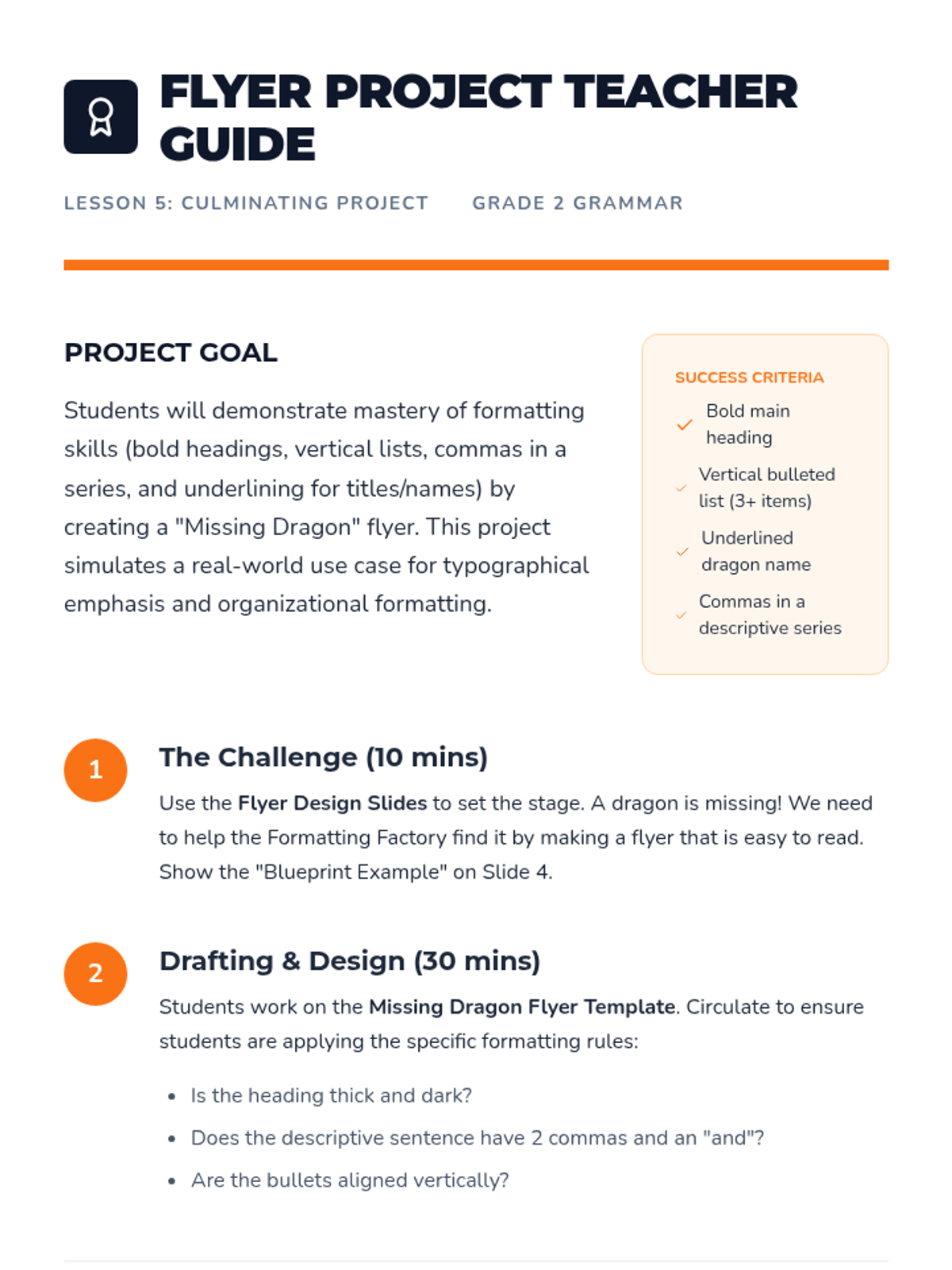 A 2nd-grade grammar sequence focused on organizational formatting, including commas in a series, vertical bulleted lists, and the use of bold and italics for emphasis and titles. Students learn to use these tools to improve clarity and expression in their writing.