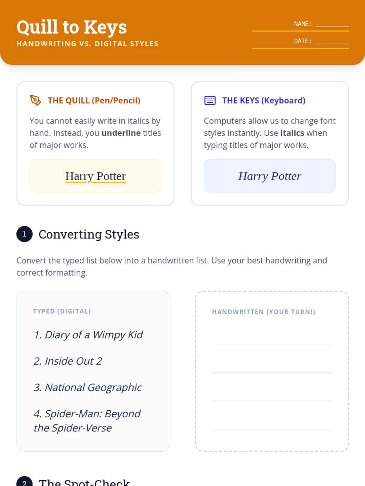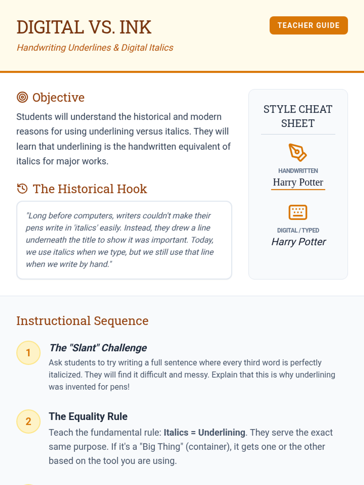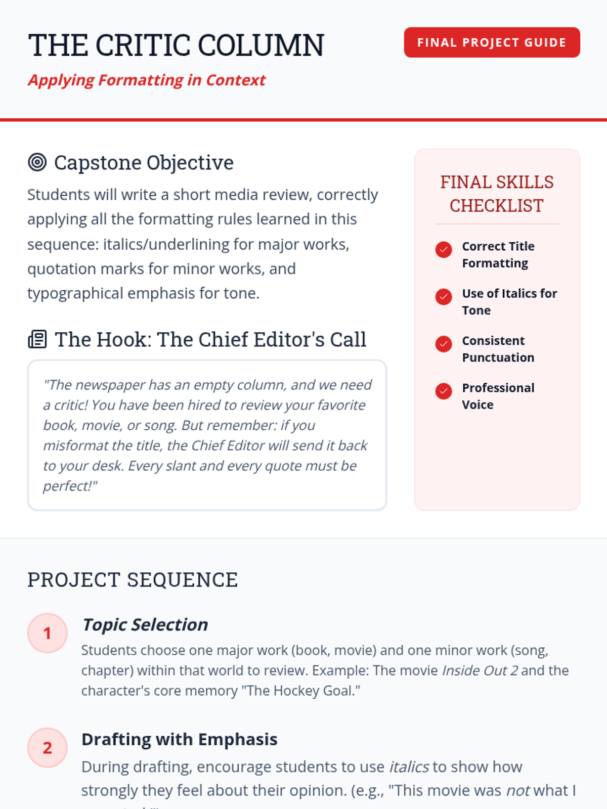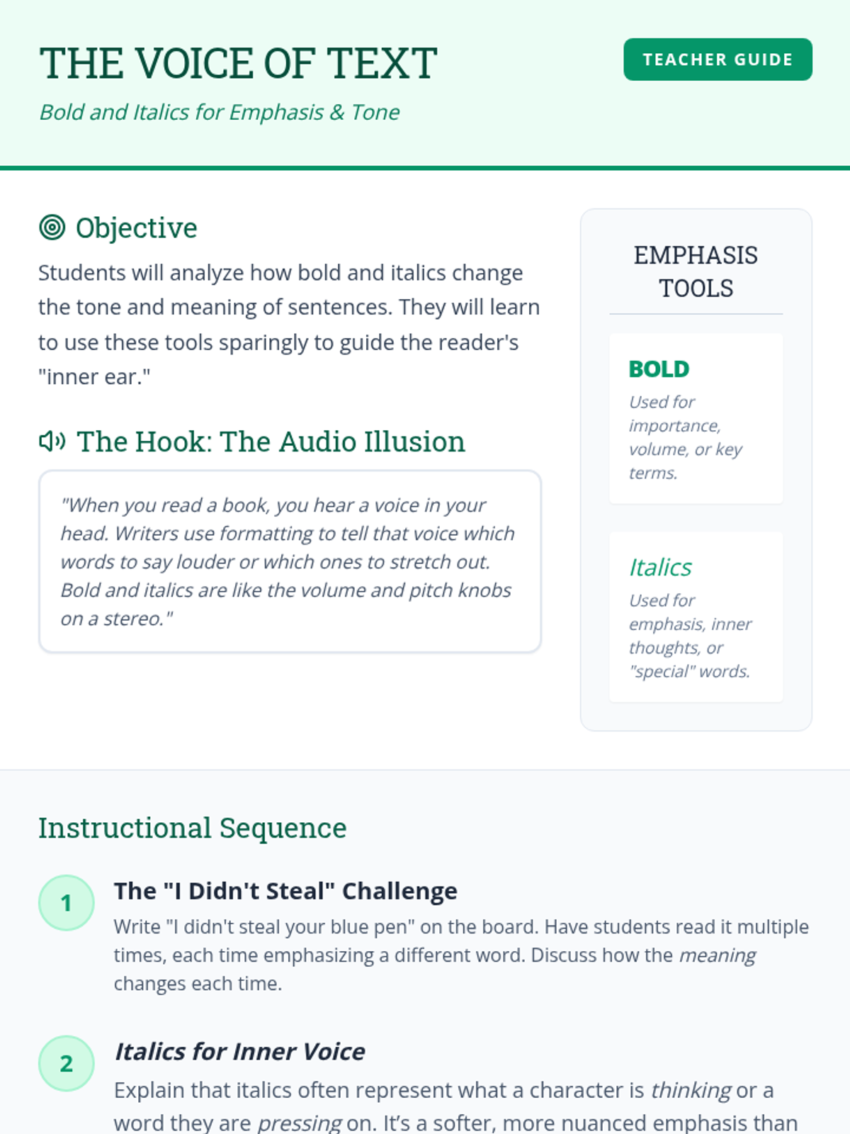 A comprehensive 5th-grade sequence on formatting titles and using typographical emphasis. Students learn to distinguish between major and minor works, navigate digital versus handwritten styles, and use bold and italics to convey tone and meaning.