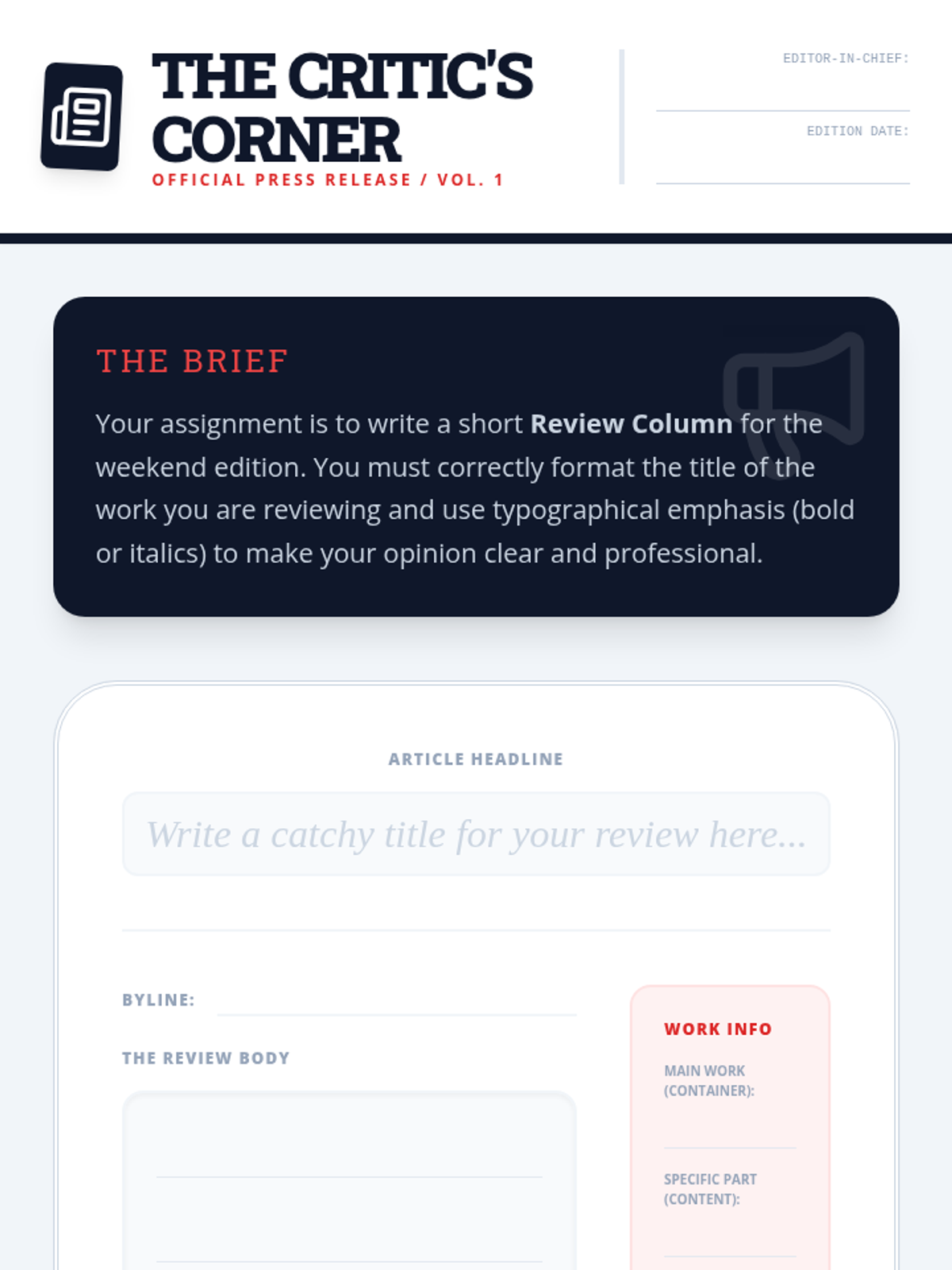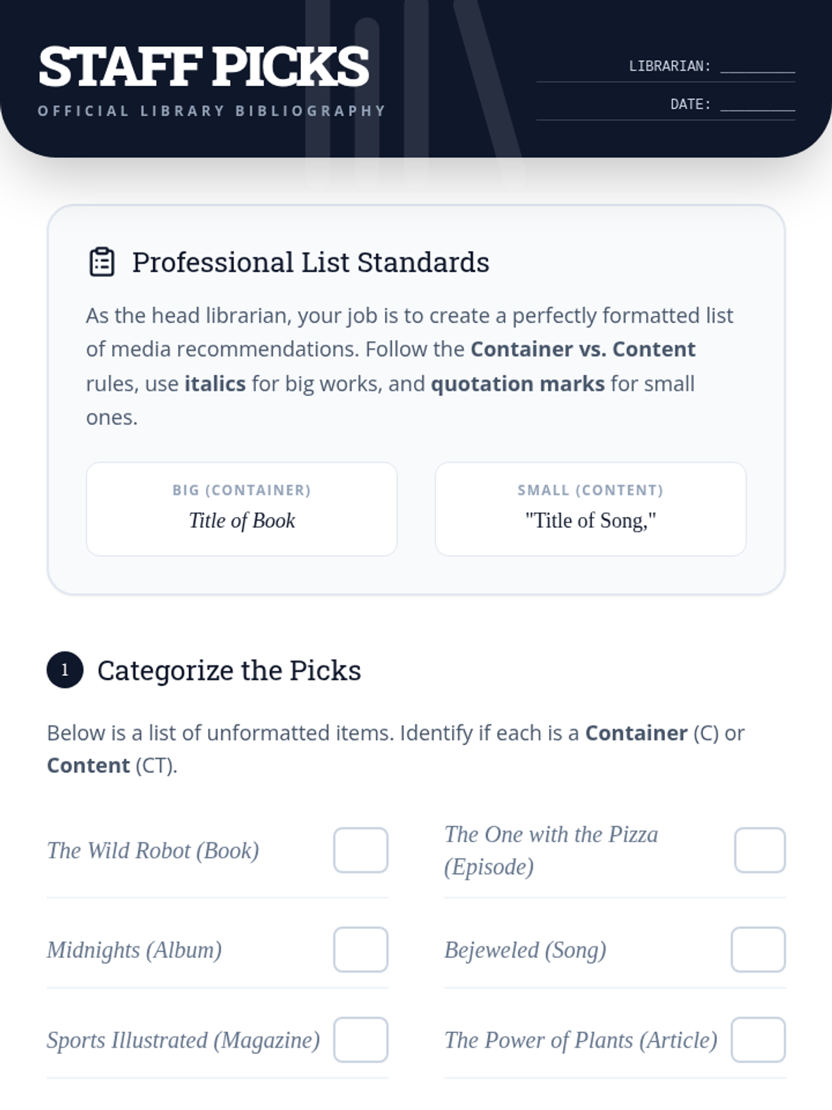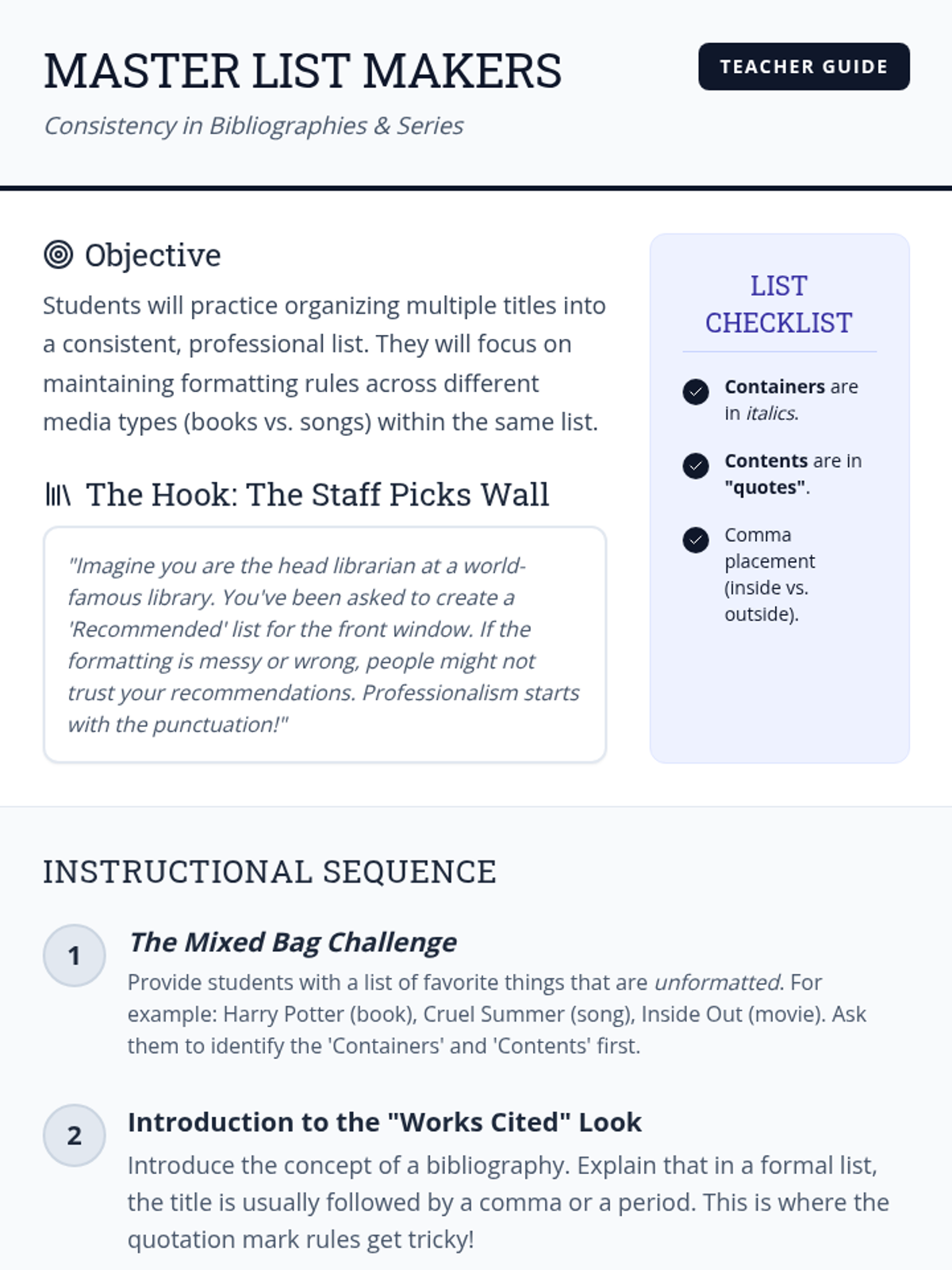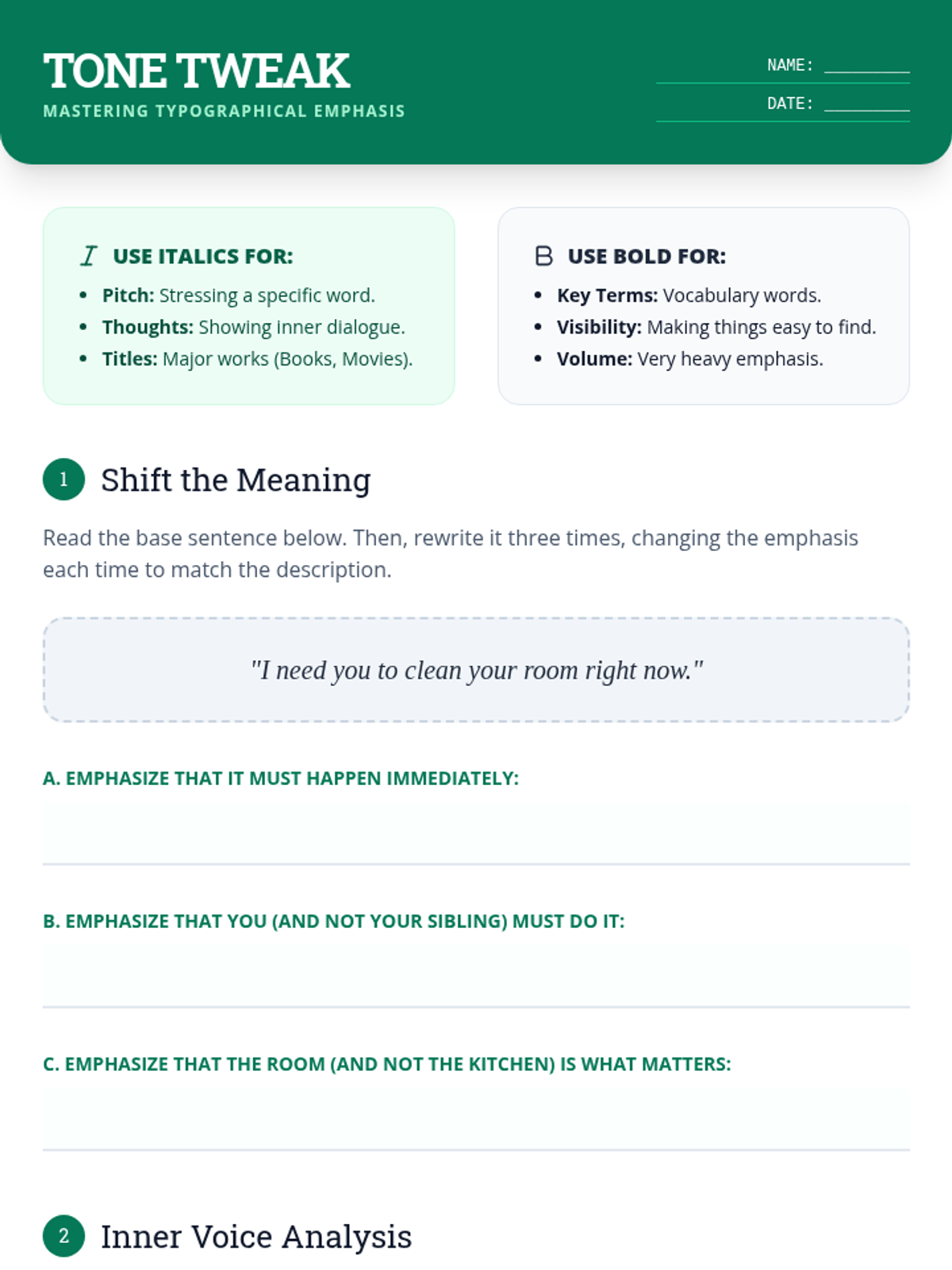 A comprehensive 5th-grade sequence on formatting titles and using typographical emphasis. Students learn to distinguish between major and minor works, navigate digital versus handwritten styles, and use bold and italics to convey tone and meaning.
