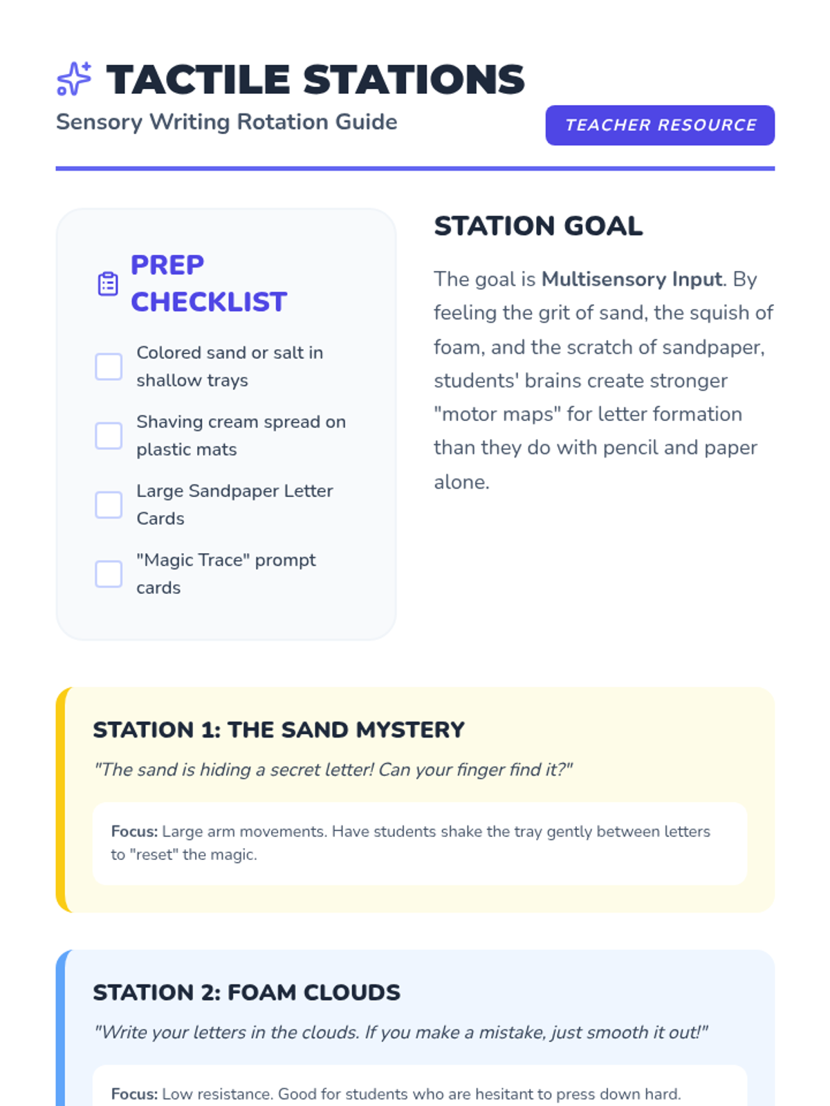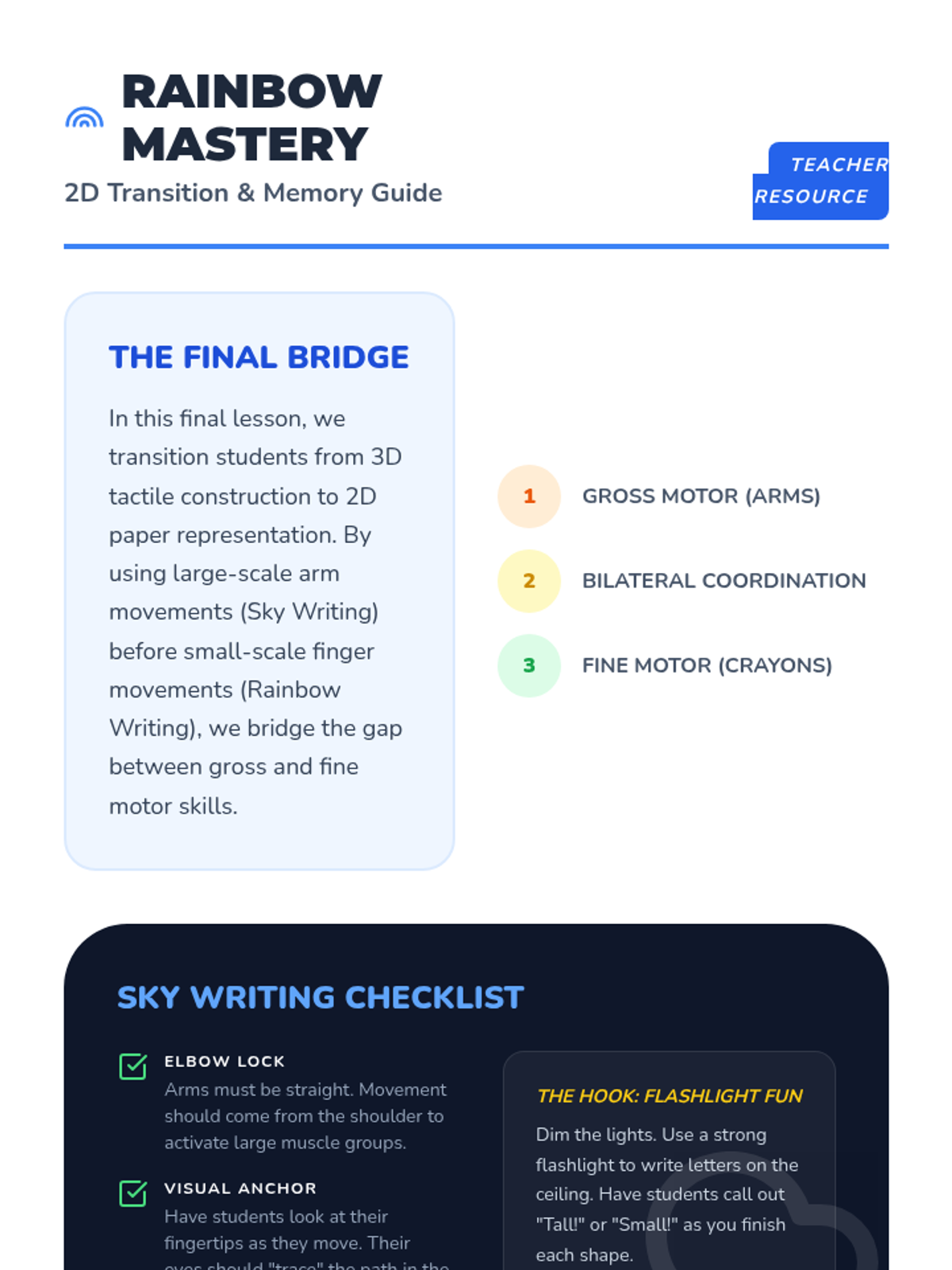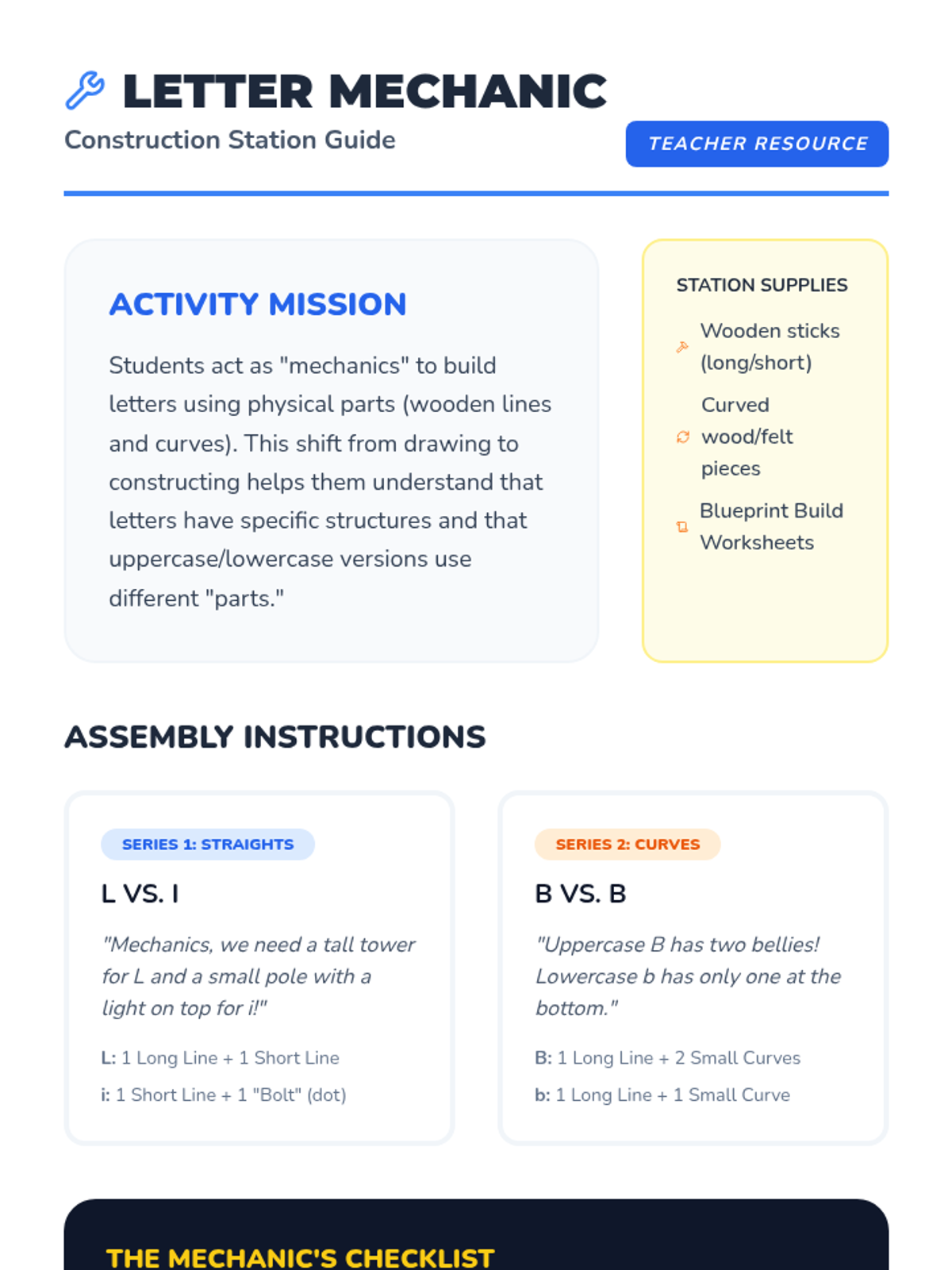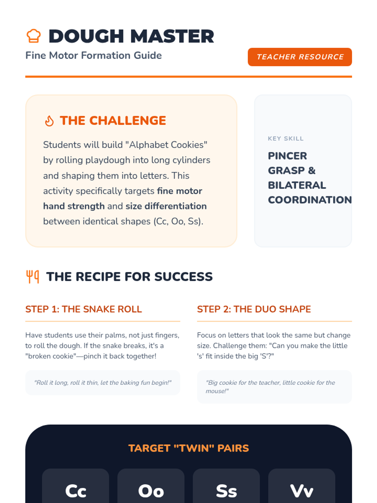 This sequence uses multisensory approaches to help Pre-K students distinguish between uppercase and lowercase letters through gross motor movement, tactile construction, and sensory writing. Students progress from full-body shapes to fine motor manipulation, internalizing the spatial and structural differences between 'tall' and 'small' letters.