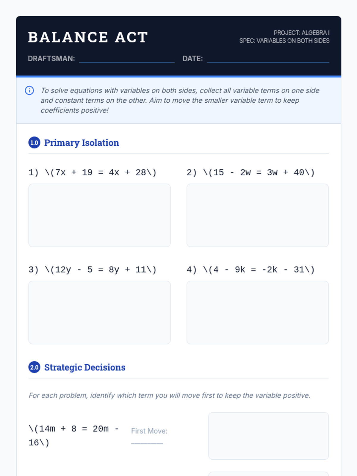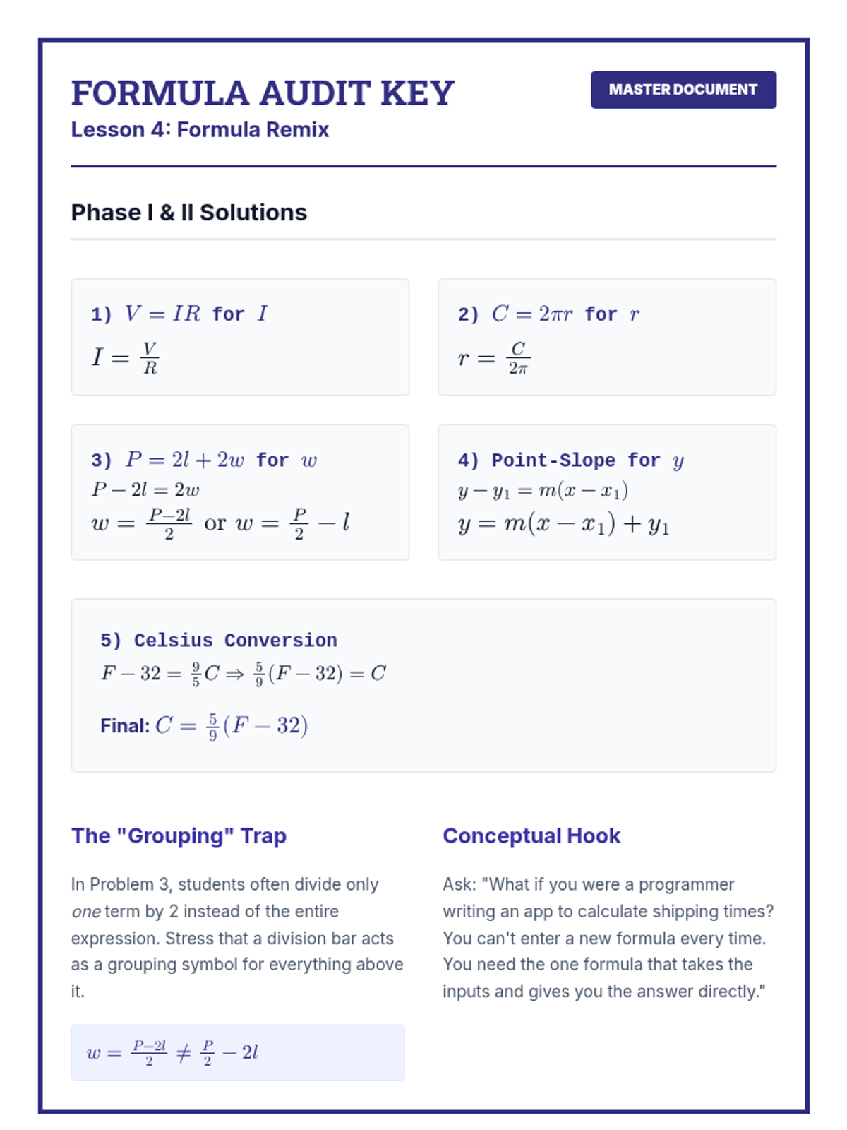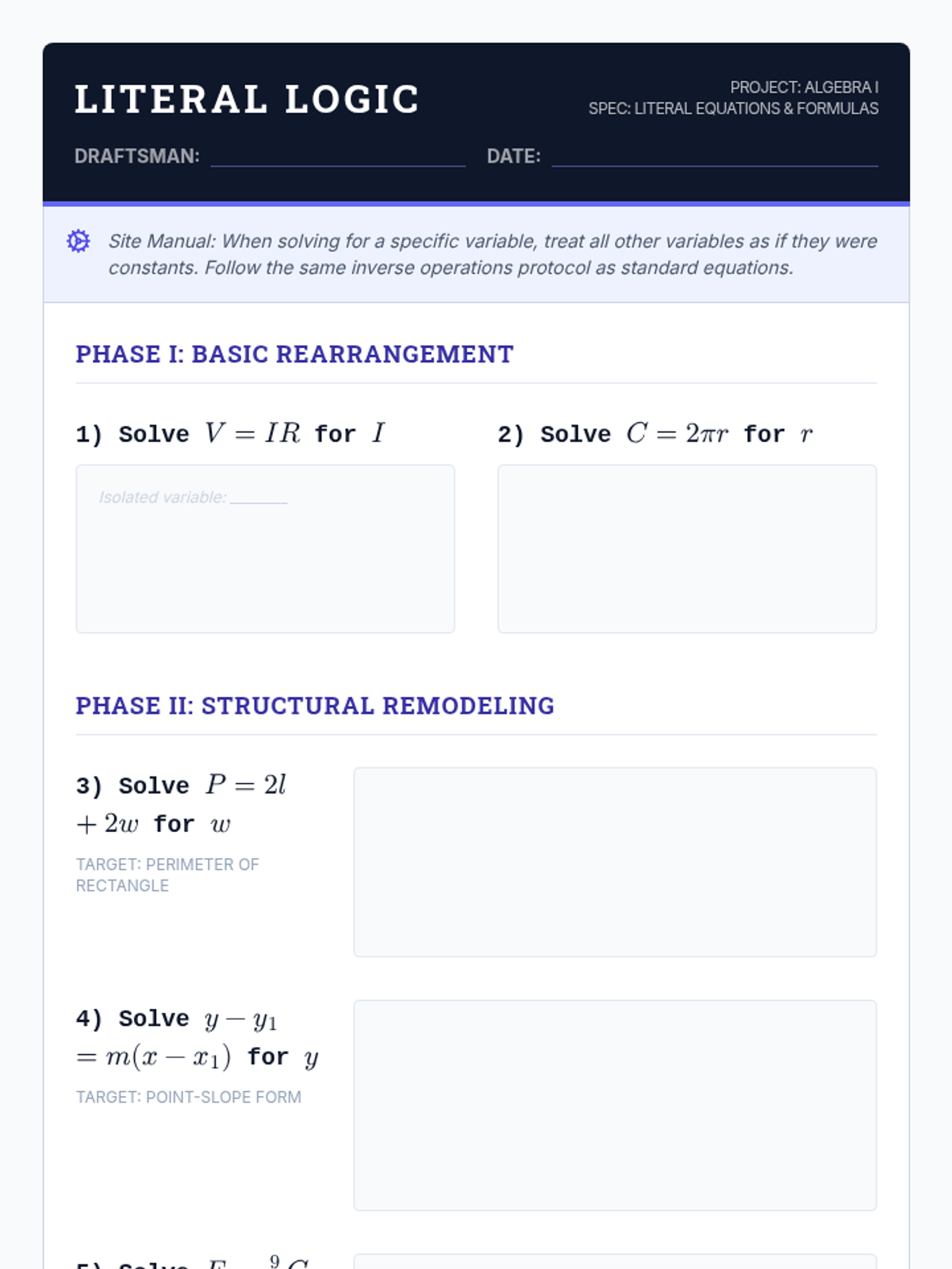 A comprehensive 9th Grade Algebra sequence focused on mastering complex linear and literal equations through technical proficiency and real-world modeling. Students progress from standard variable isolation to manipulating abstract scientific formulas and solving multi-step word problems.