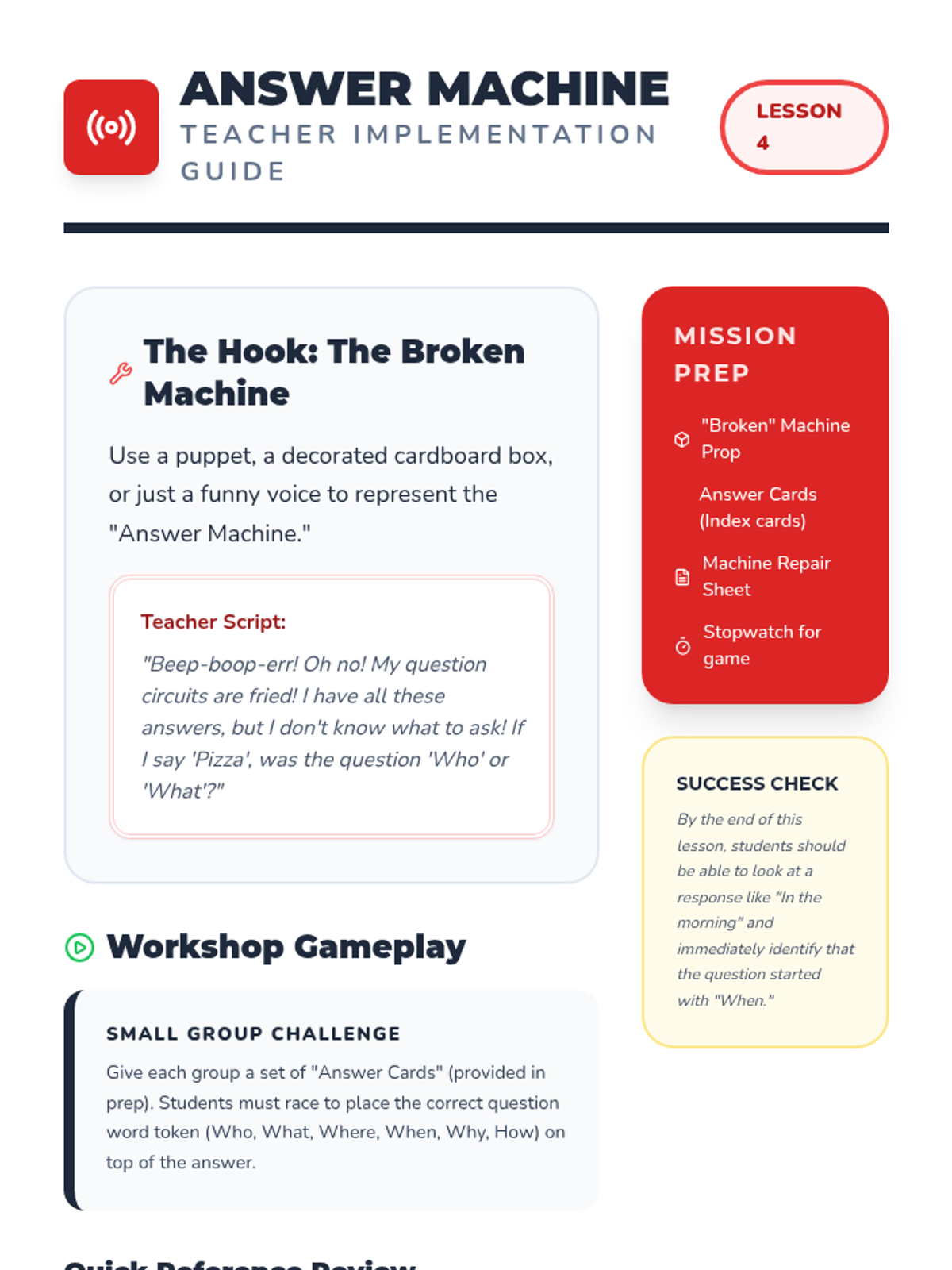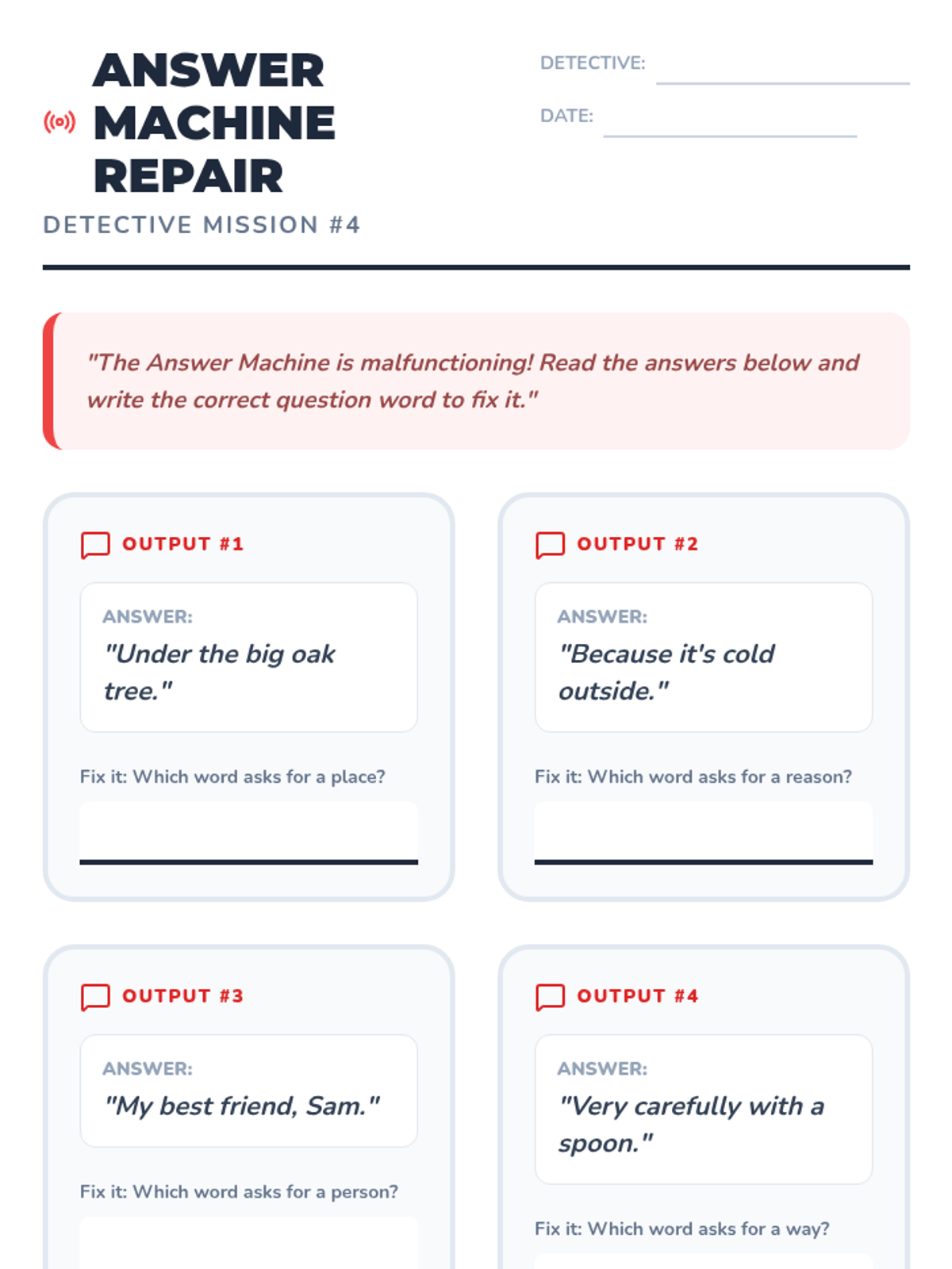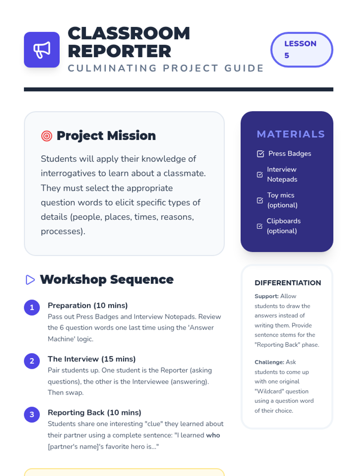 A comprehensive introduction to the six primary question words (who, what, where, when, why, and how) for first-grade students. Through a 'Question Detective' theme, students learn to categorize information, match interrogatives to specific answer types, and conduct peer interviews to gather details.