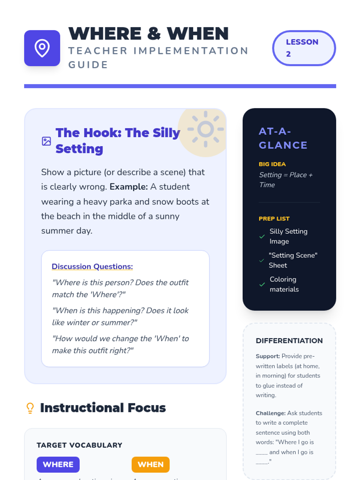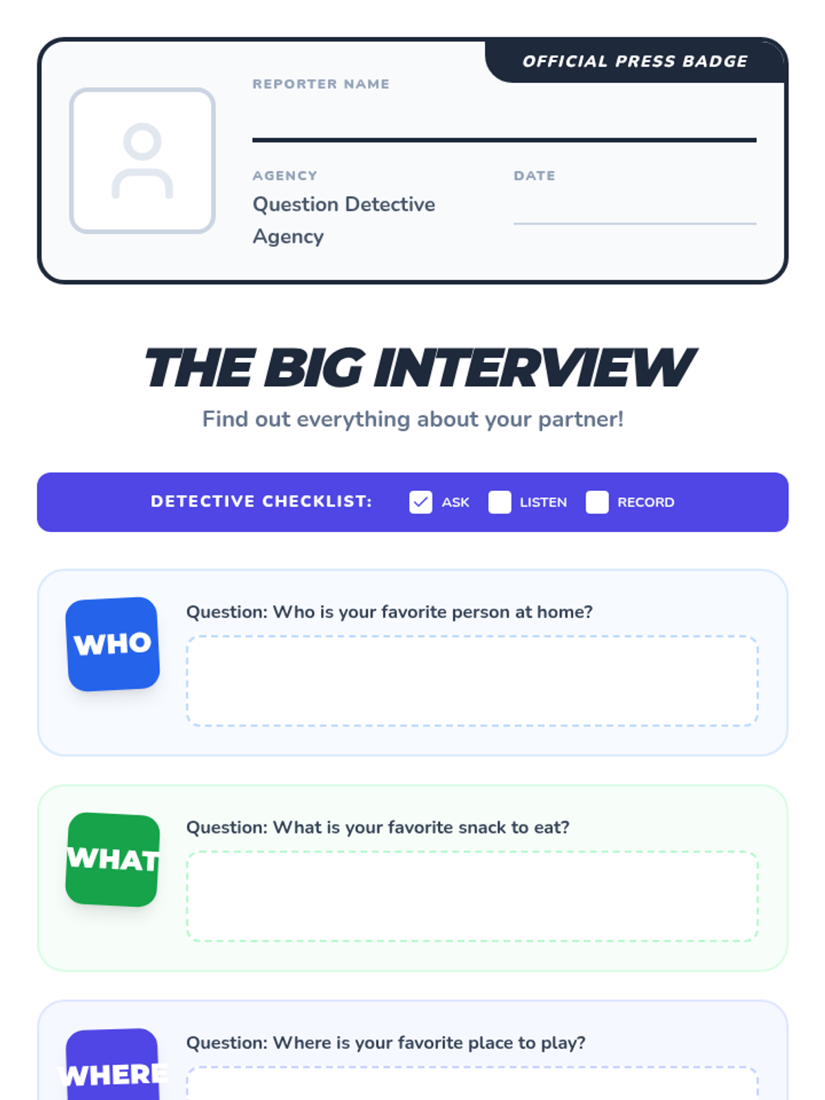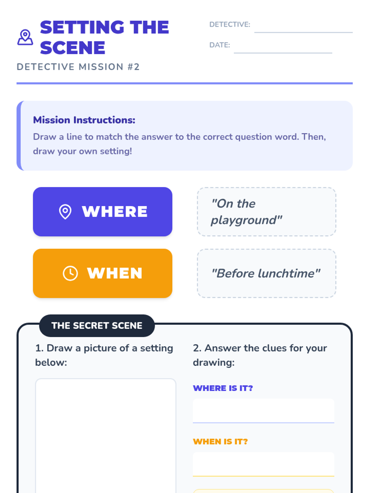 A comprehensive introduction to the six primary question words (who, what, where, when, why, and how) for first-grade students. Through a 'Question Detective' theme, students learn to categorize information, match interrogatives to specific answer types, and conduct peer interviews to gather details.