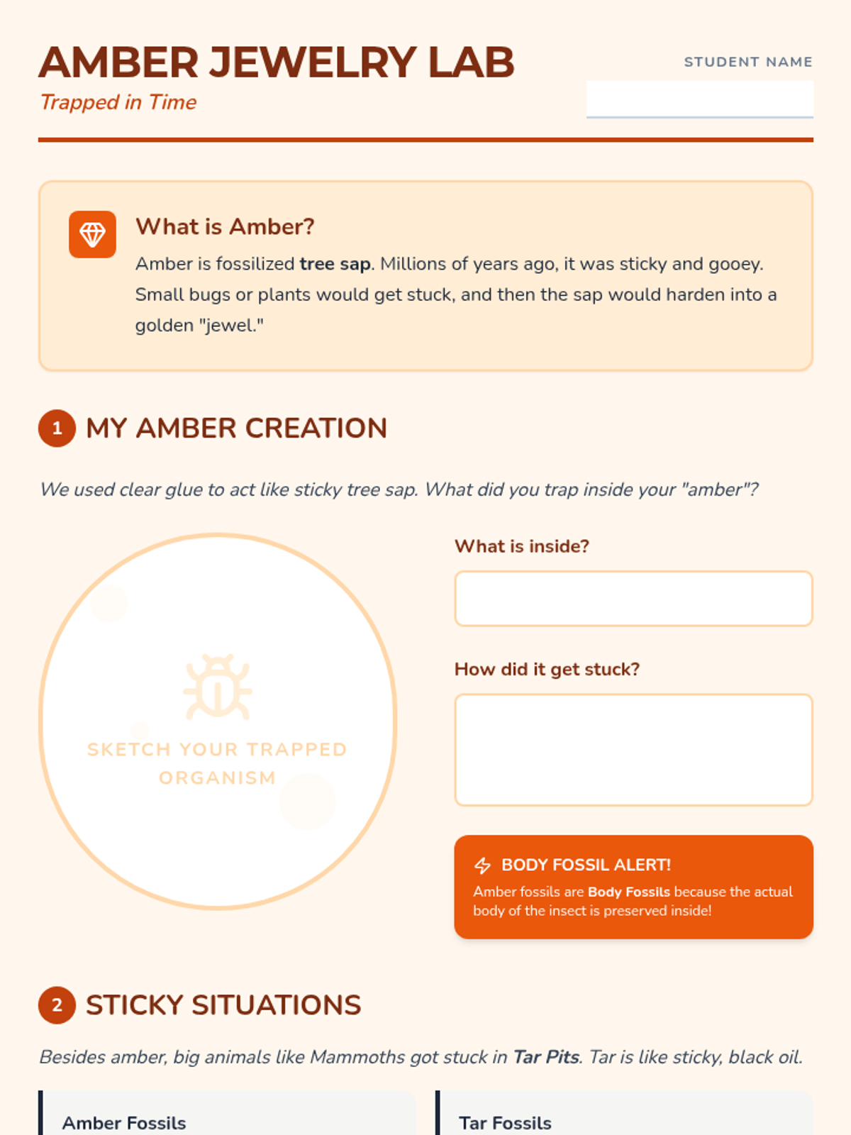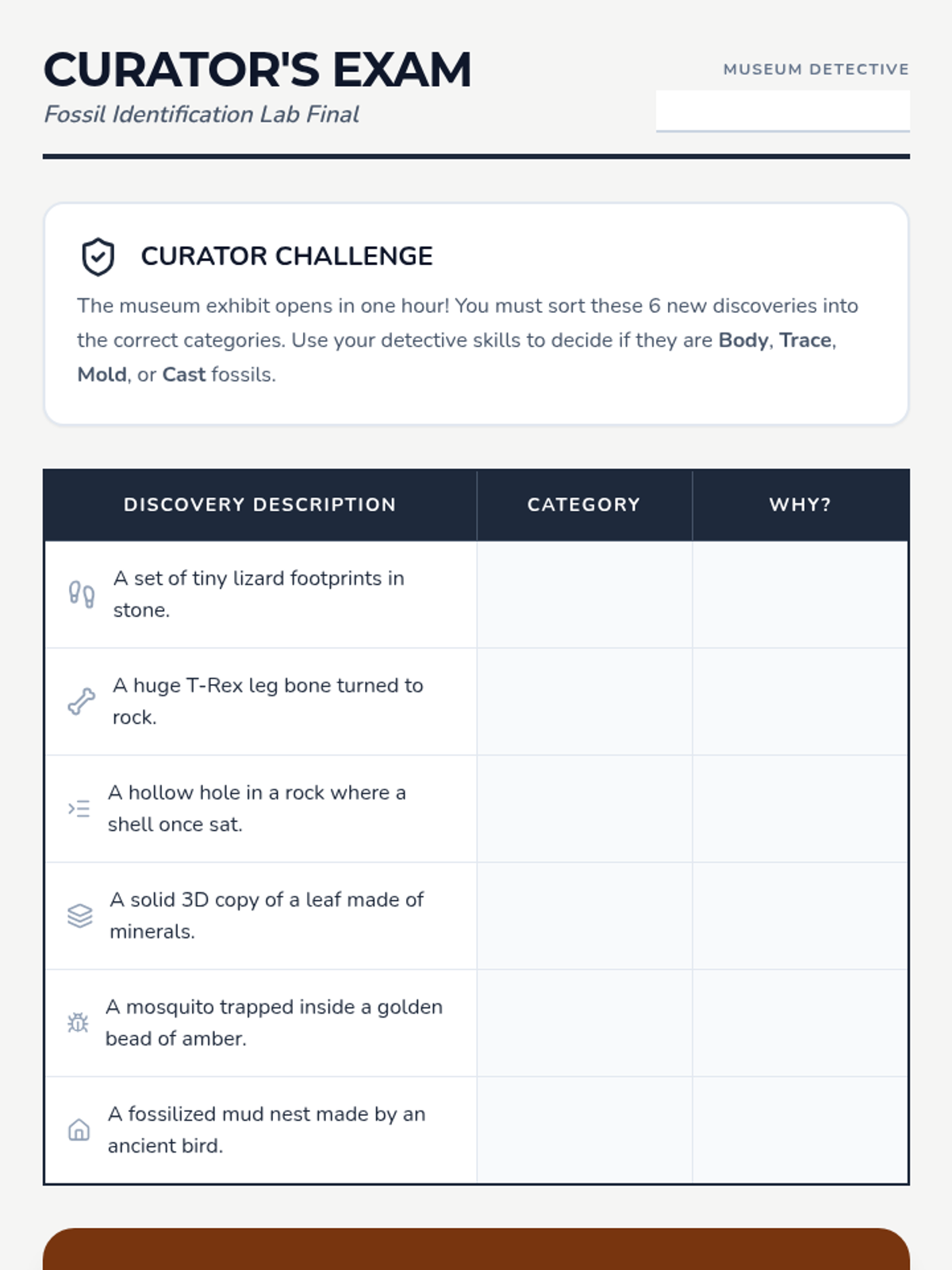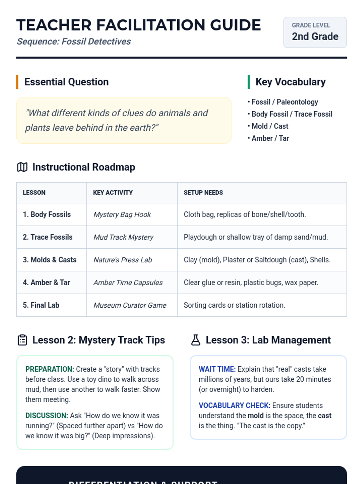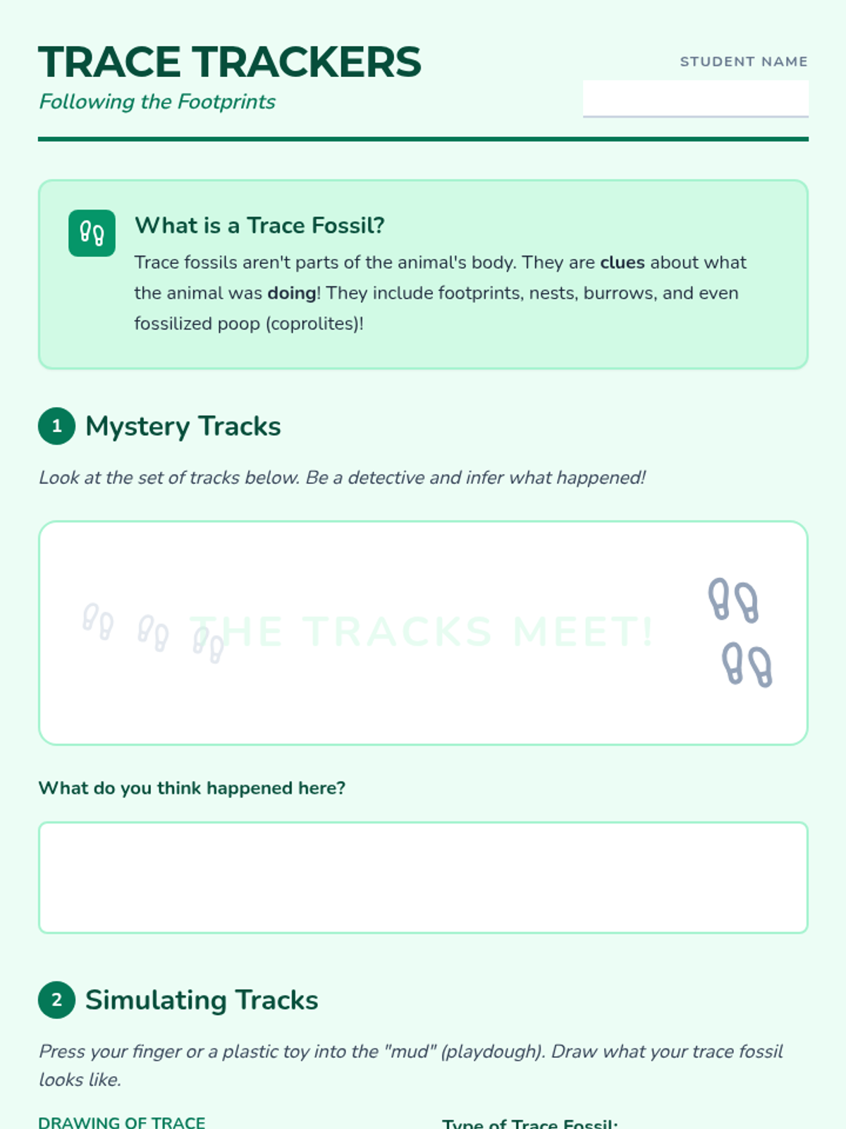 This workshop-style sequence for 2nd grade focuses on categorization and identification of fossils, teaching students to distinguish between body fossils and trace fossils through hands-on crafting and observation.
