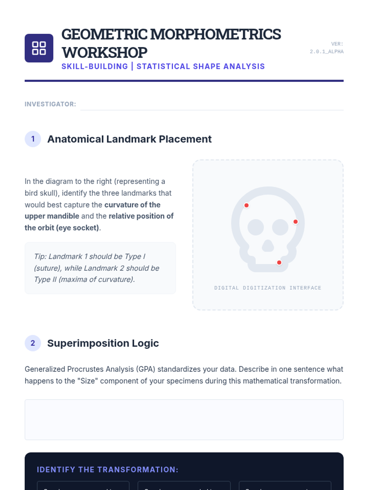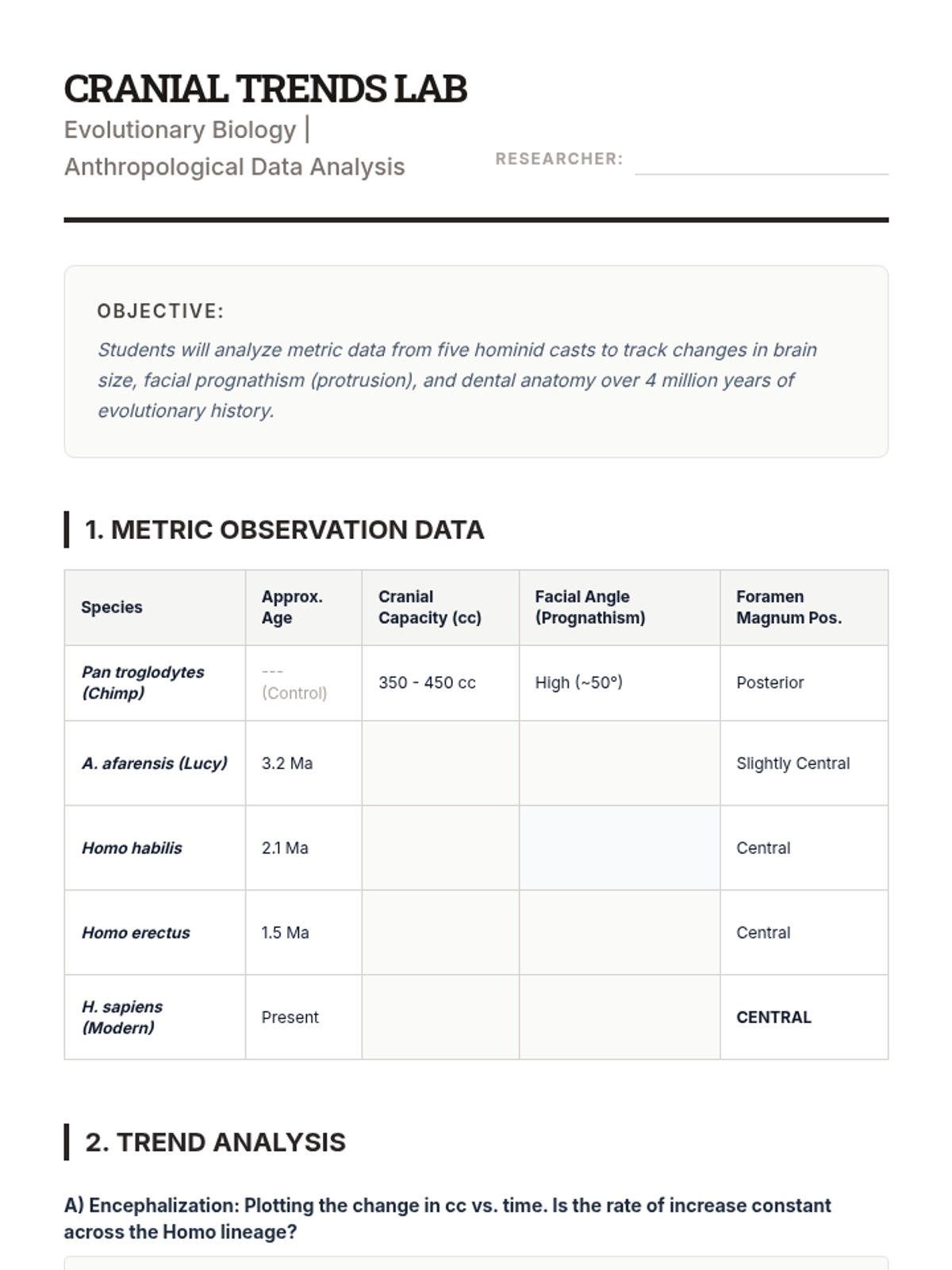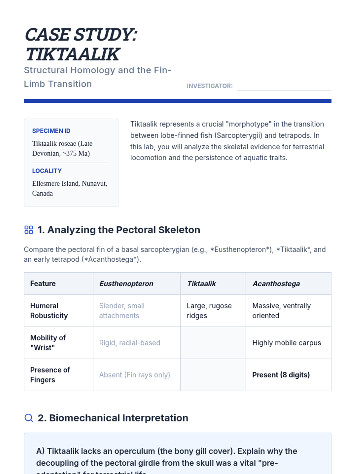 This undergraduate biology sequence explores the fossil record as a quantitative and structural dataset for evolution. Students investigate taphonomic bias, radiometric dating, major morphological transitions (water-to-land, flight), hominid evolution, and advanced morphometric analysis.