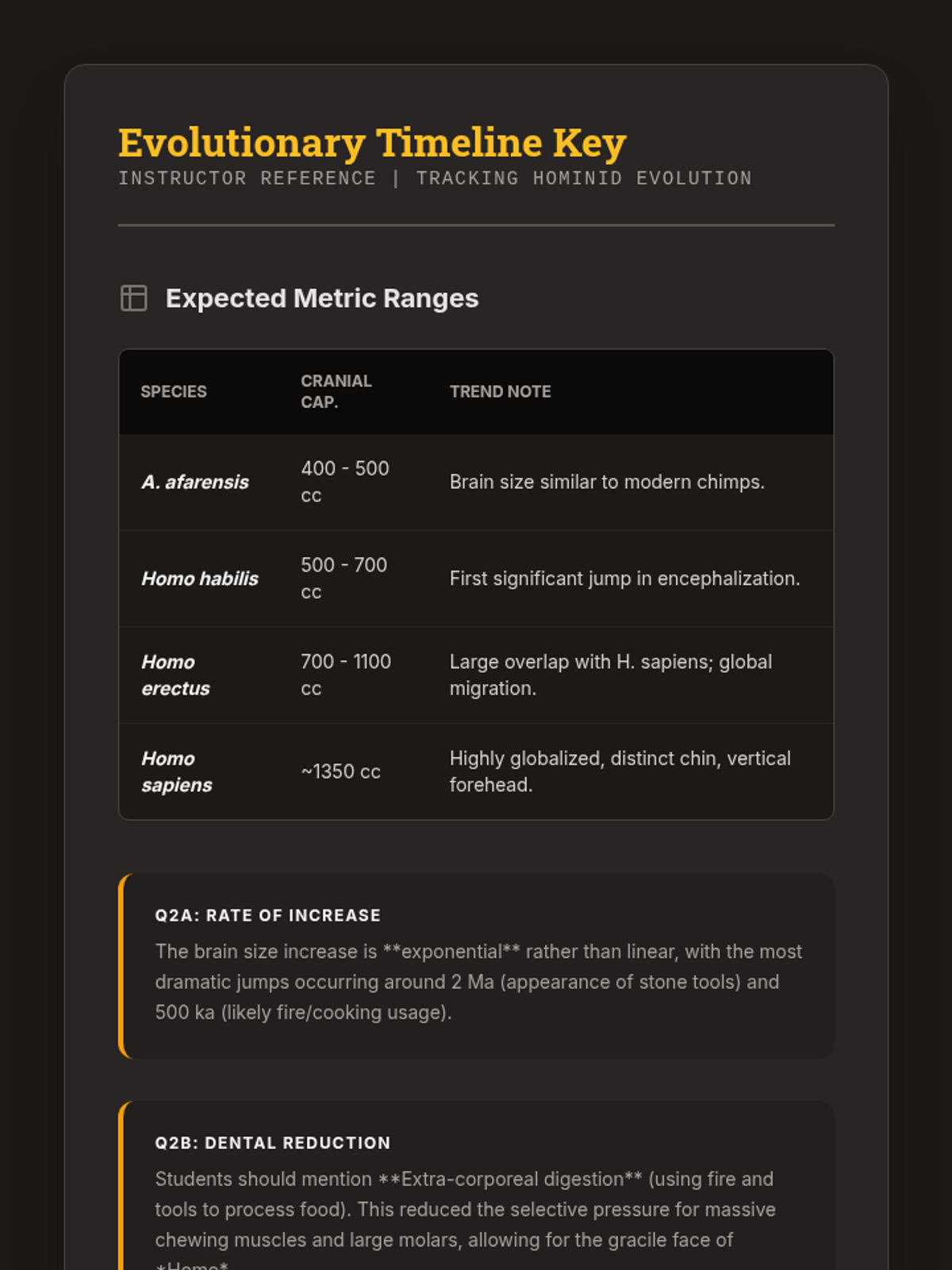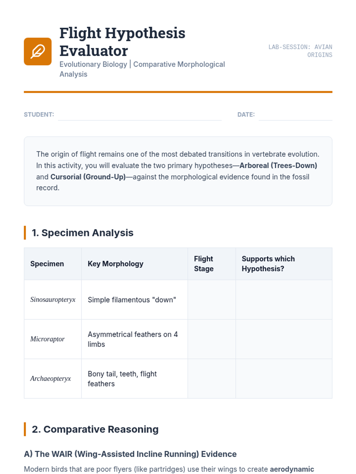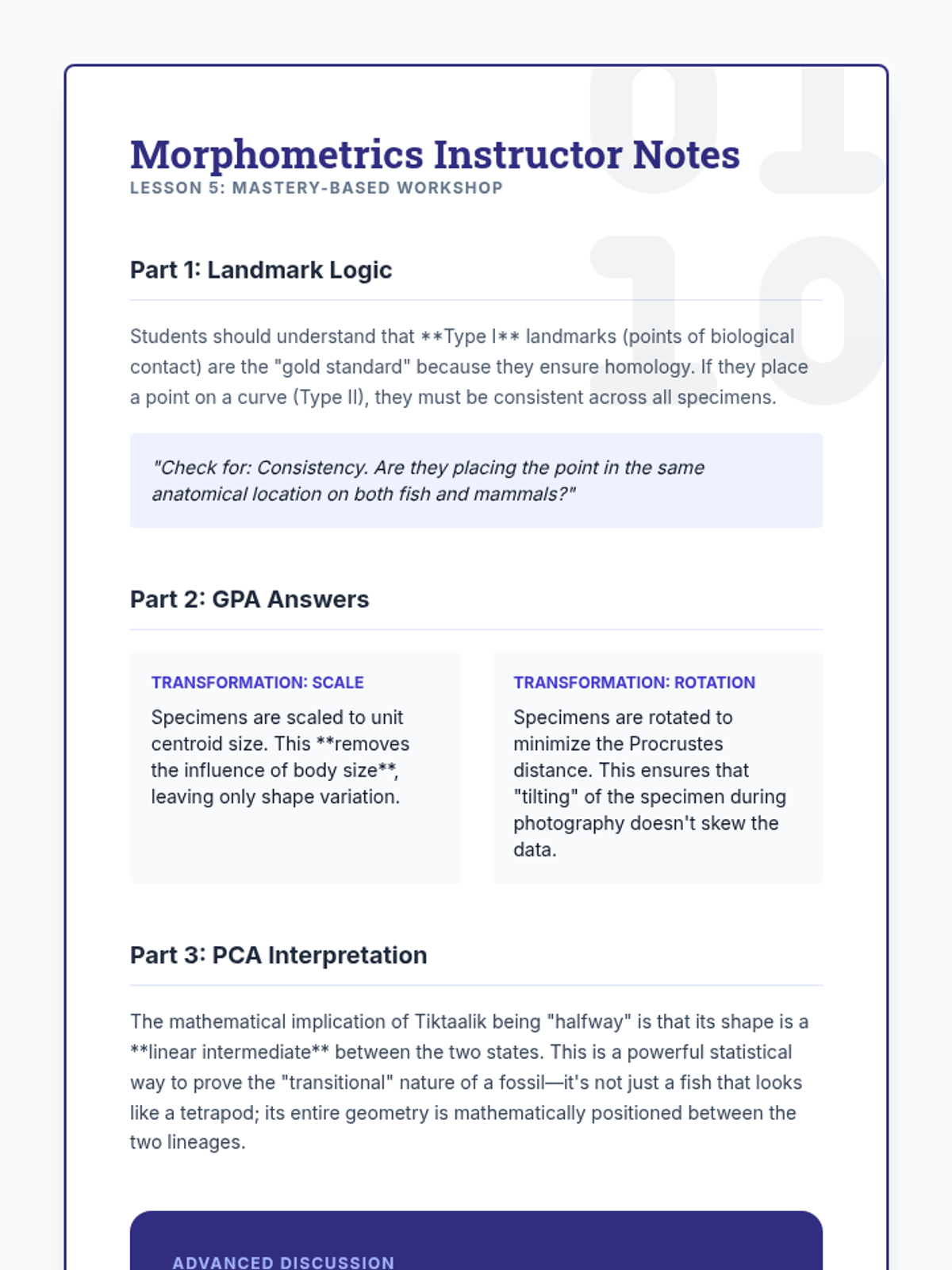 This undergraduate biology sequence explores the fossil record as a quantitative and structural dataset for evolution. Students investigate taphonomic bias, radiometric dating, major morphological transitions (water-to-land, flight), hominid evolution, and advanced morphometric analysis.