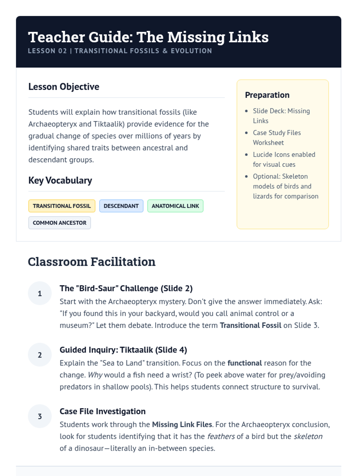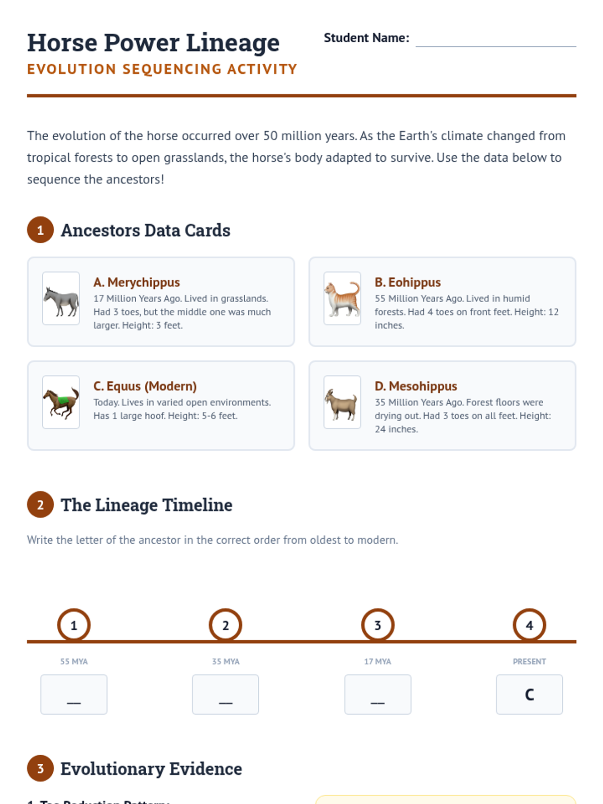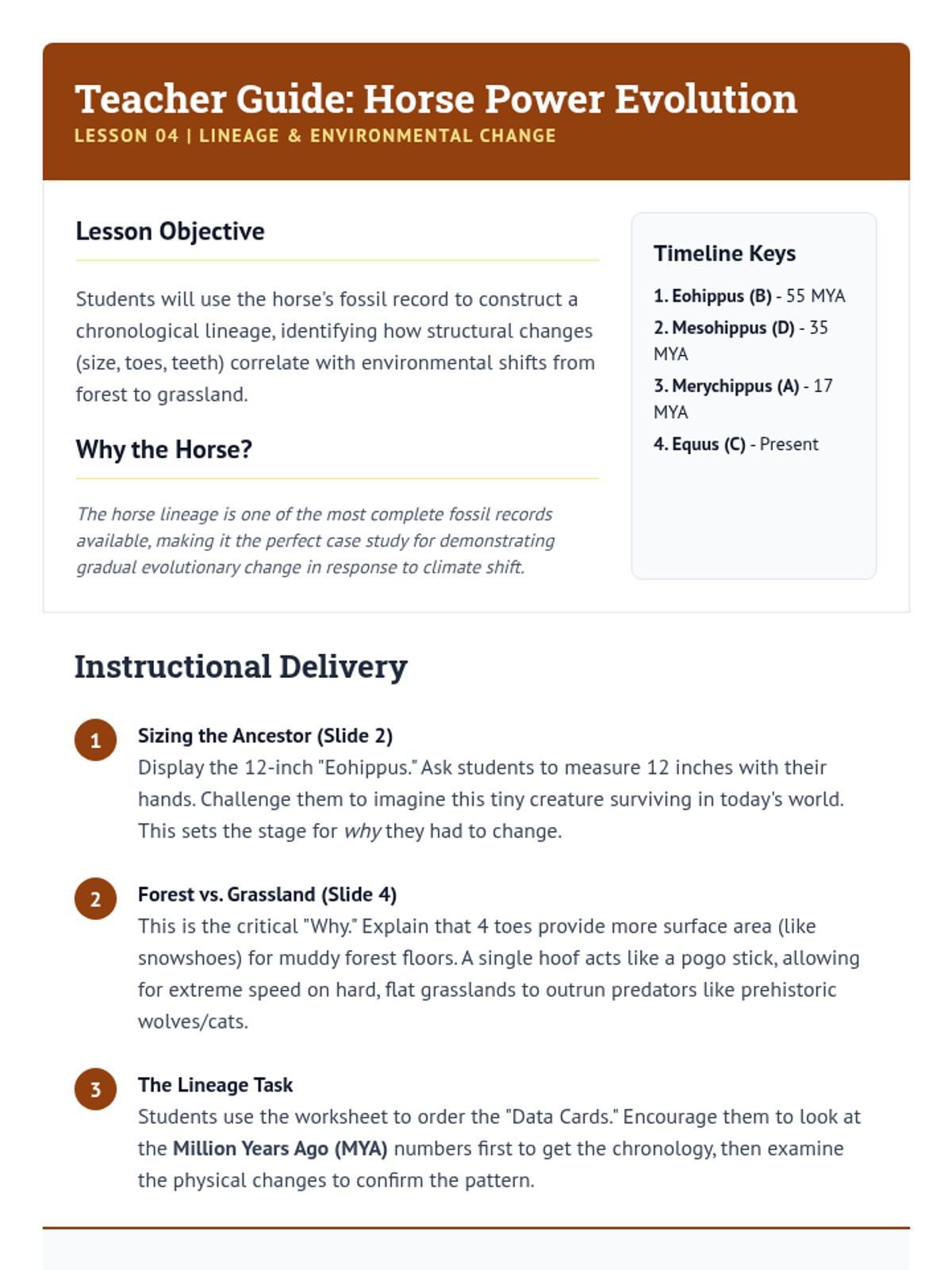 This sequence investigates biological change over vast periods by examining the fossil record for evidence of evolution and extinction. Students compare ancient organisms with modern counterparts, study transitional fossils, analyze mass extinctions, and trace the evolutionary lineage of specific species.