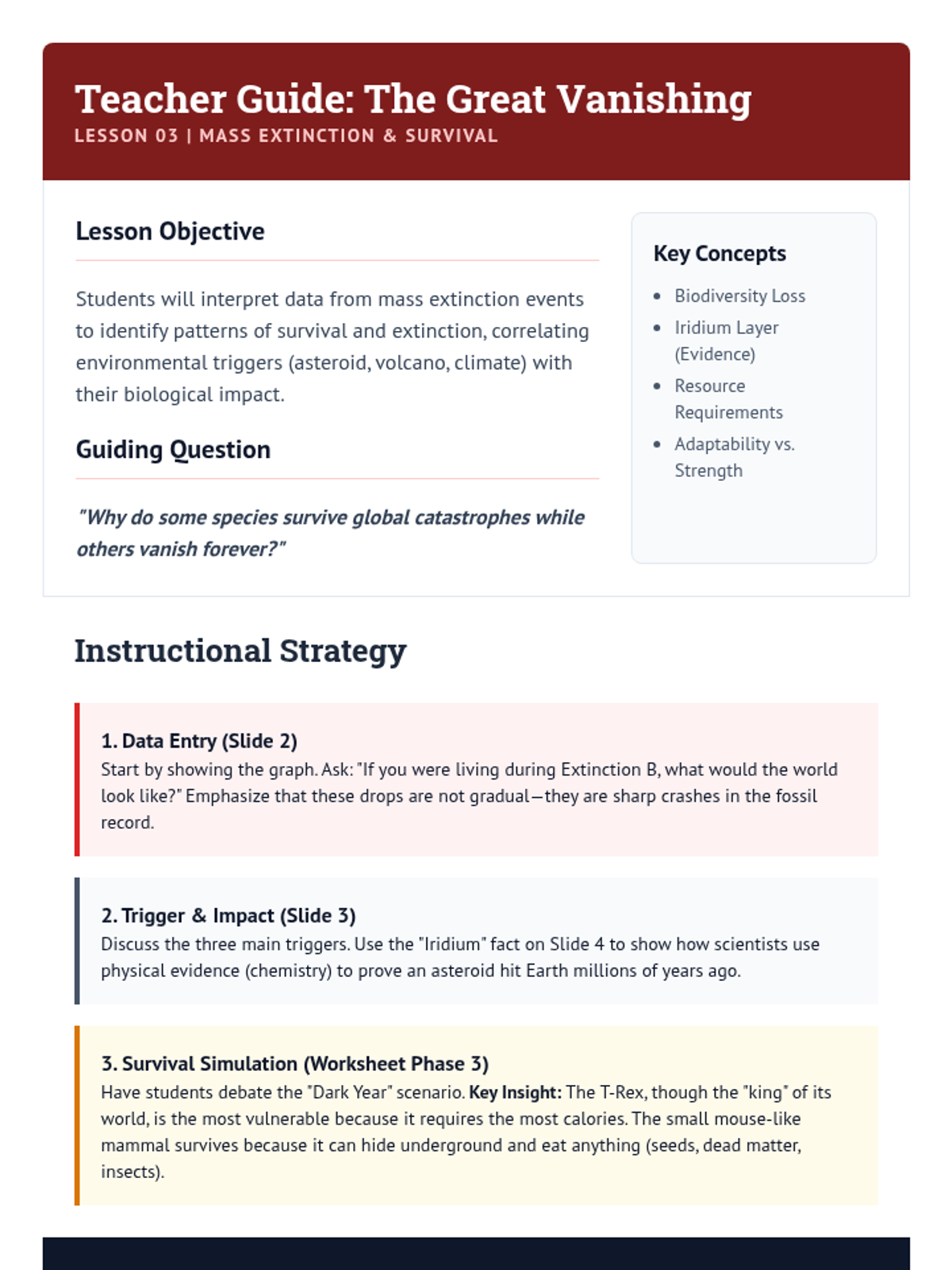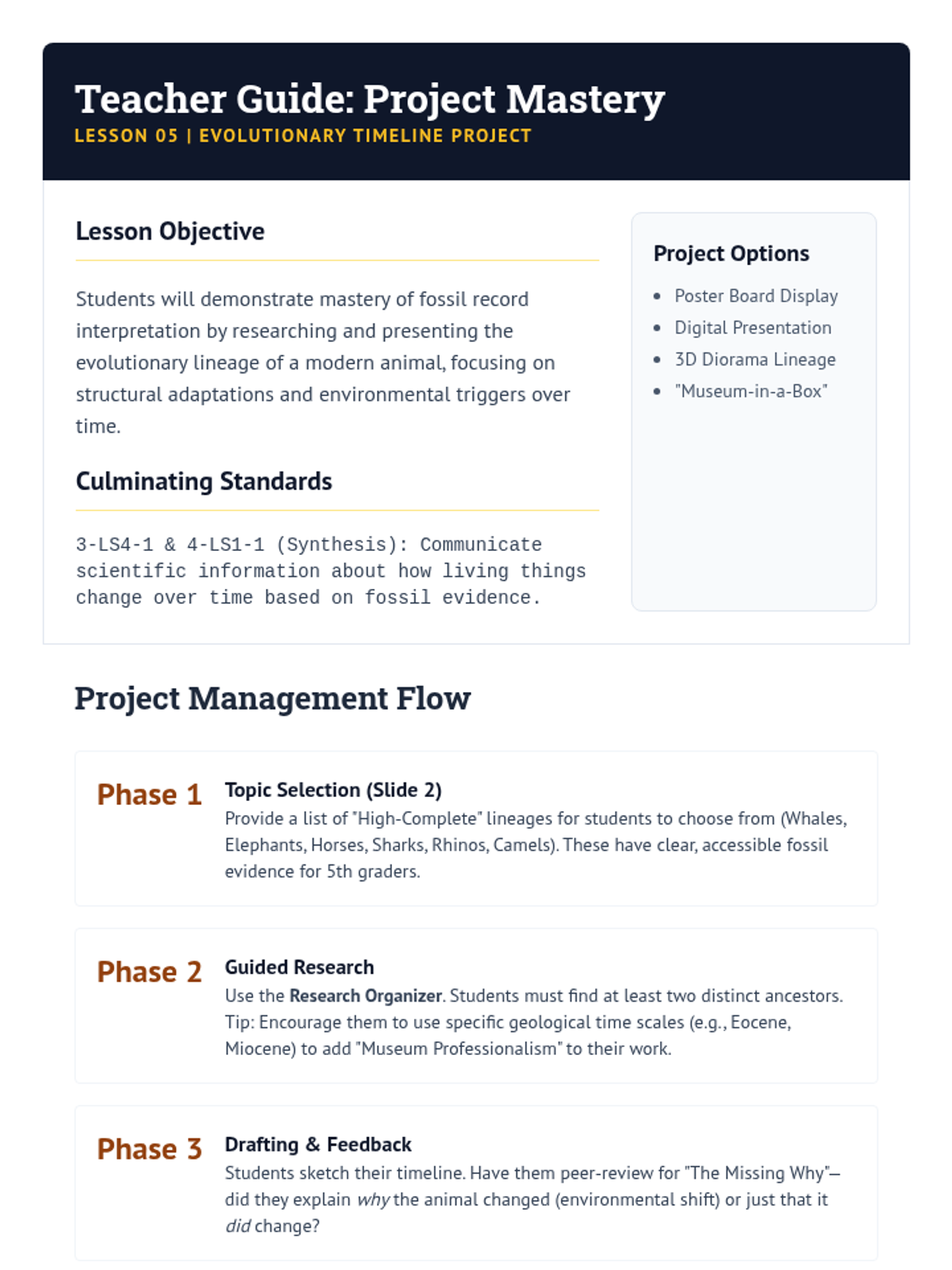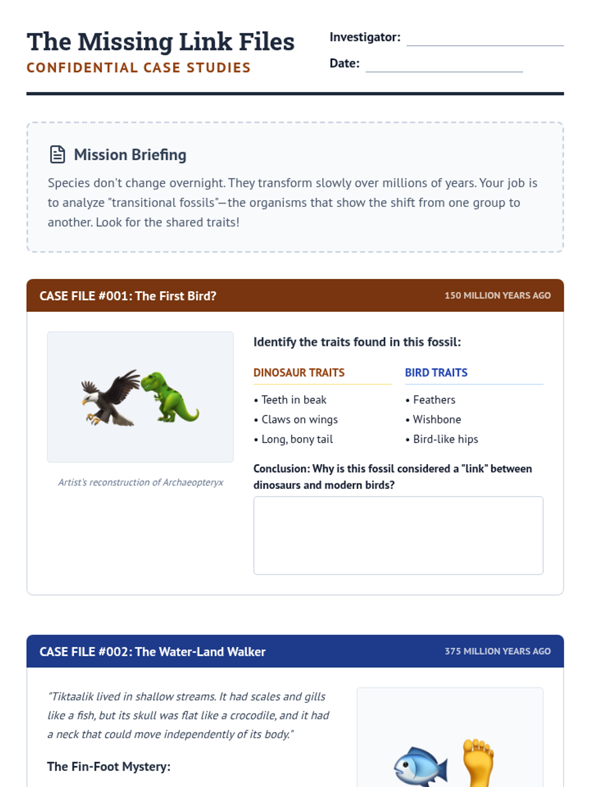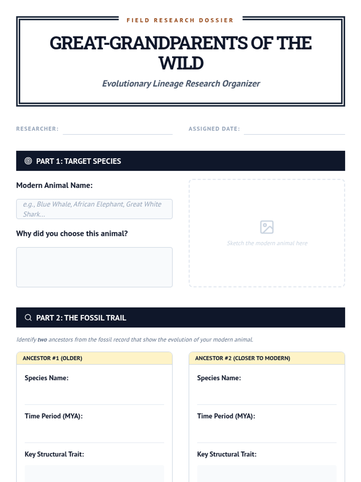 This sequence investigates biological change over vast periods by examining the fossil record for evidence of evolution and extinction. Students compare ancient organisms with modern counterparts, study transitional fossils, analyze mass extinctions, and trace the evolutionary lineage of specific species.