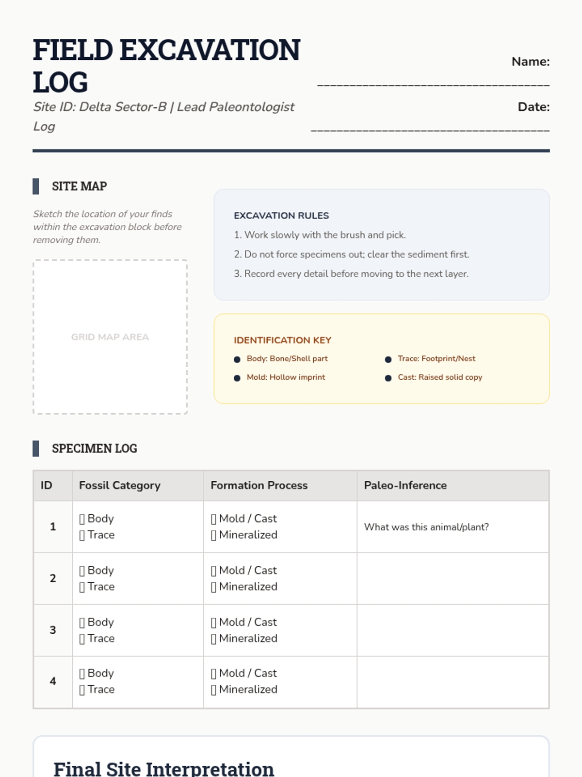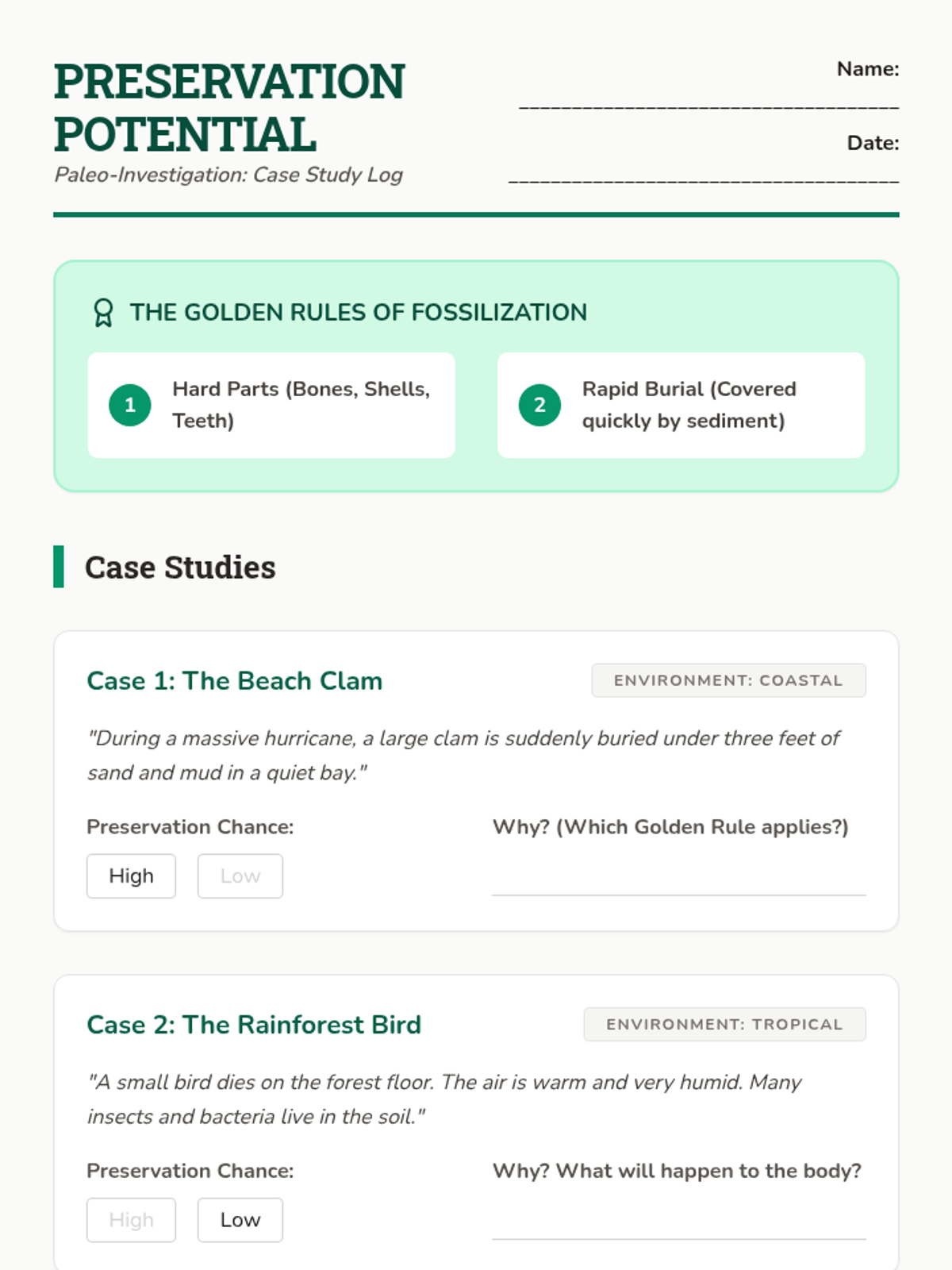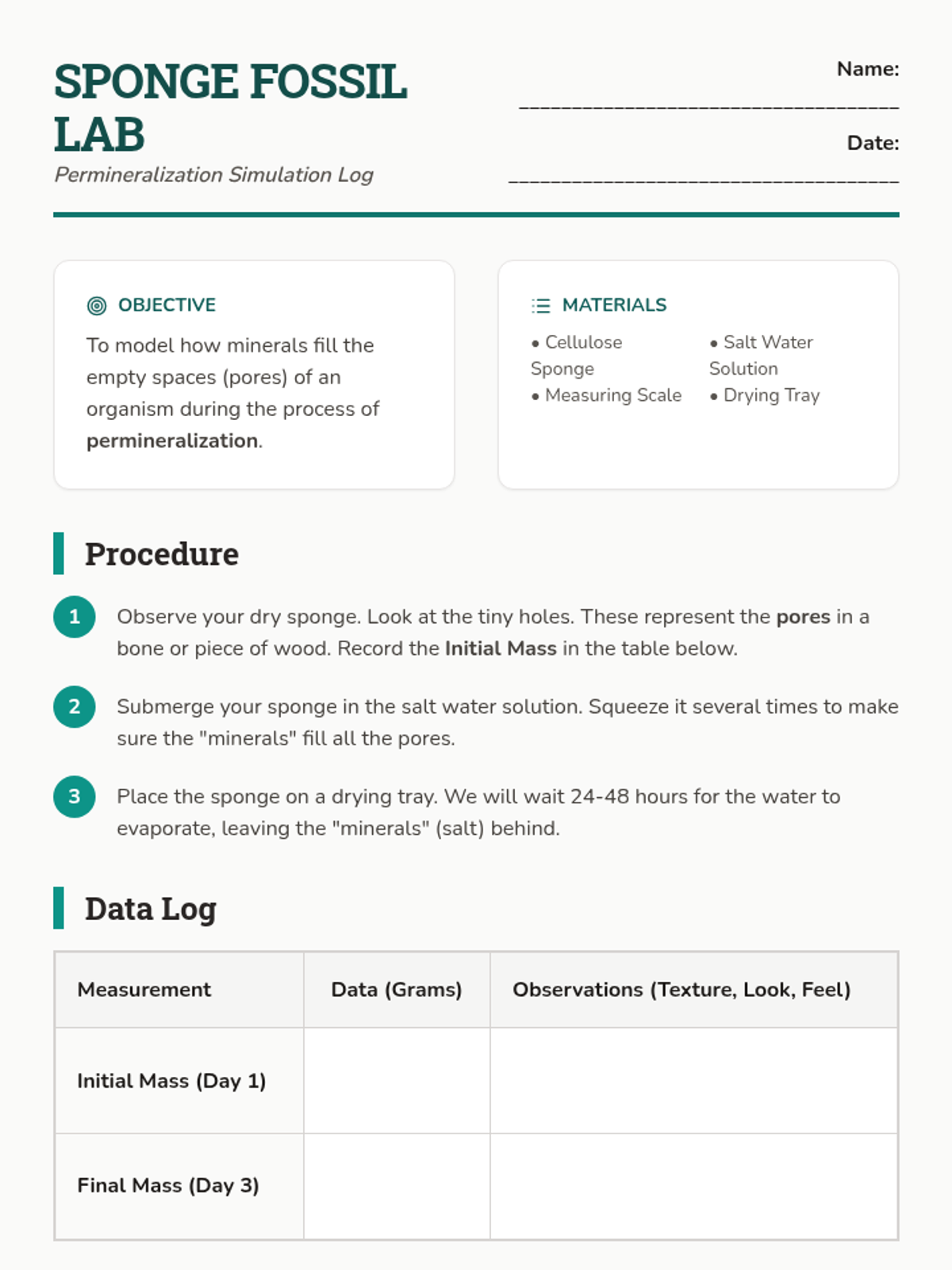 This sequence guides 5th-grade students through the biochemical and physical processes of fossilization, from distinguishing types to simulating mineral replacement and environmental preservation.