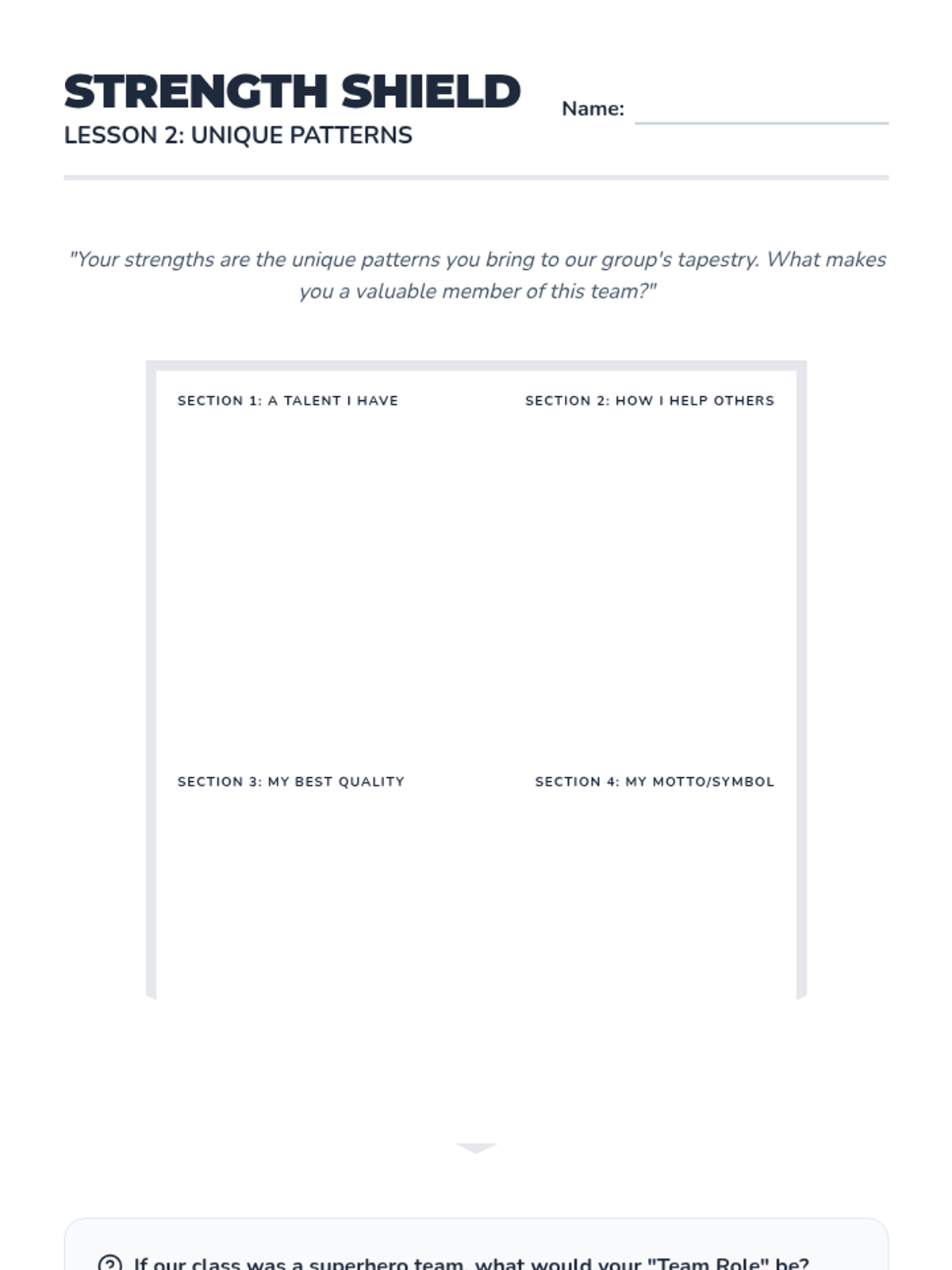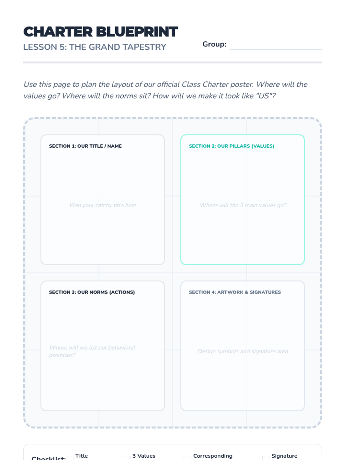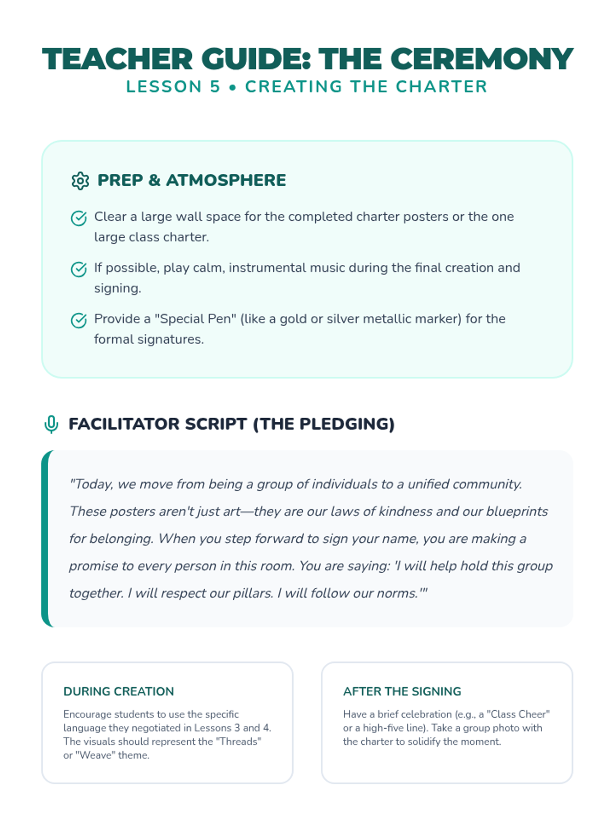 A 5th-grade counseling sequence focused on building a collective group identity. Students explore commonalities, individual strengths, and shared values to co-create a binding Class Charter that fosters a sense of belonging and mutual respect.
