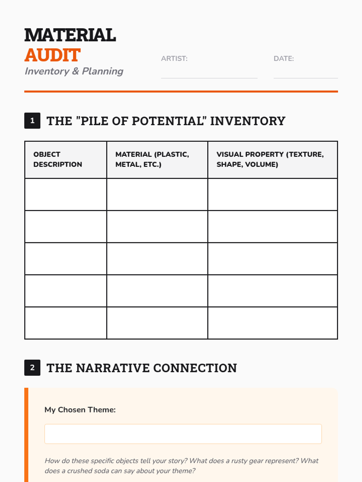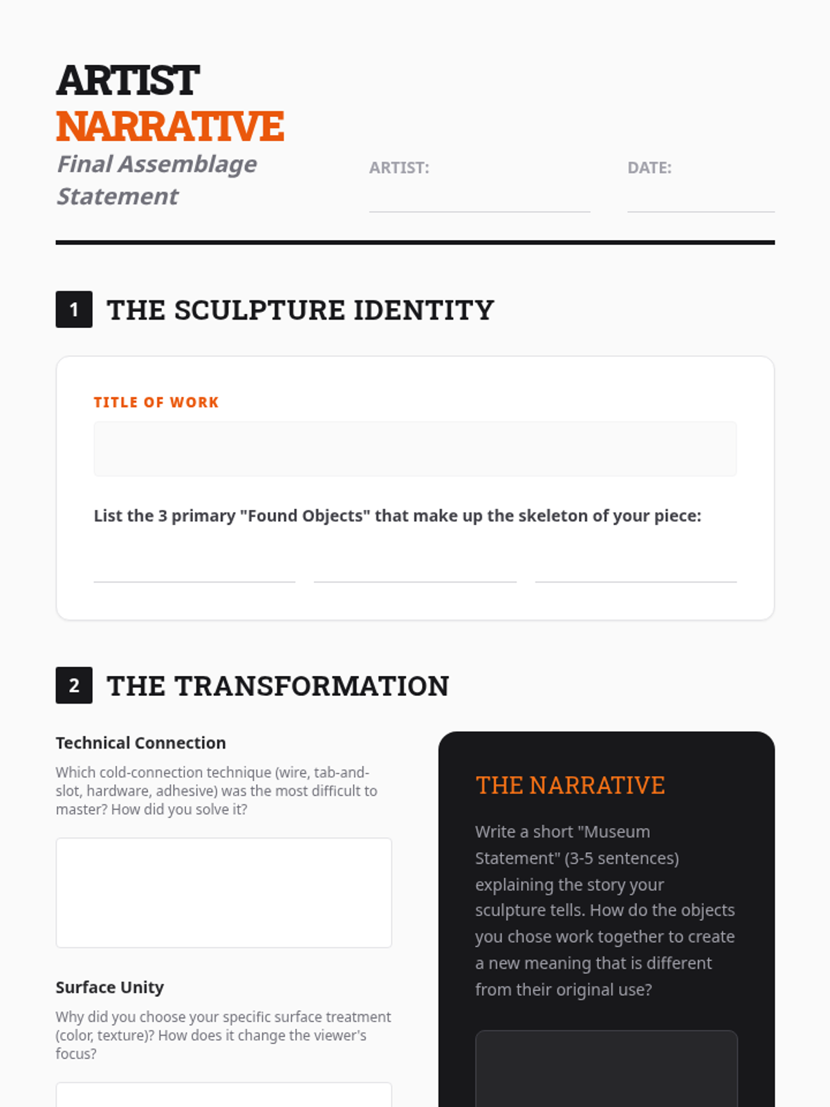 A 5-lesson unit for 7th-grade art students focusing on the transformation of everyday objects into sculptural narratives through assemblage. Students explore art history, material properties, cold-connection techniques, and 3D composition.
