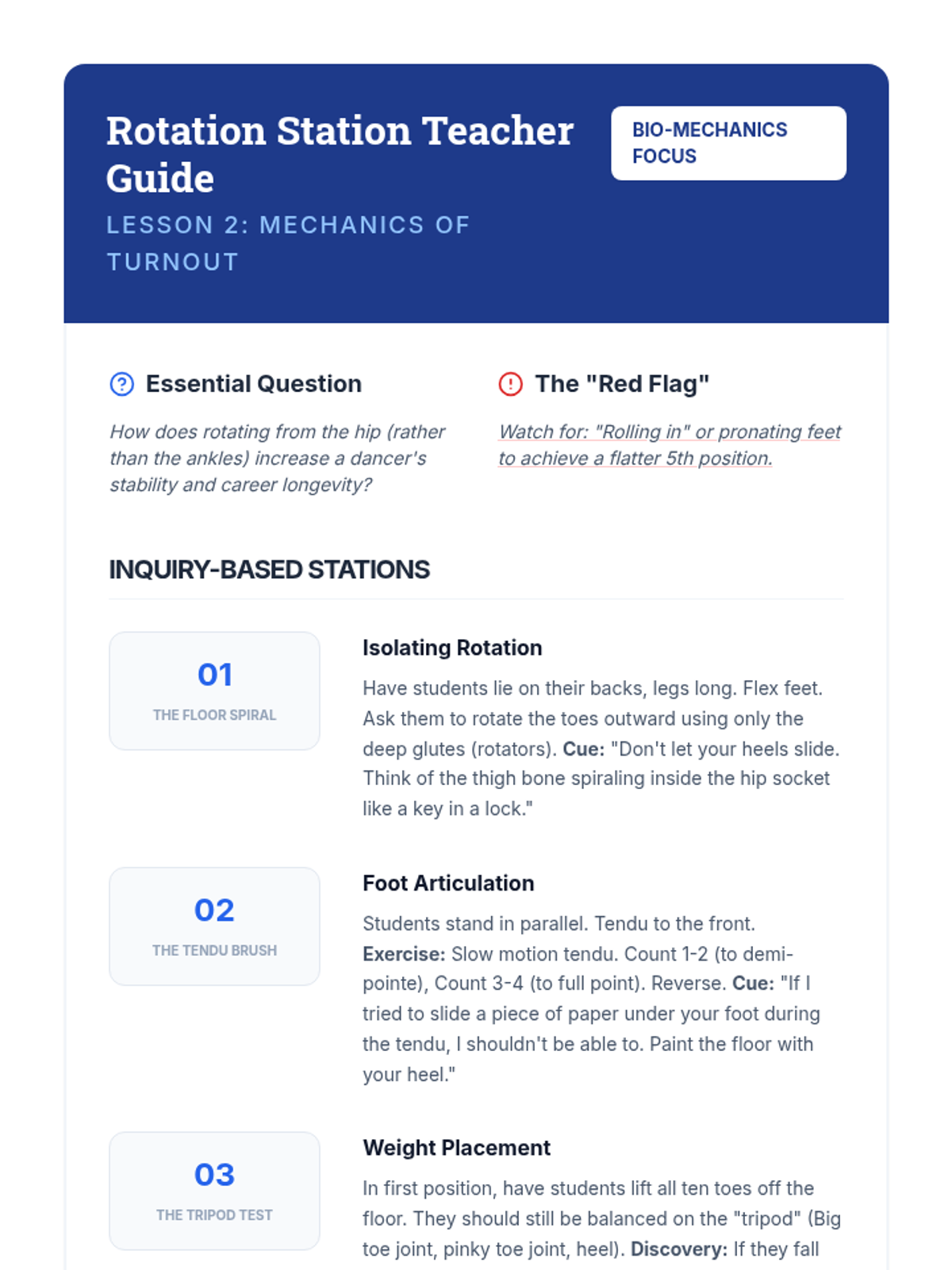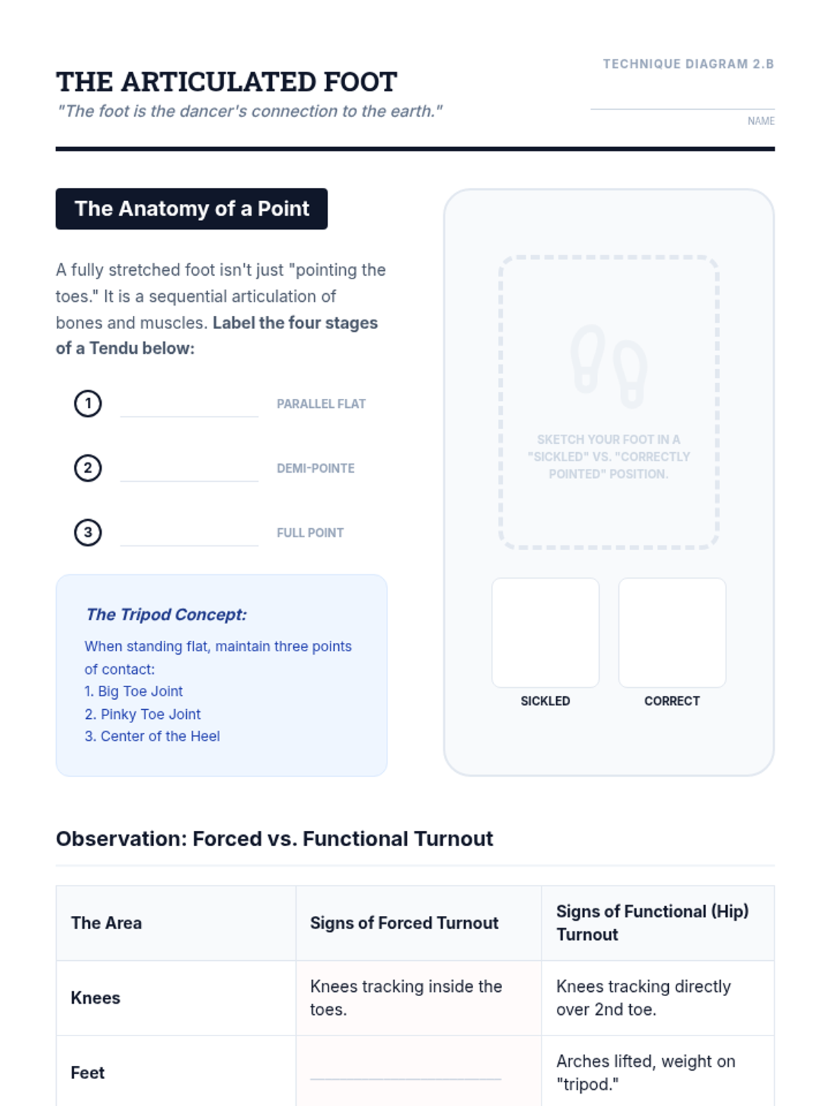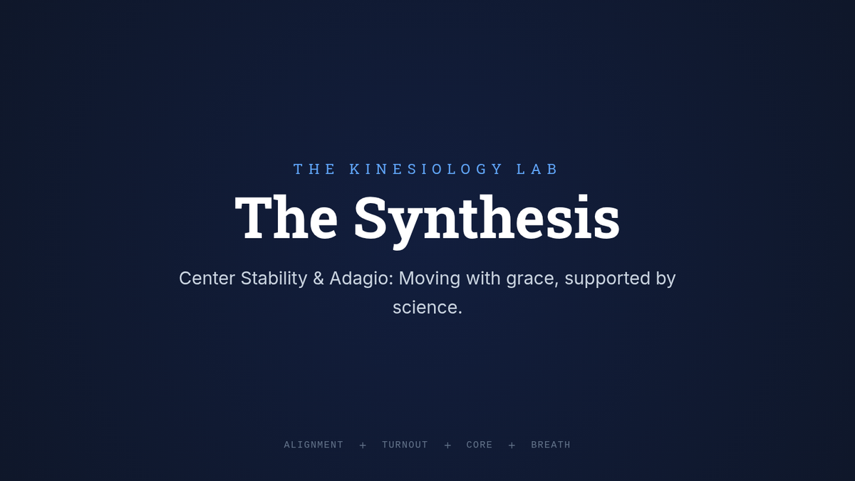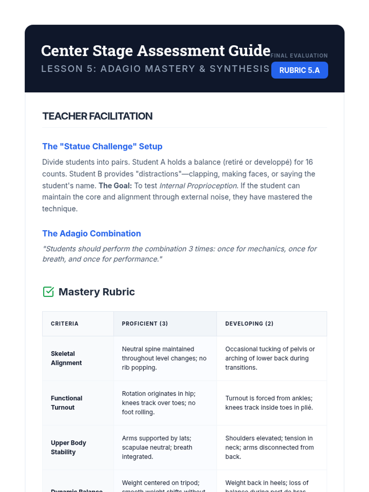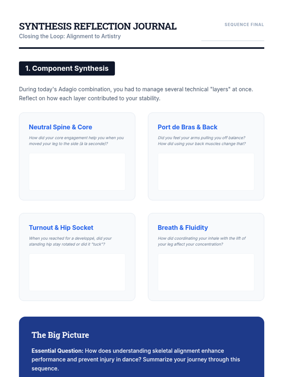 This sequence bridges biomechanics and classical ballet, teaching 8th-grade dancers how skeletal alignment and core stability serve as the foundation for movement efficiency and injury prevention. Students progress from floor-based alignment checks to complex center adagio, deconstructing the physics of turnout, foot articulation, and vertical balance.