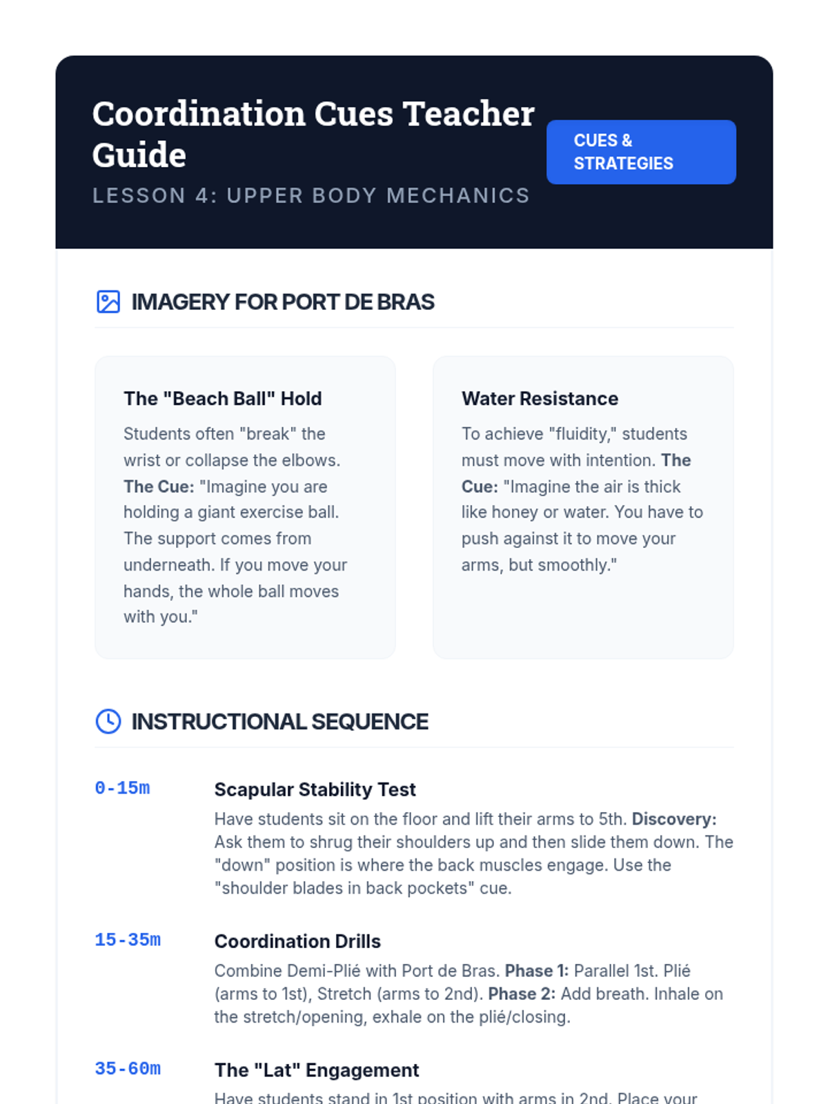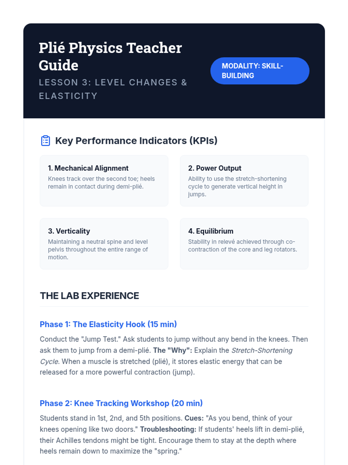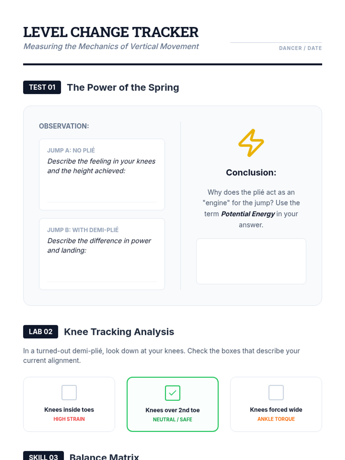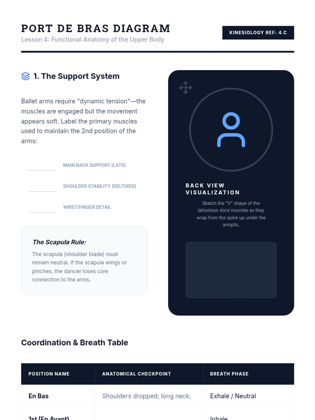 This sequence bridges biomechanics and classical ballet, teaching 8th-grade dancers how skeletal alignment and core stability serve as the foundation for movement efficiency and injury prevention. Students progress from floor-based alignment checks to complex center adagio, deconstructing the physics of turnout, foot articulation, and vertical balance.
