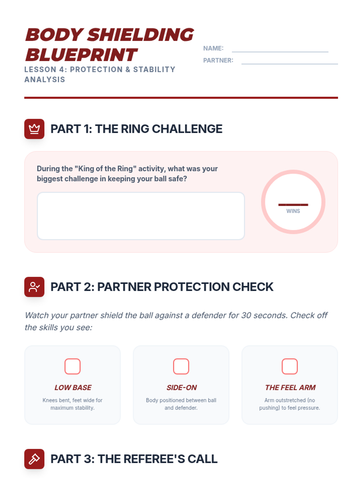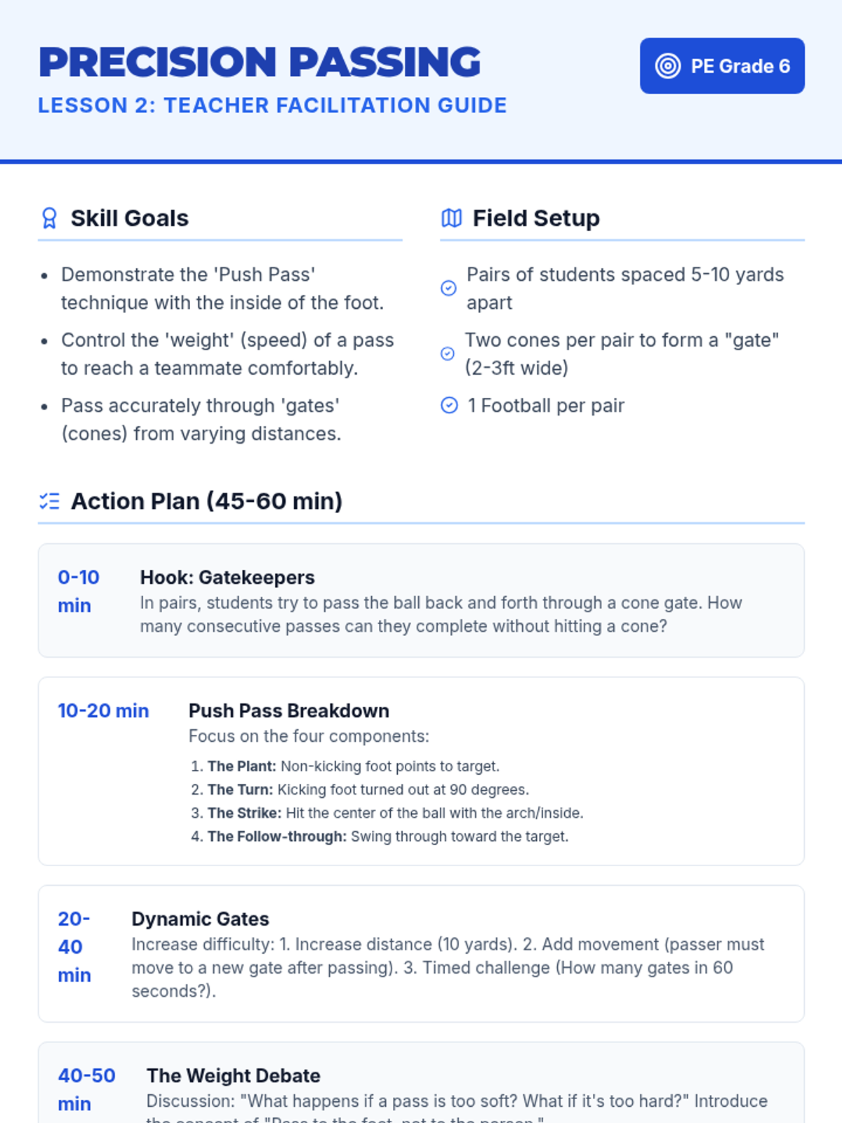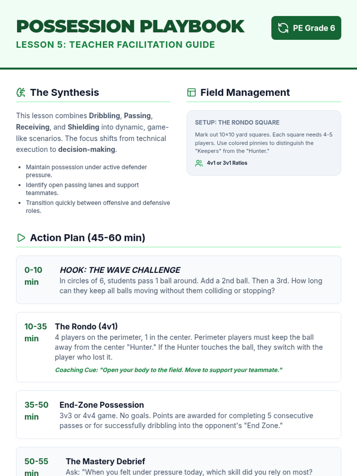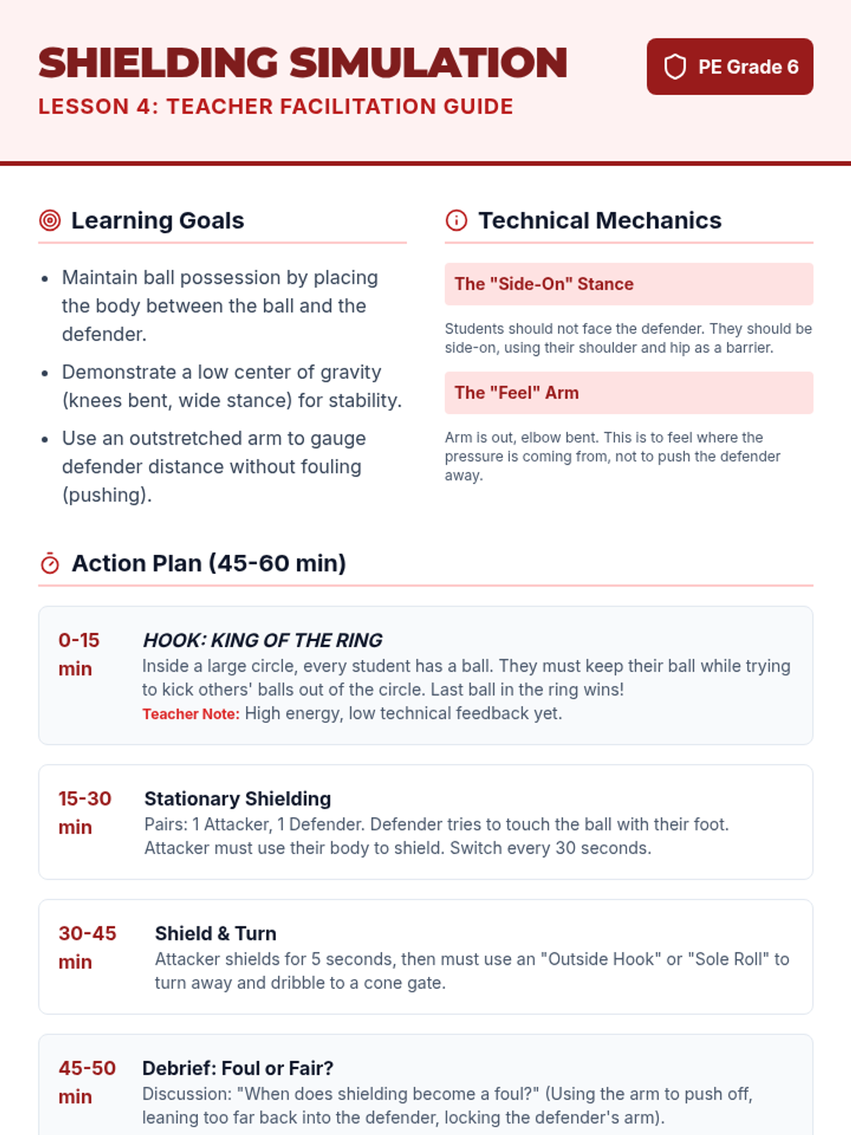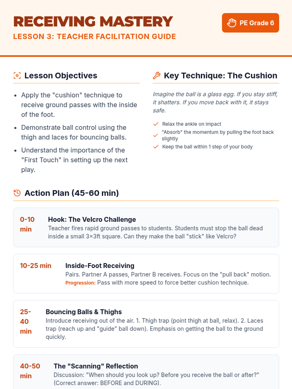 This sequence focuses on the individual technical foundations of football (soccer), progressing from dribbling and passing to receiving, shielding, and dynamic possession. Students develop individual ball mastery to understand how it contributes to team success.