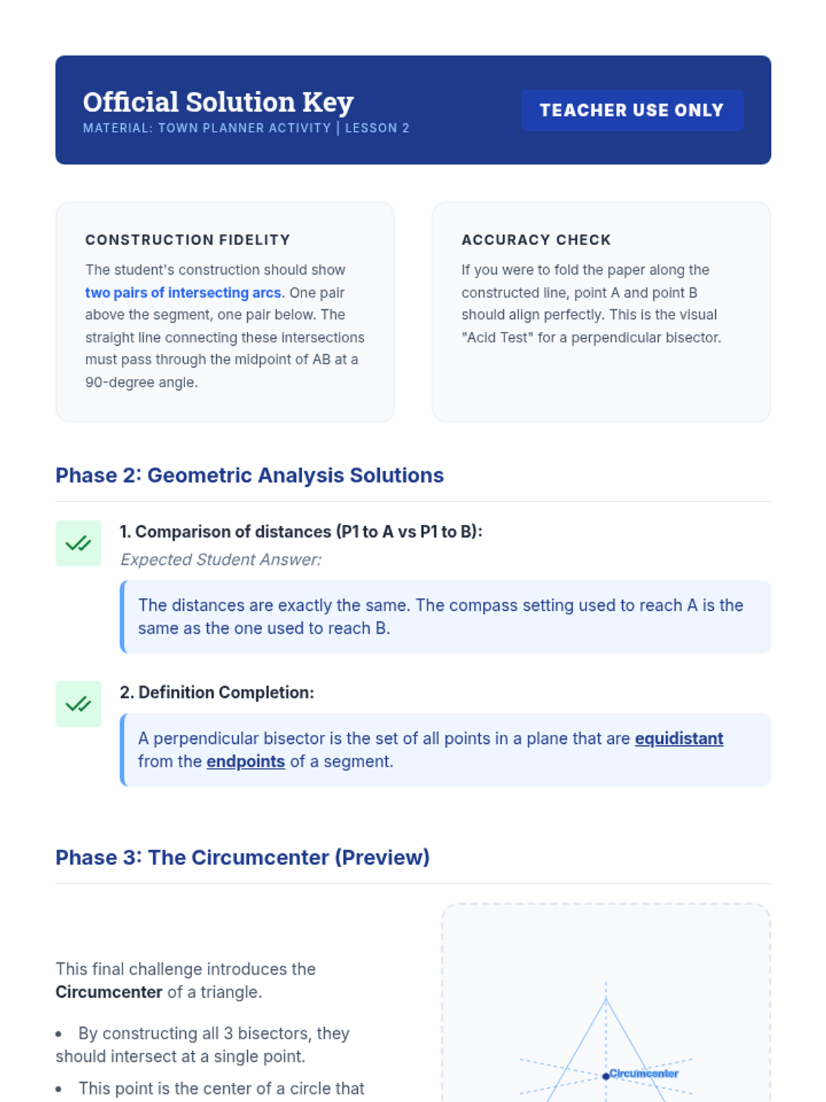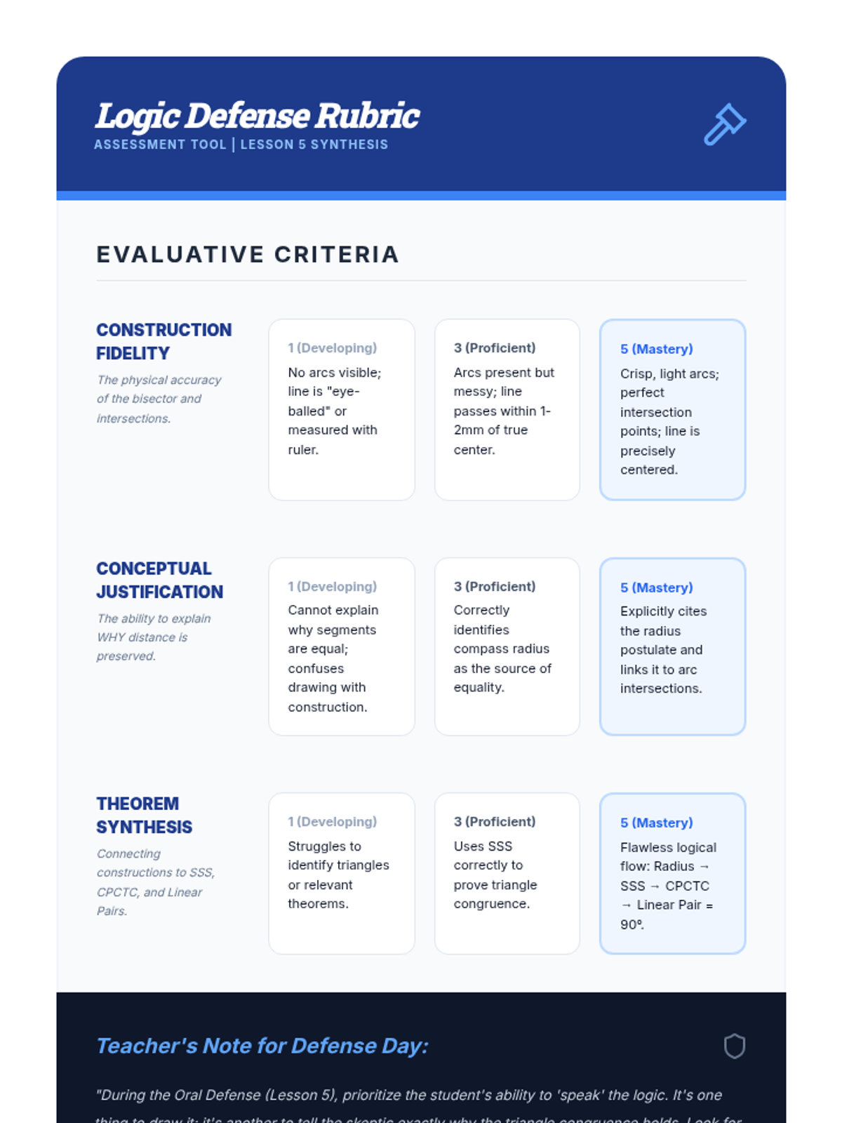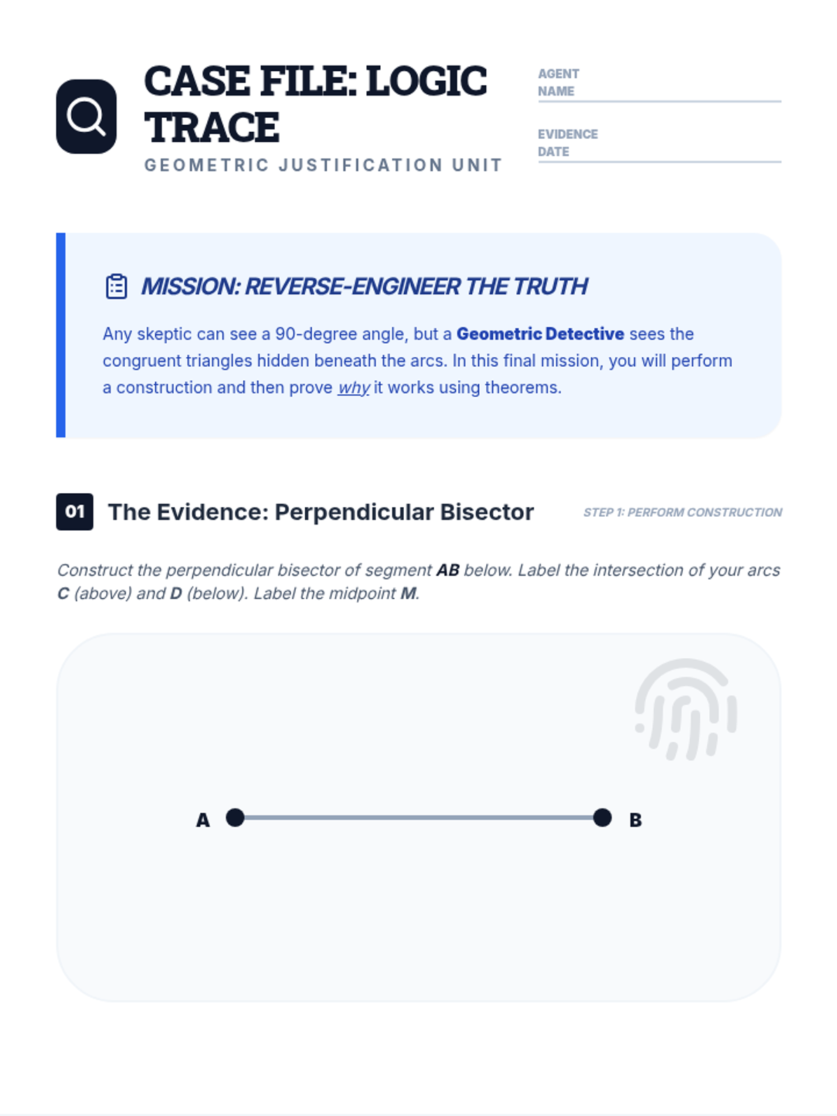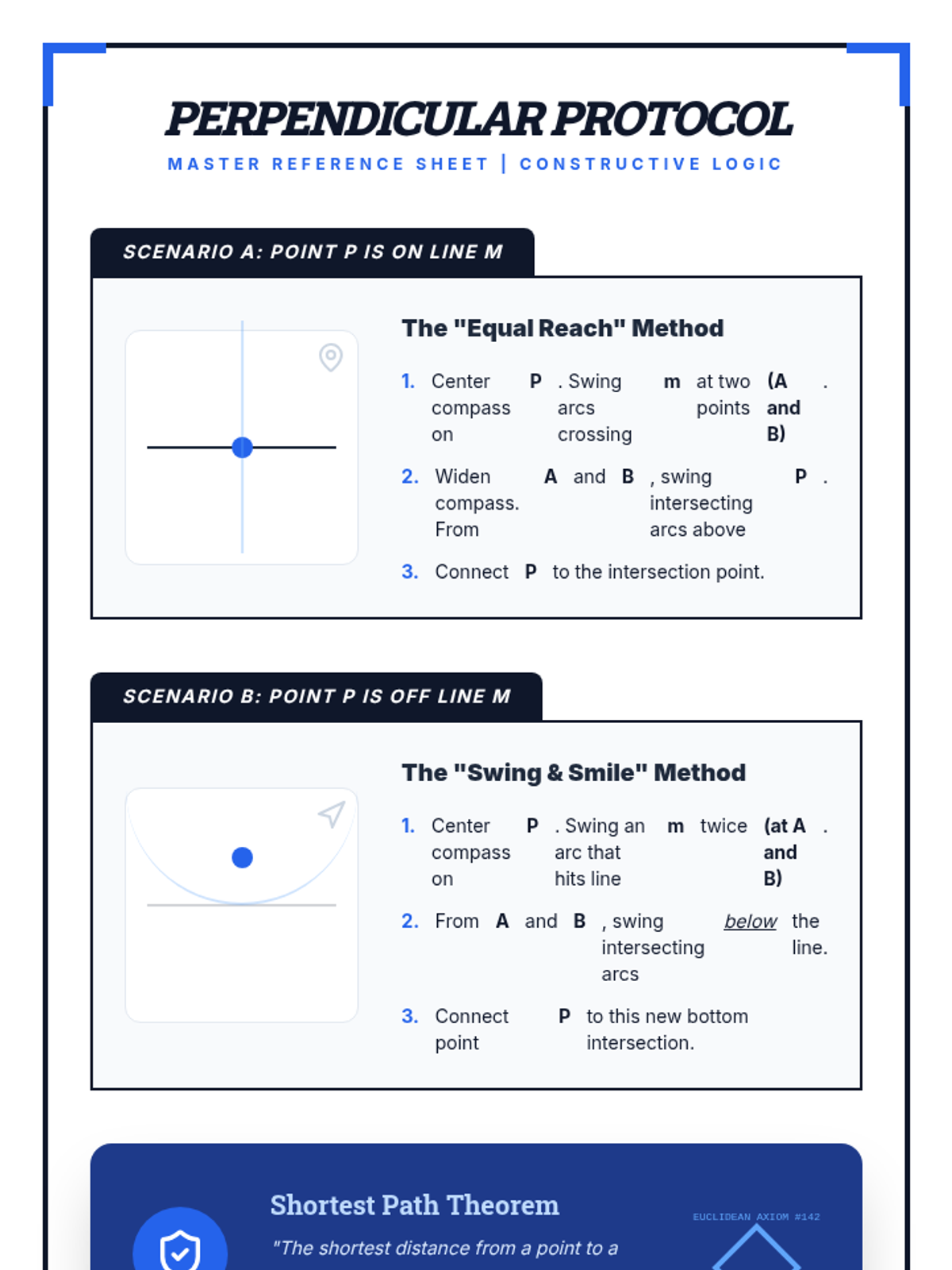 A 9th-grade geometry unit focused on Euclidean constructions using a compass and straightedge. Students progress from basic copying of segments and angles to complex perpendicular constructions and logical justifications of their methods.