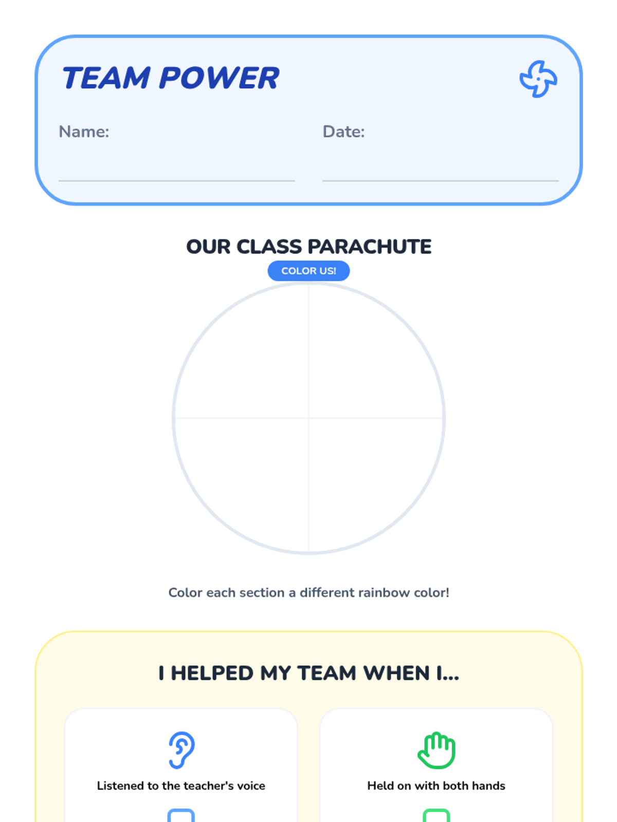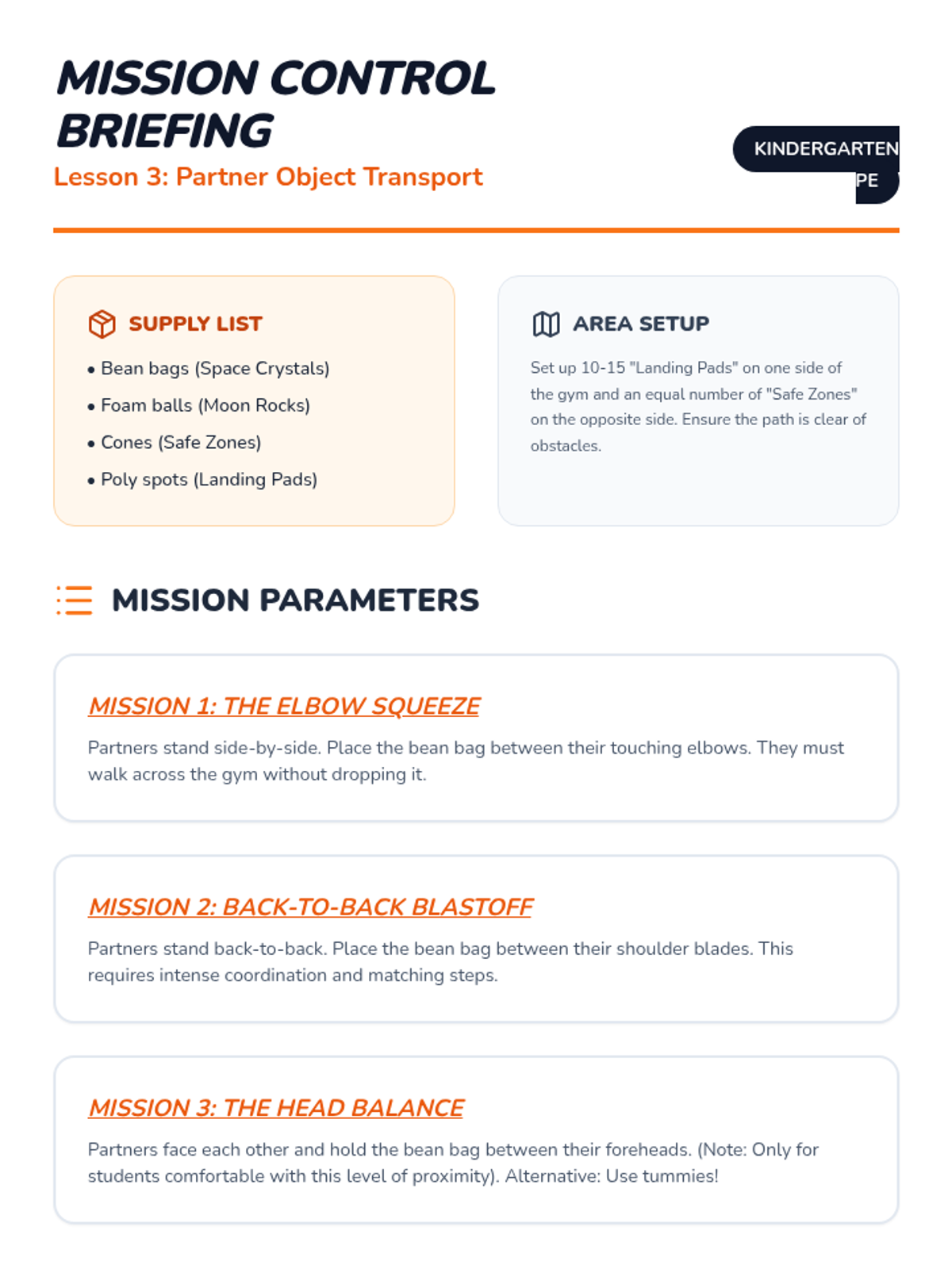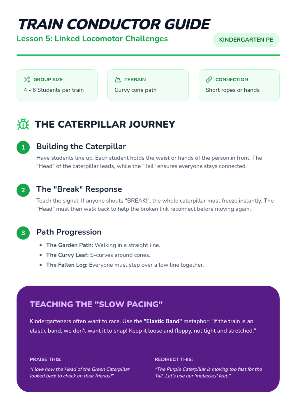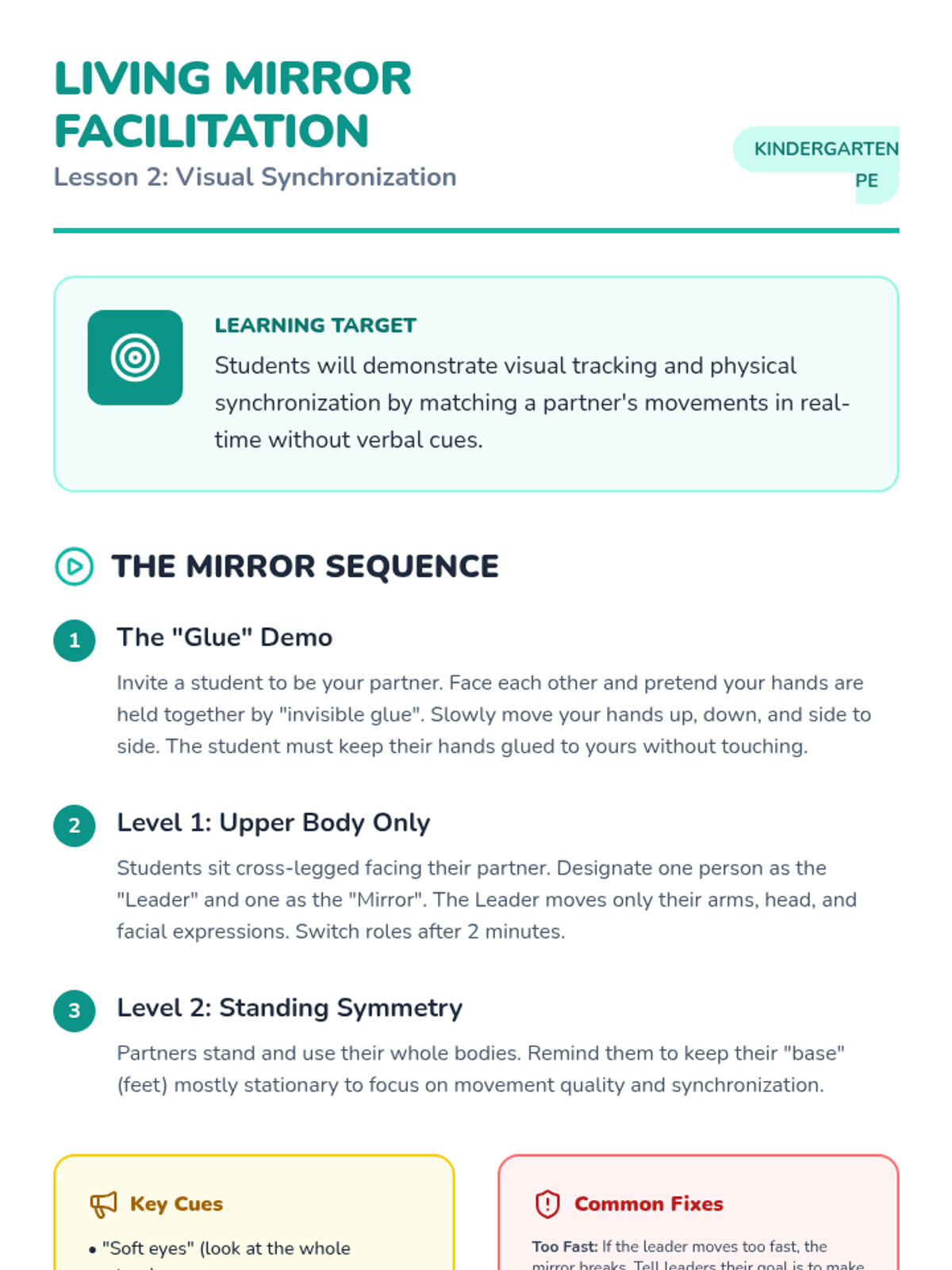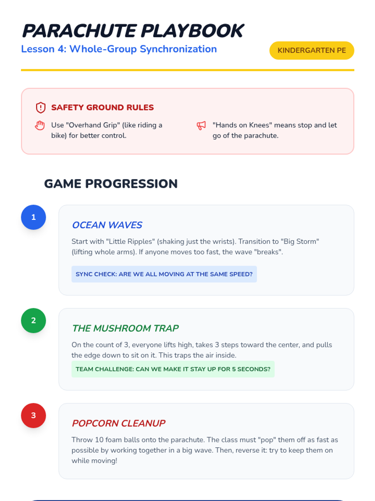 A foundational sequence for Kindergarten students focused on developing spatial awareness, partner coordination, and group synchronization through movement-based cooperative games. Students progress from individual spatial boundaries to complex group activities like parachute play and linked locomotor movements.