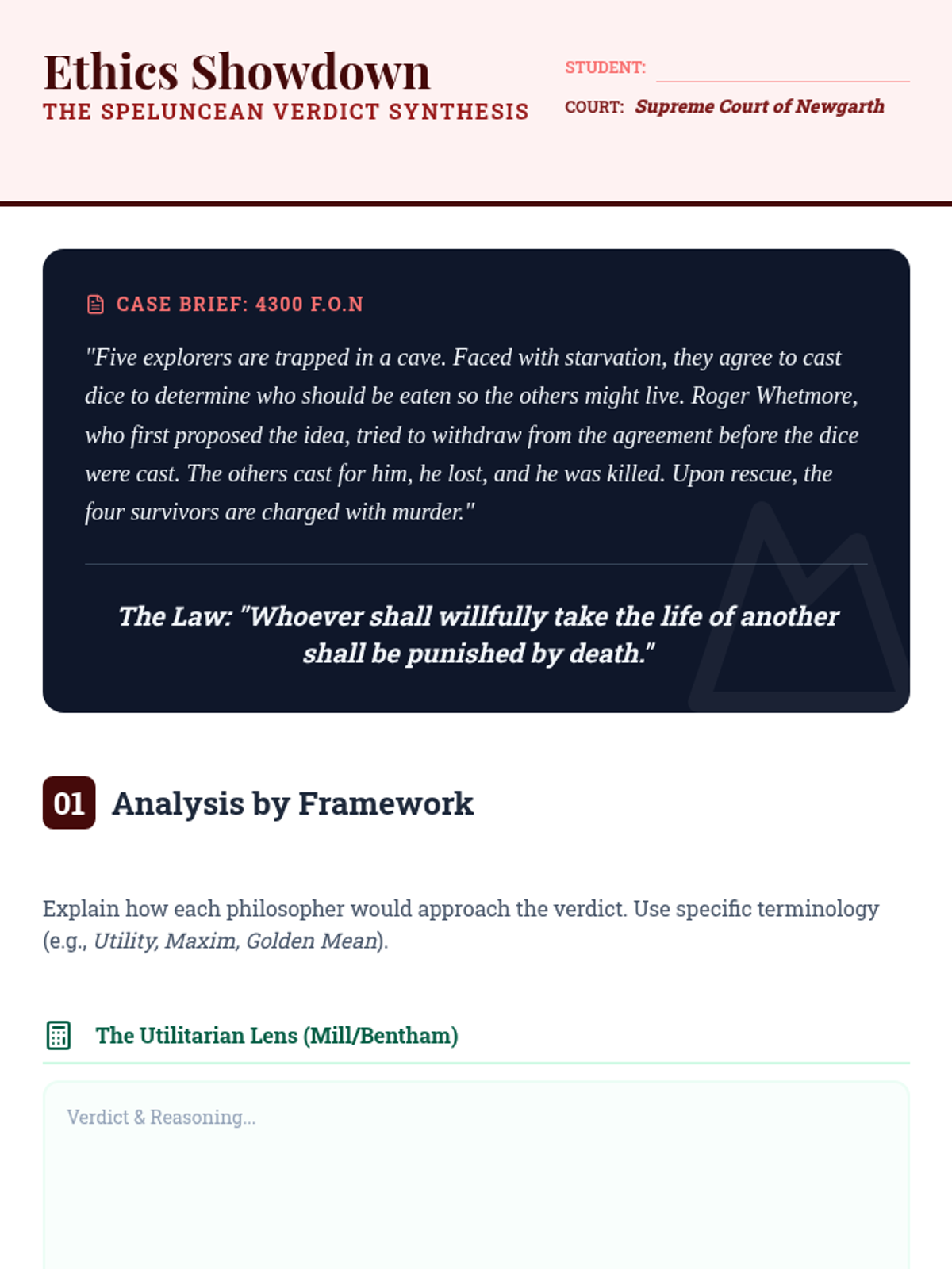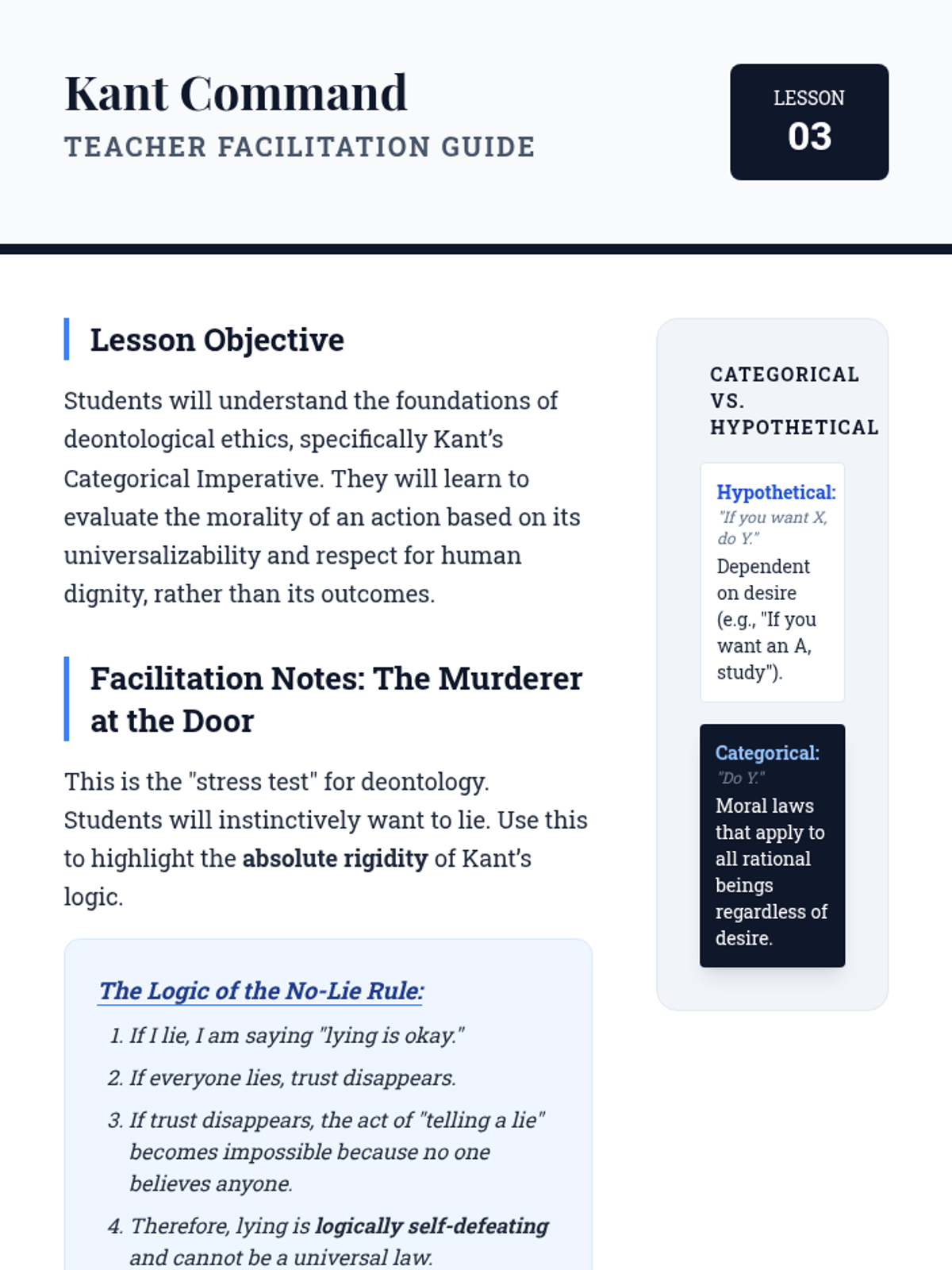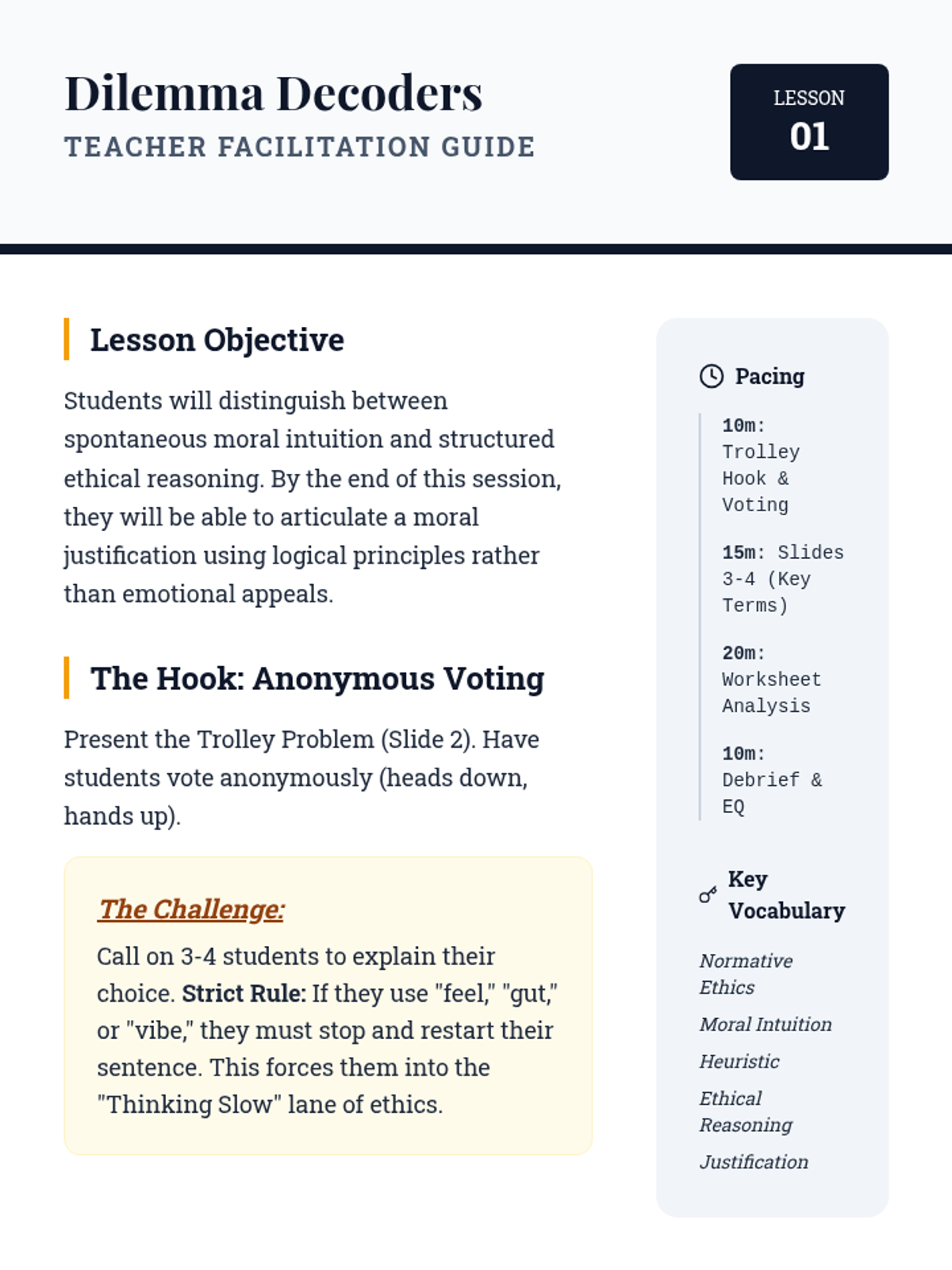 A comprehensive introduction to normative ethics for 11th-grade students, covering utilitarianism, deontology, and virtue ethics. Students move from intuitive moral judgments to structured philosophical reasoning using primary text concepts.