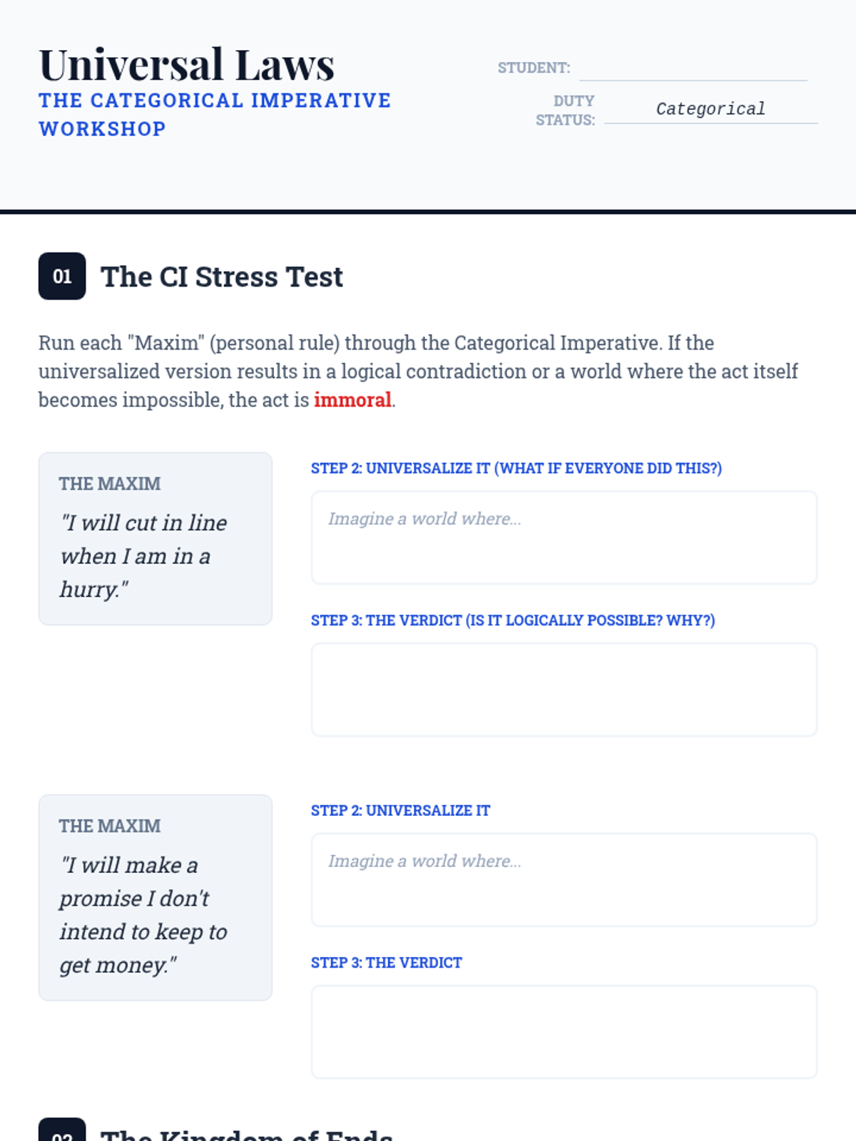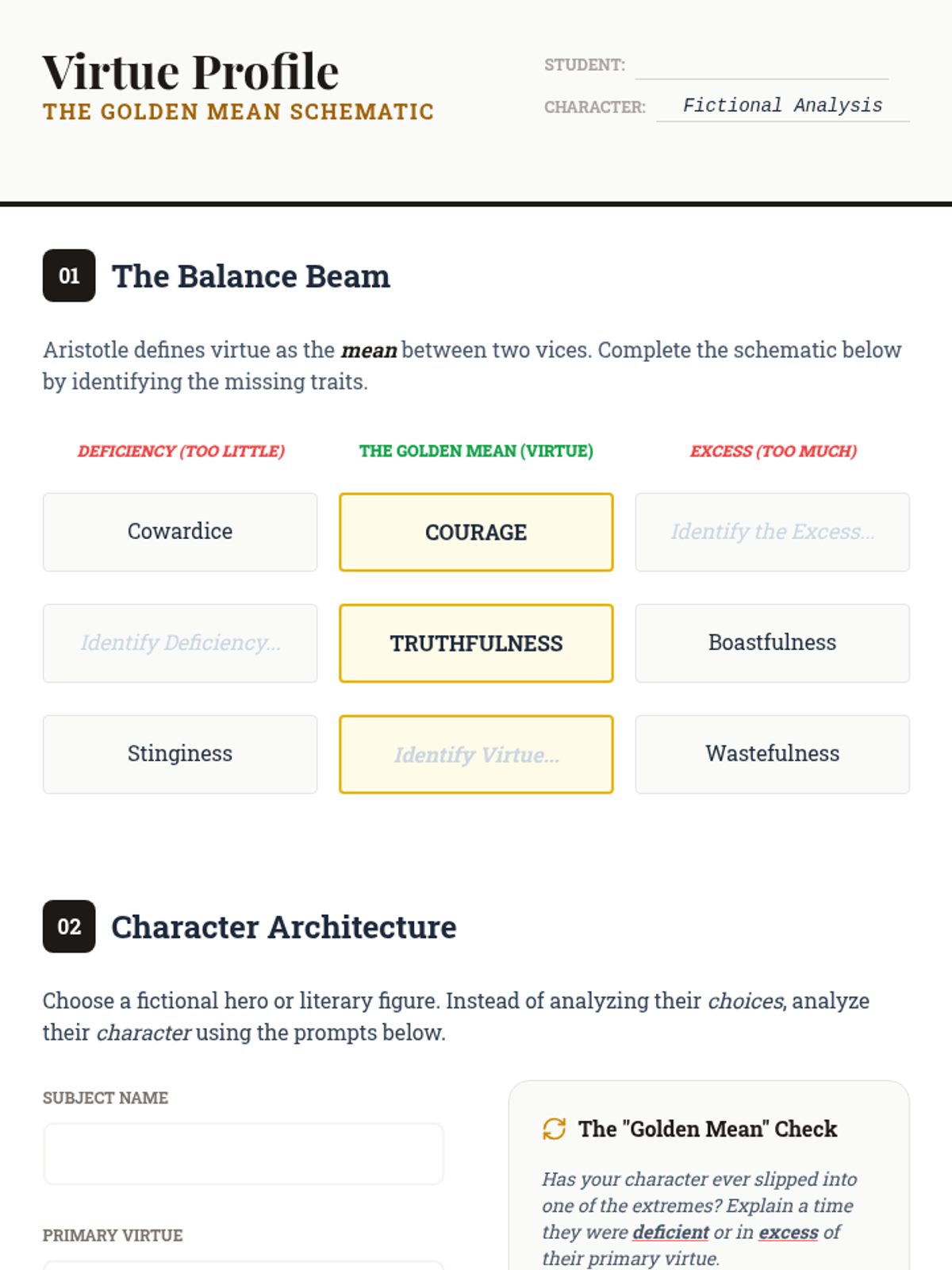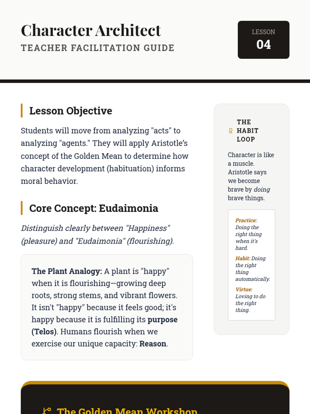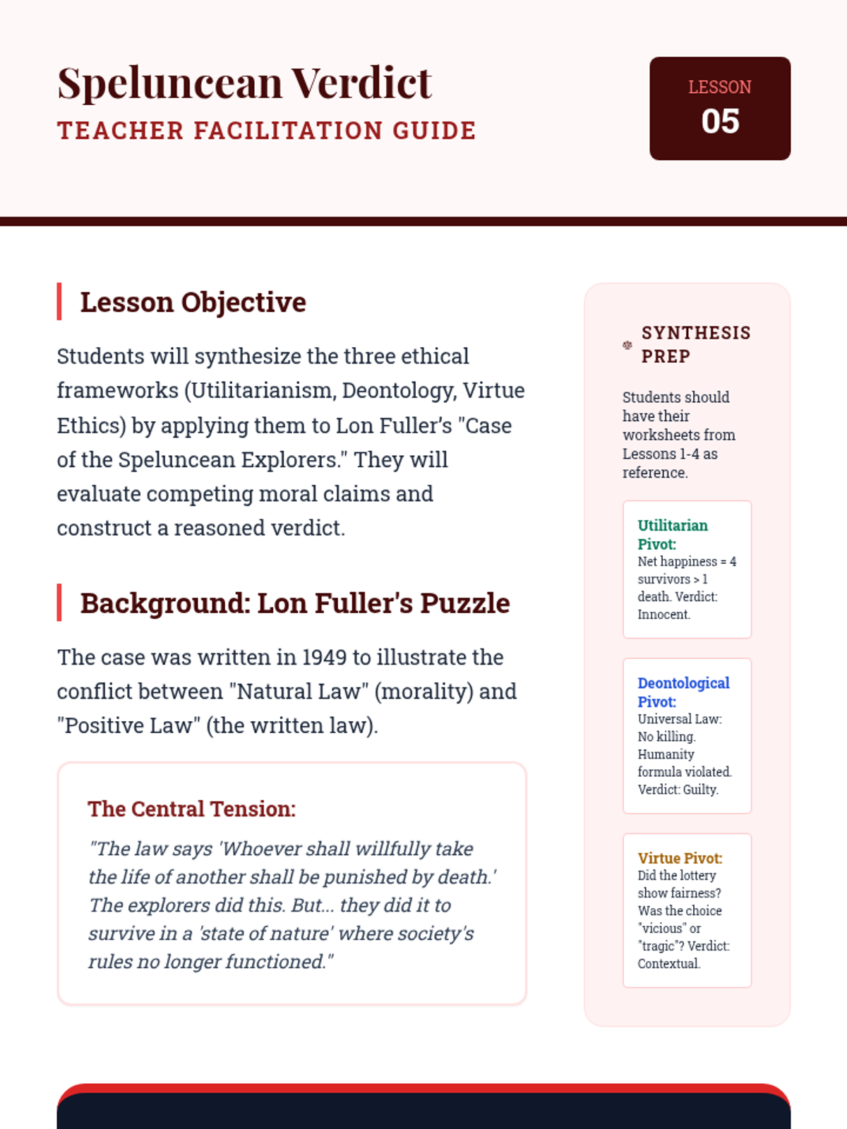 A comprehensive introduction to normative ethics for 11th-grade students, covering utilitarianism, deontology, and virtue ethics. Students move from intuitive moral judgments to structured philosophical reasoning using primary text concepts.