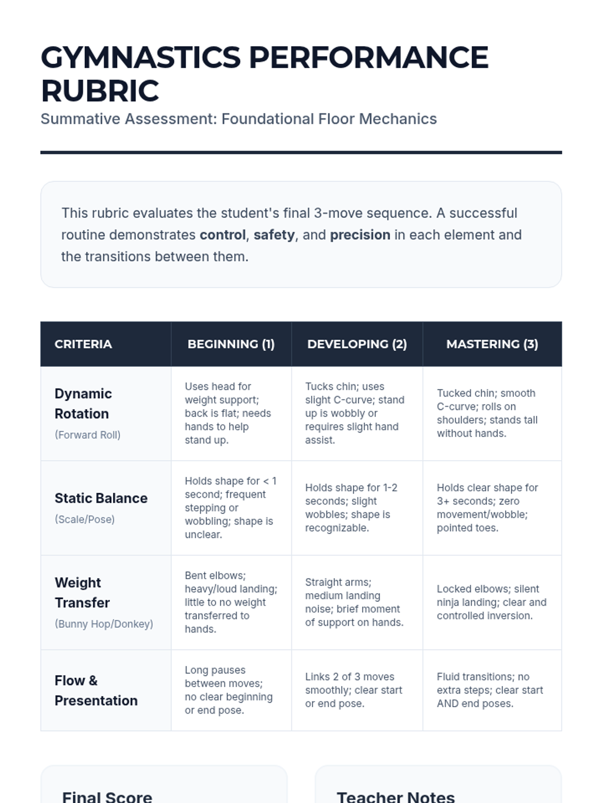 A foundational gymnastics sequence for 3rd grade focusing on body shapes, safe landings, forward rolls, inversions, and lateral rotations. Students explore how body shape influences movement and control.