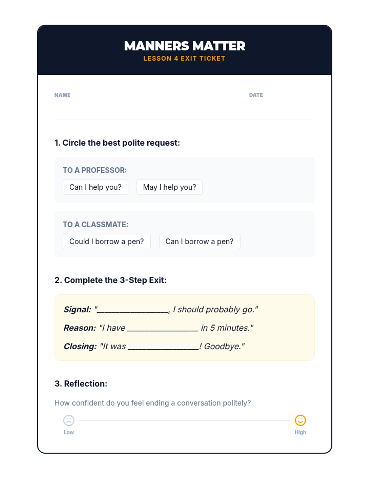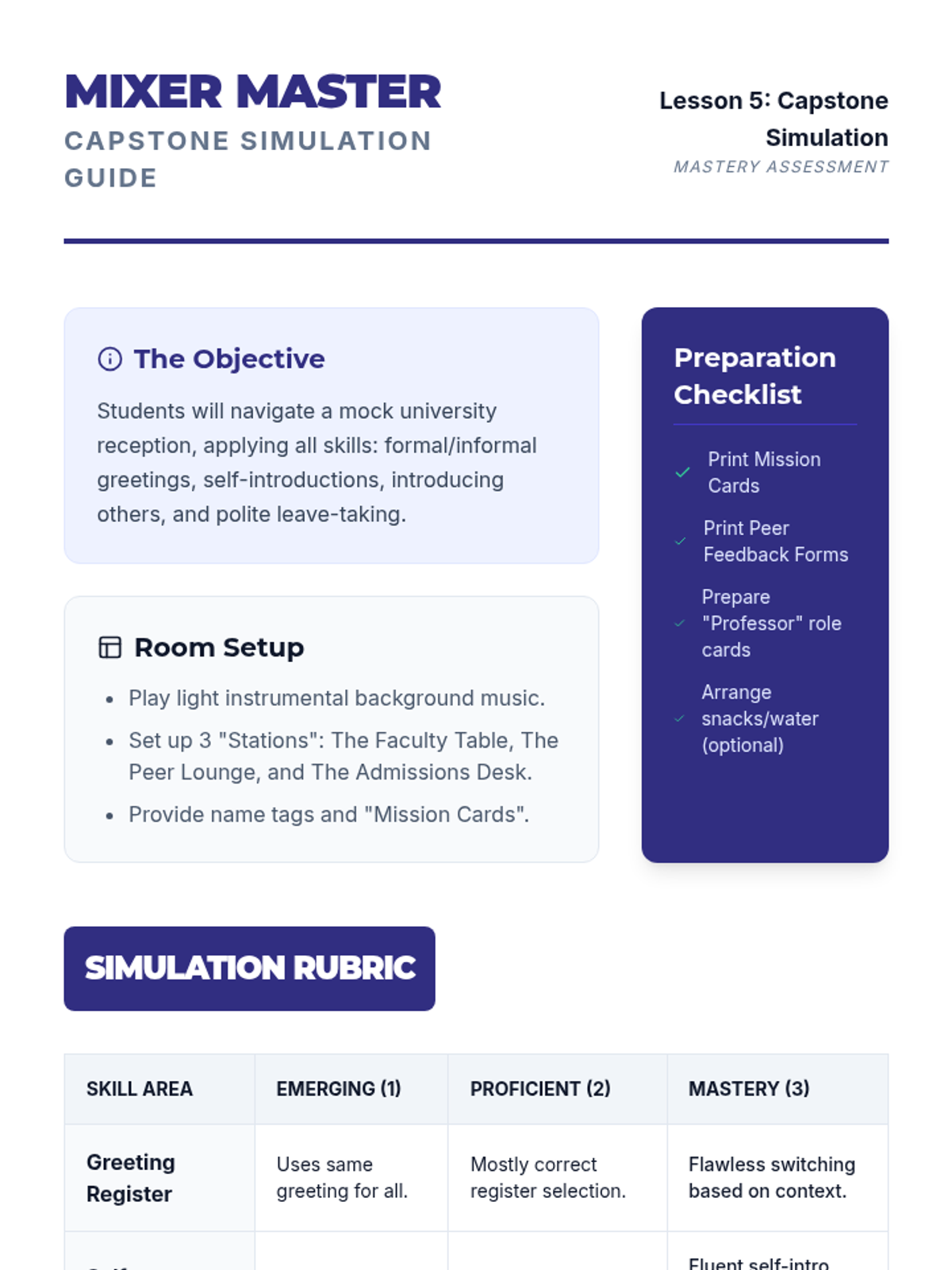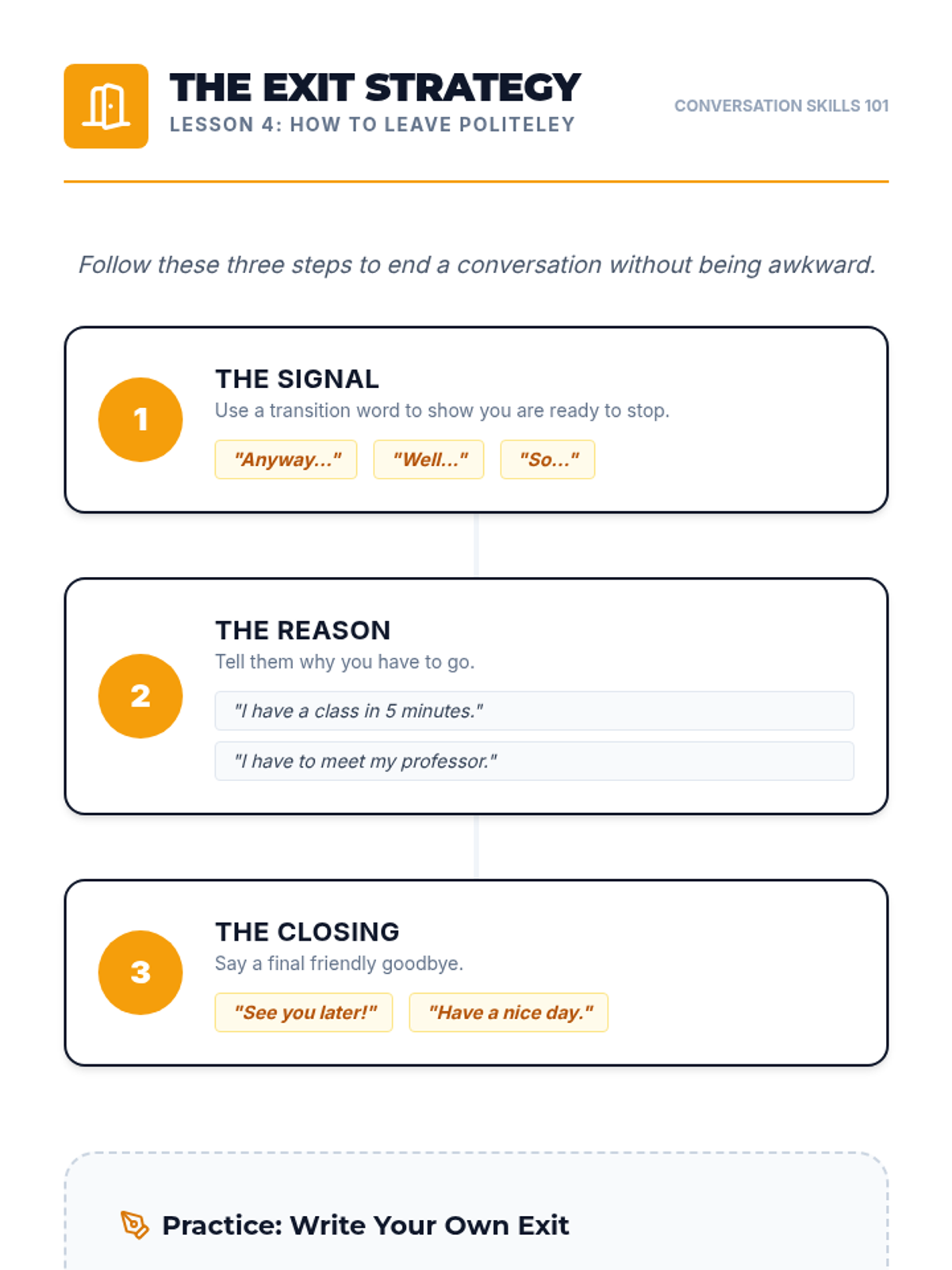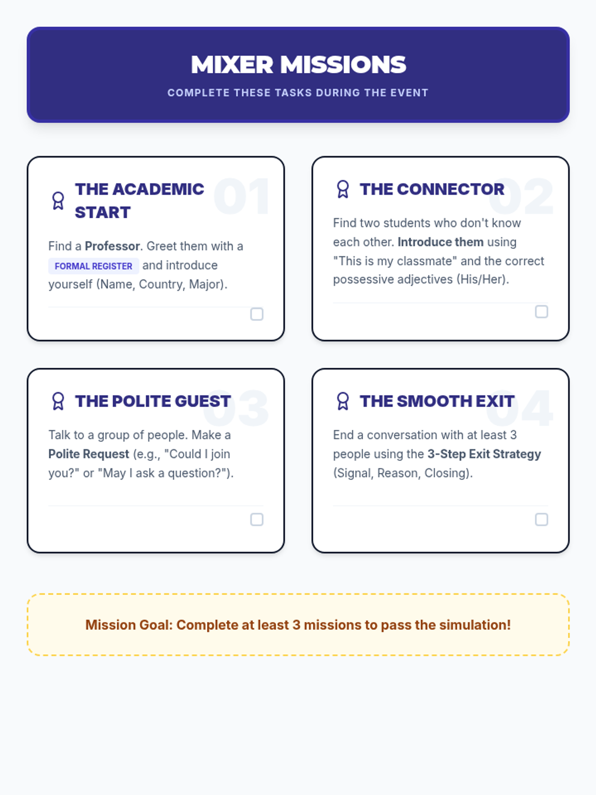 This sequence introduces undergraduate students to the foundational vocabulary required for navigating initial social and academic interactions on a university campus. Students learn to distinguish between formal and informal registers, introduce themselves and others, and close conversations politely.
