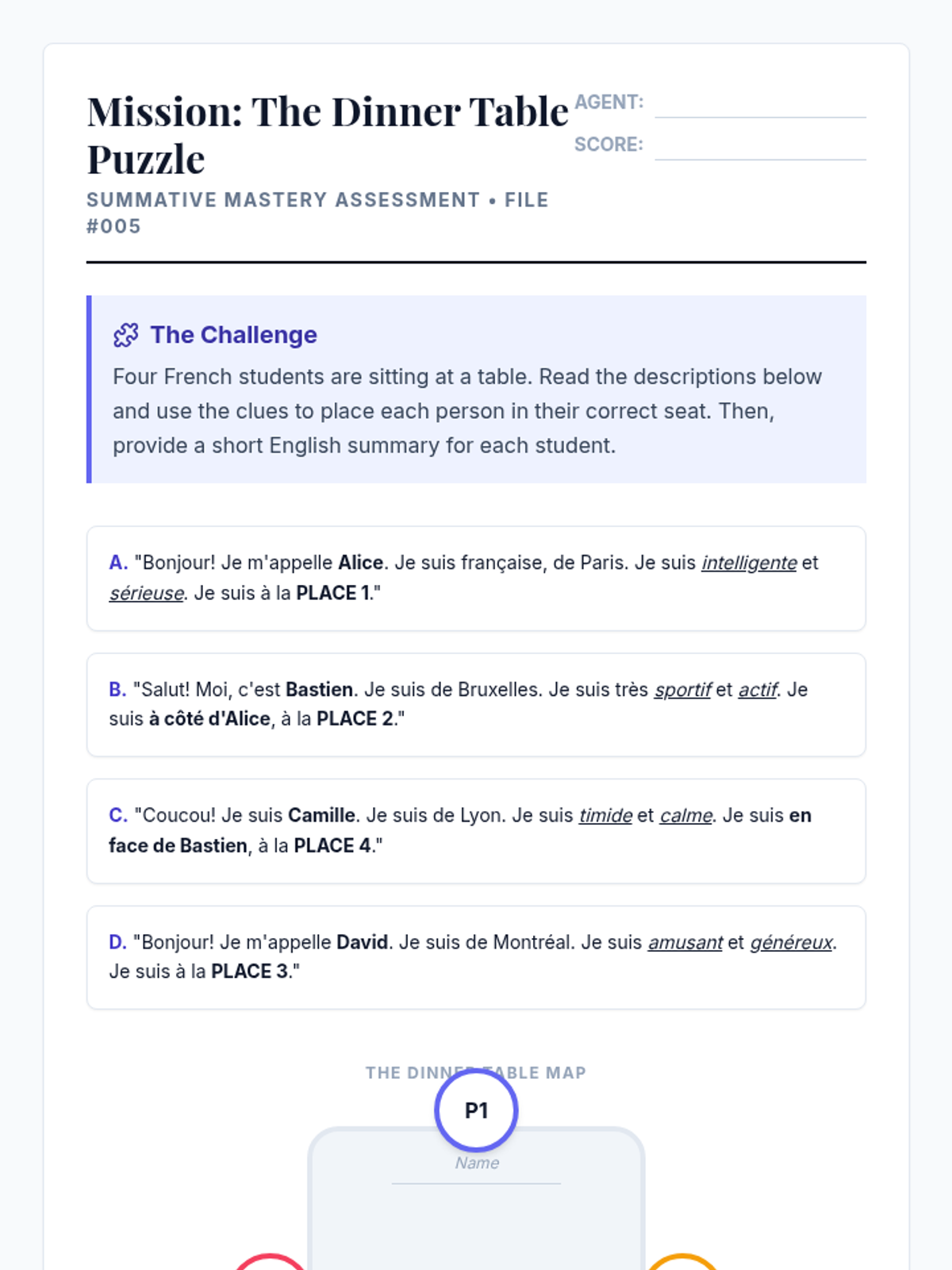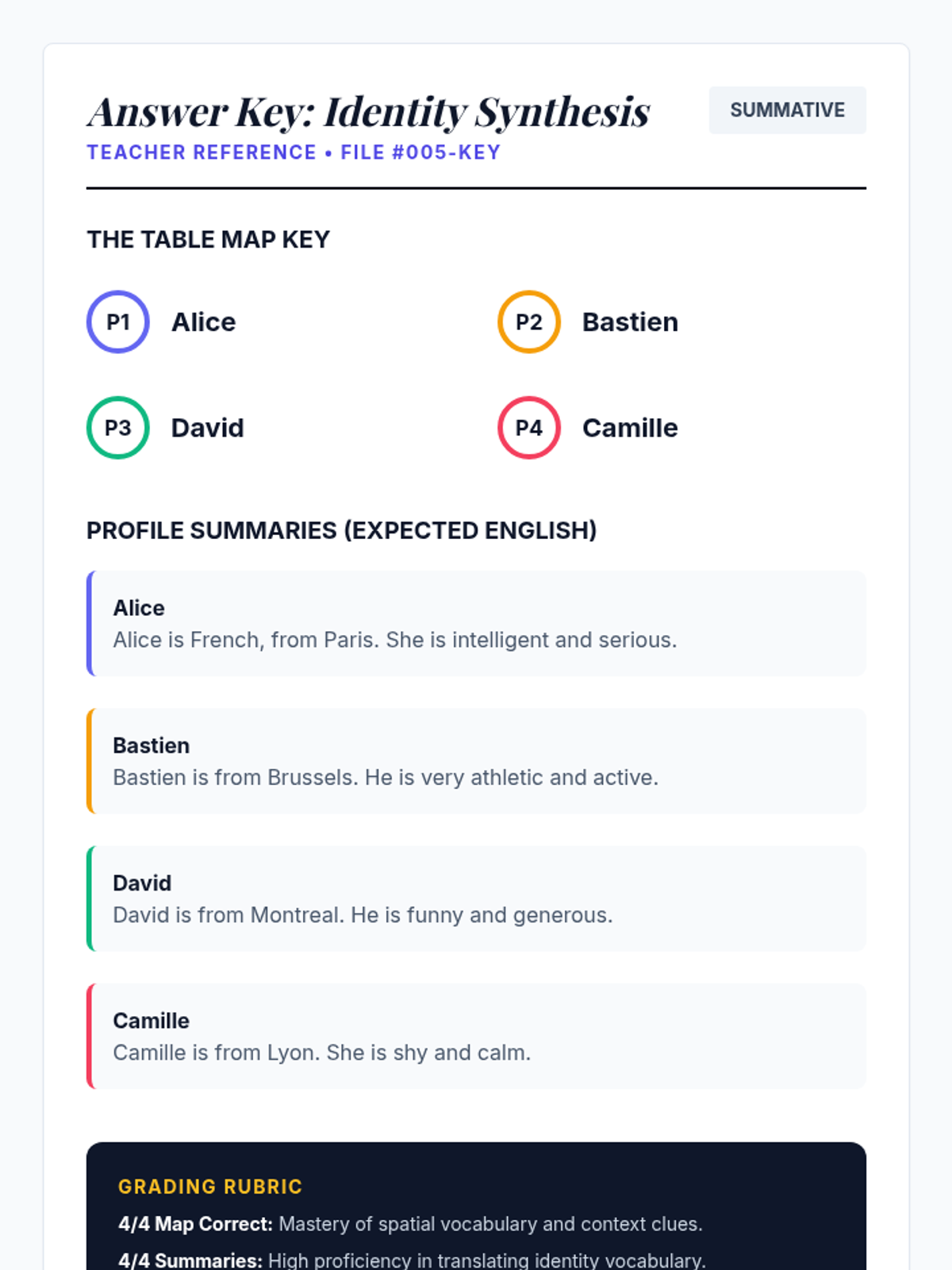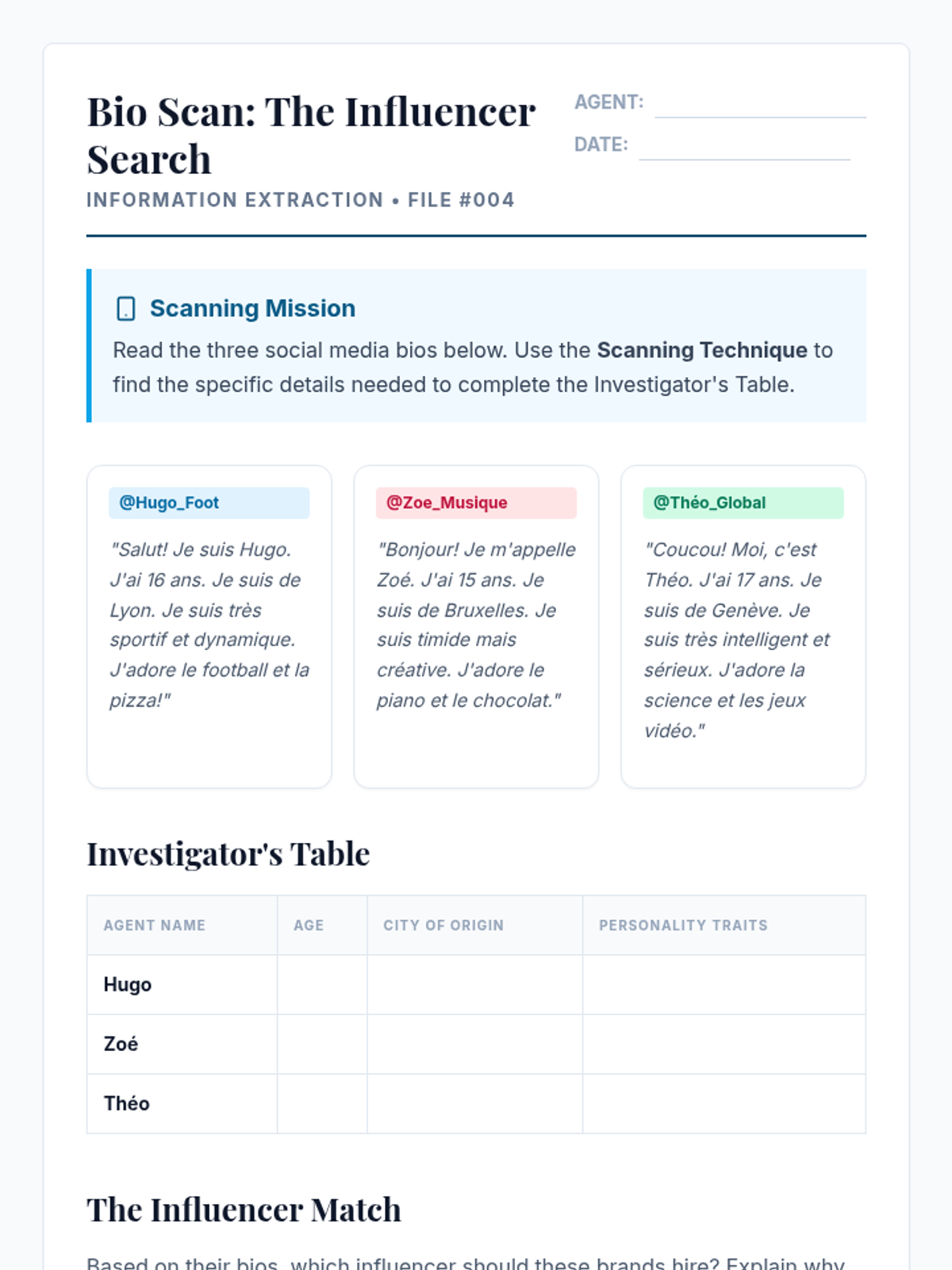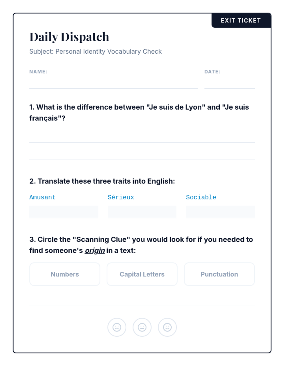 A foundational French reading sequence for 8th graders focusing on decoding identity-based texts using cognates, context clues, and basic grammar like 'être' and adjective agreement. Students progress from identifying familiar words to synthesizing full narratives about personal identity.