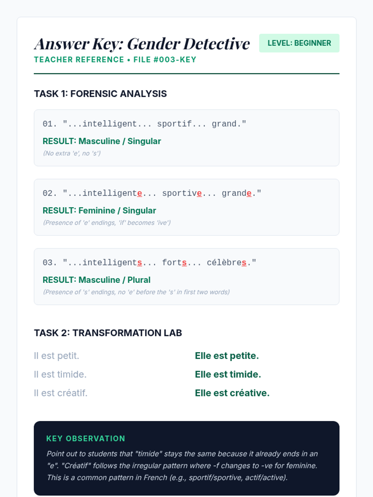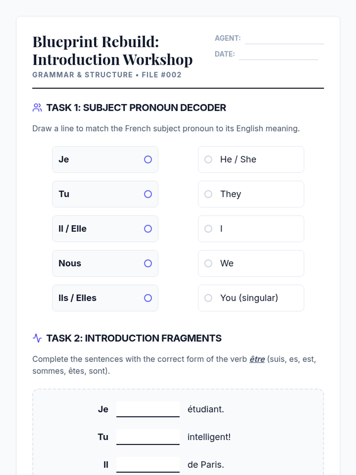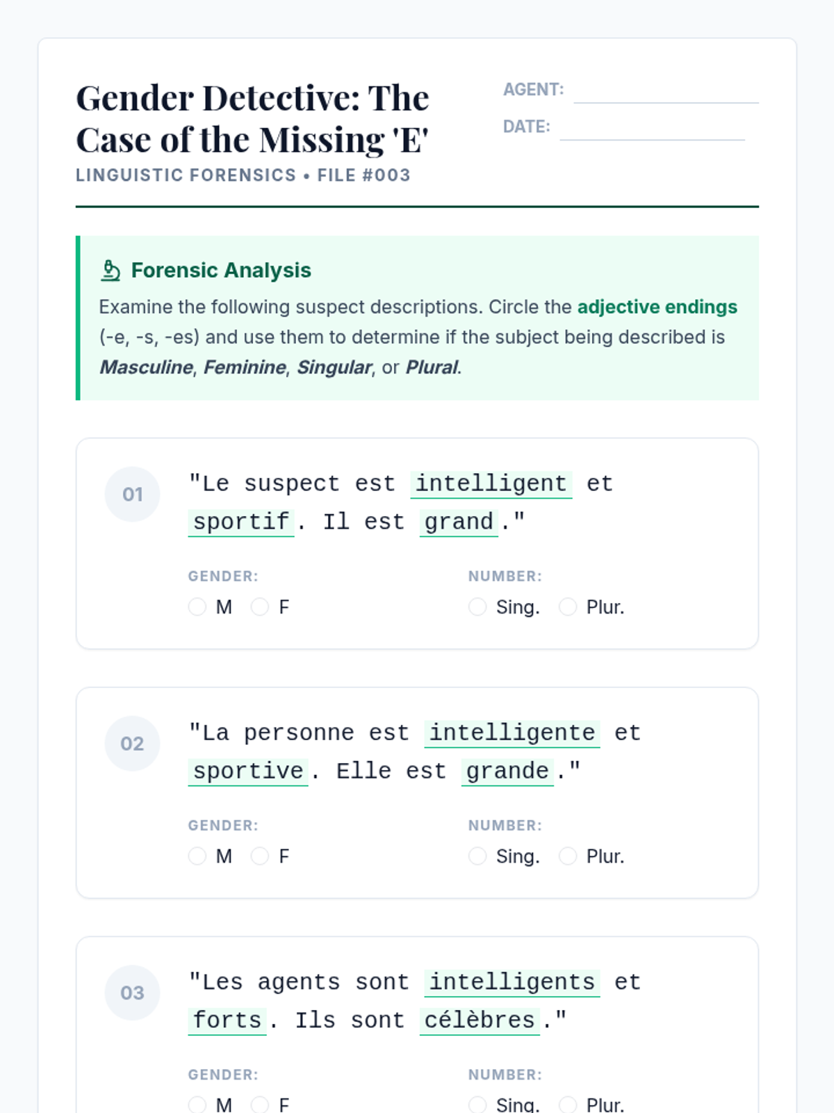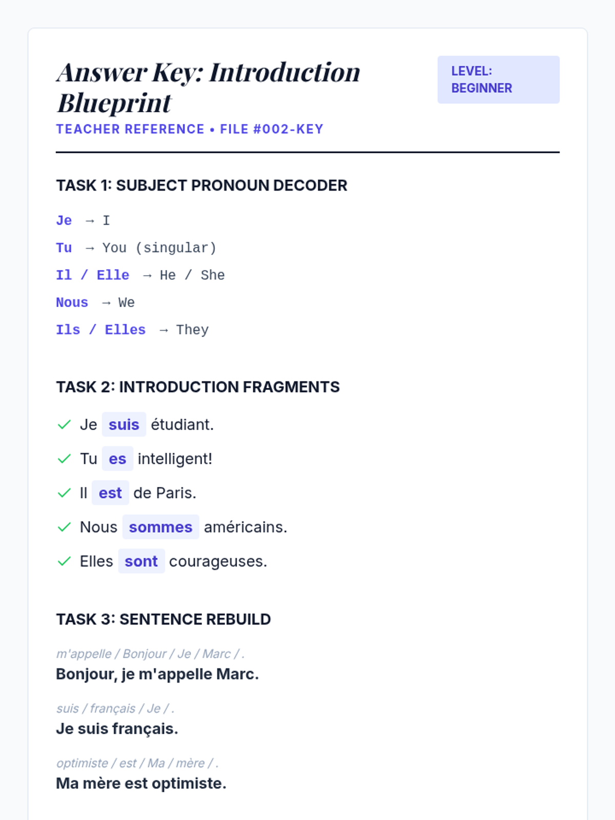 A foundational French reading sequence for 8th graders focusing on decoding identity-based texts using cognates, context clues, and basic grammar like 'être' and adjective agreement. Students progress from identifying familiar words to synthesizing full narratives about personal identity.