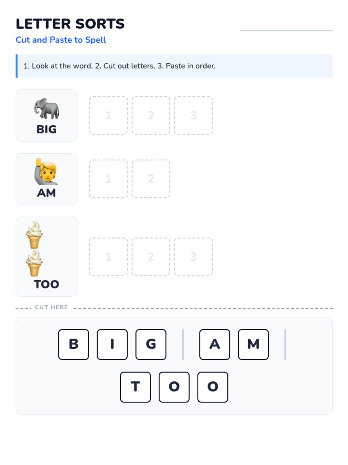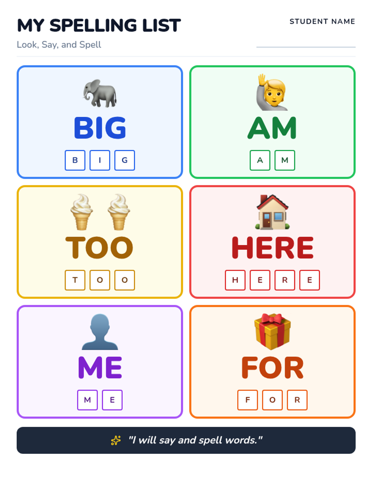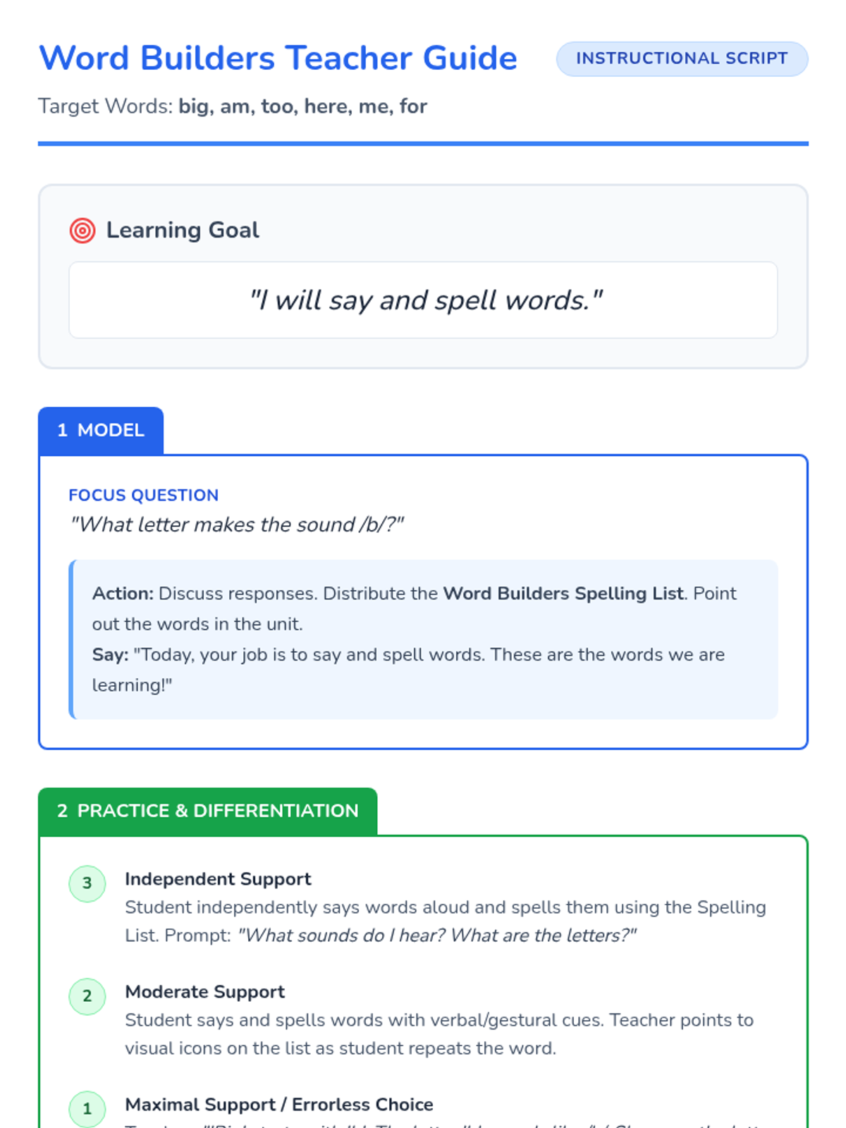 A series of interactive and highly visual spelling lessons designed for students with moderate intellectual disabilities. This sequence focuses on six high-frequency words using the Model-Practice-Review framework with heavy visual supports and tactile activities.