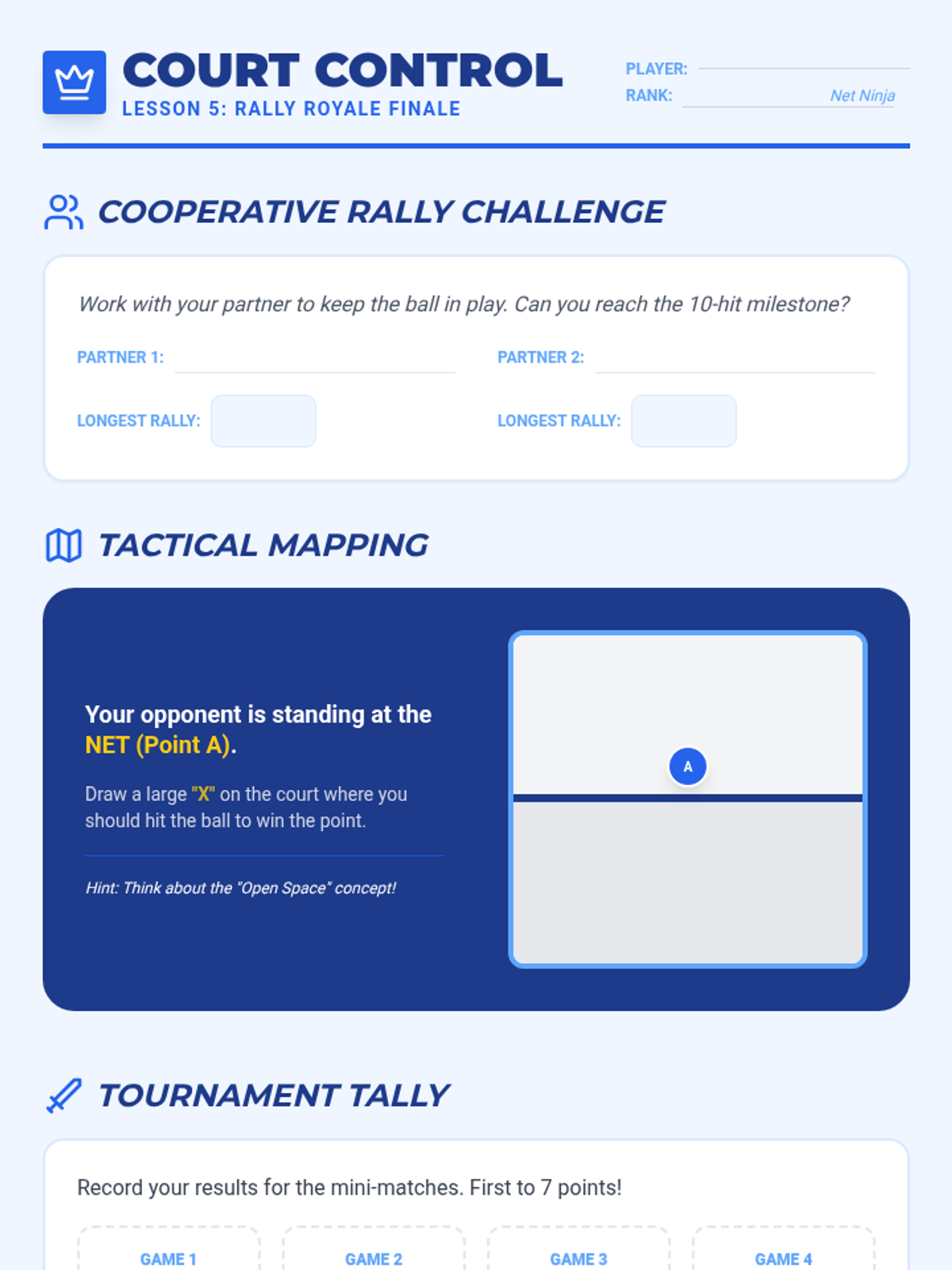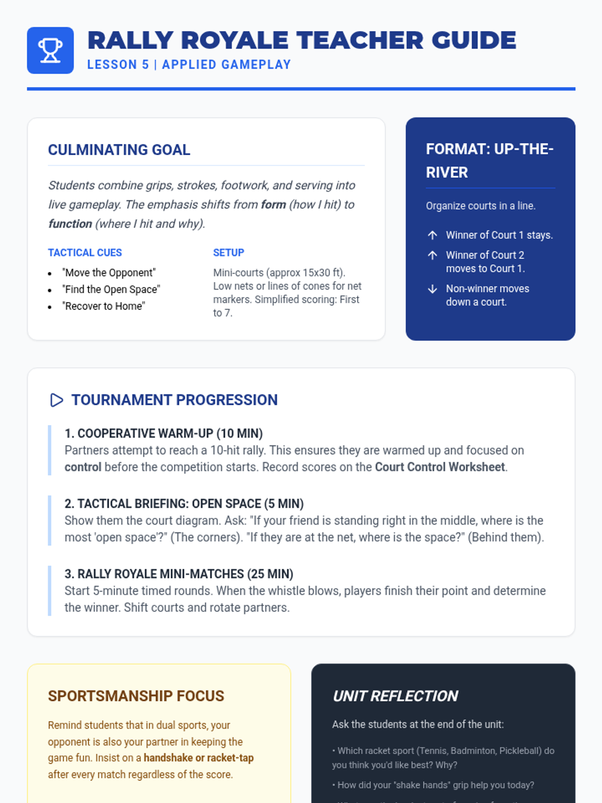 A comprehensive 3-week pickleball unit covering fundamental rules, essential skills like dinking and serving, and advanced singles and doubles strategies. Students progress from basic court positioning to competitive tournament play.