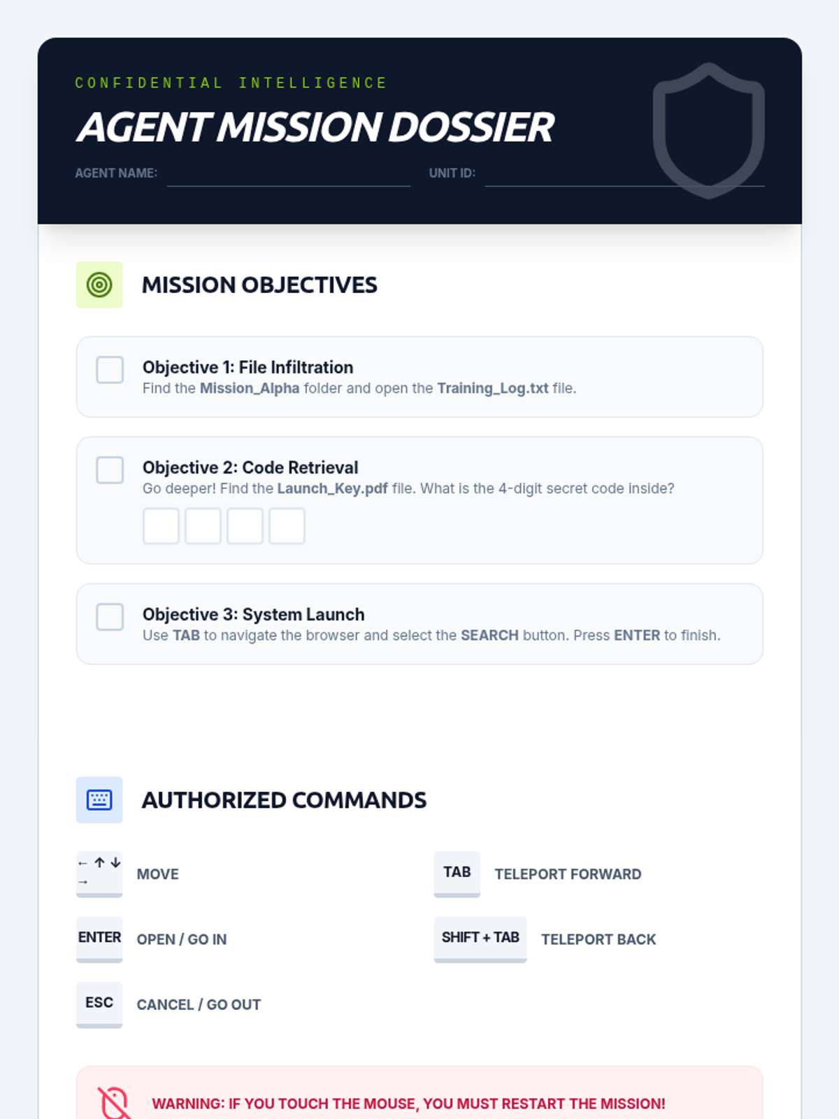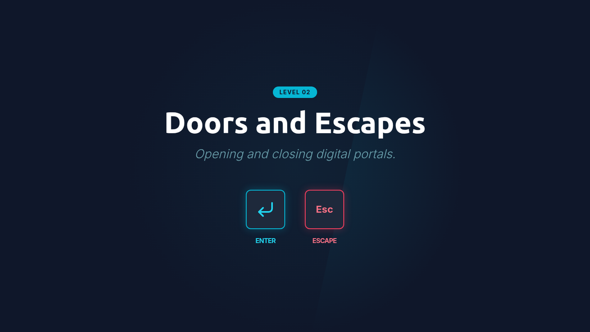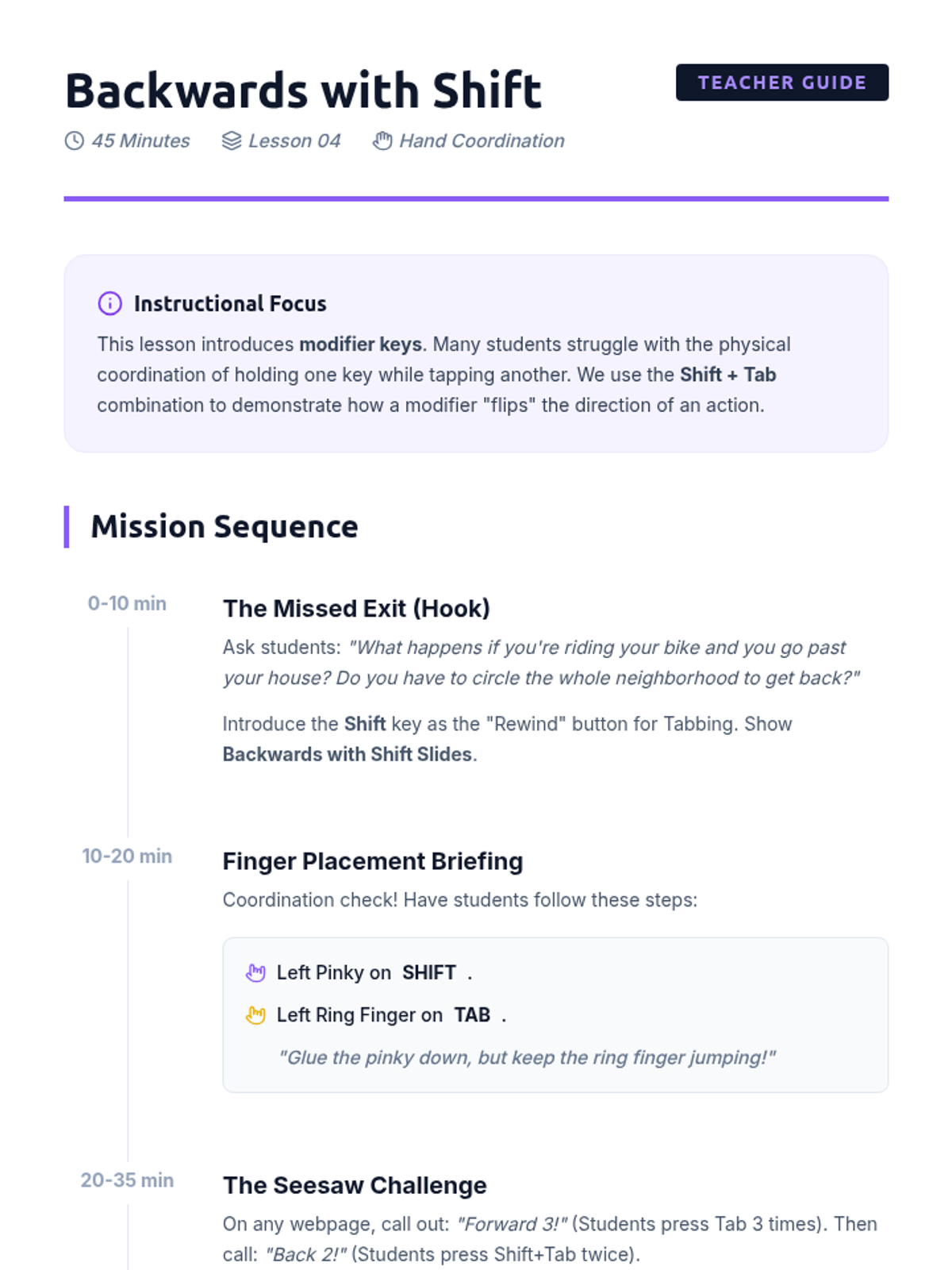 This sequence introduces 3rd-grade students to foundational keyboard navigation skills, focusing on using arrow keys, Tab, Enter, Escape, and Shift+Tab to navigate digital interfaces without a mouse. Students develop spatial awareness and logical progression through interactive simulations and challenges.