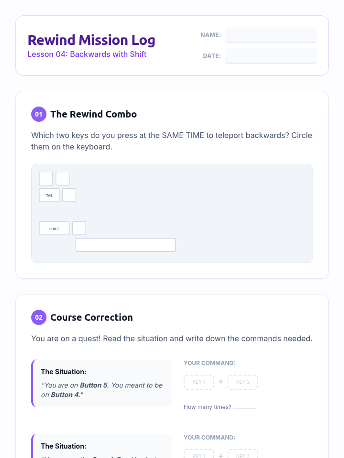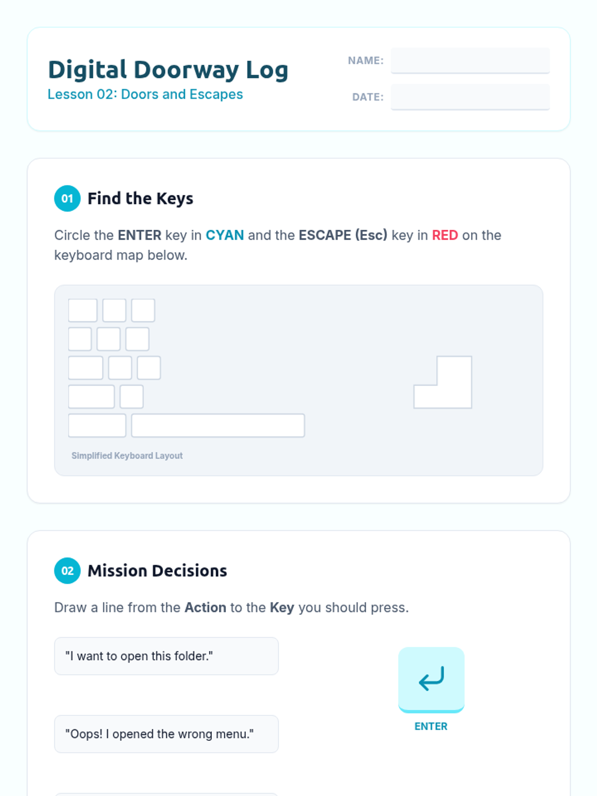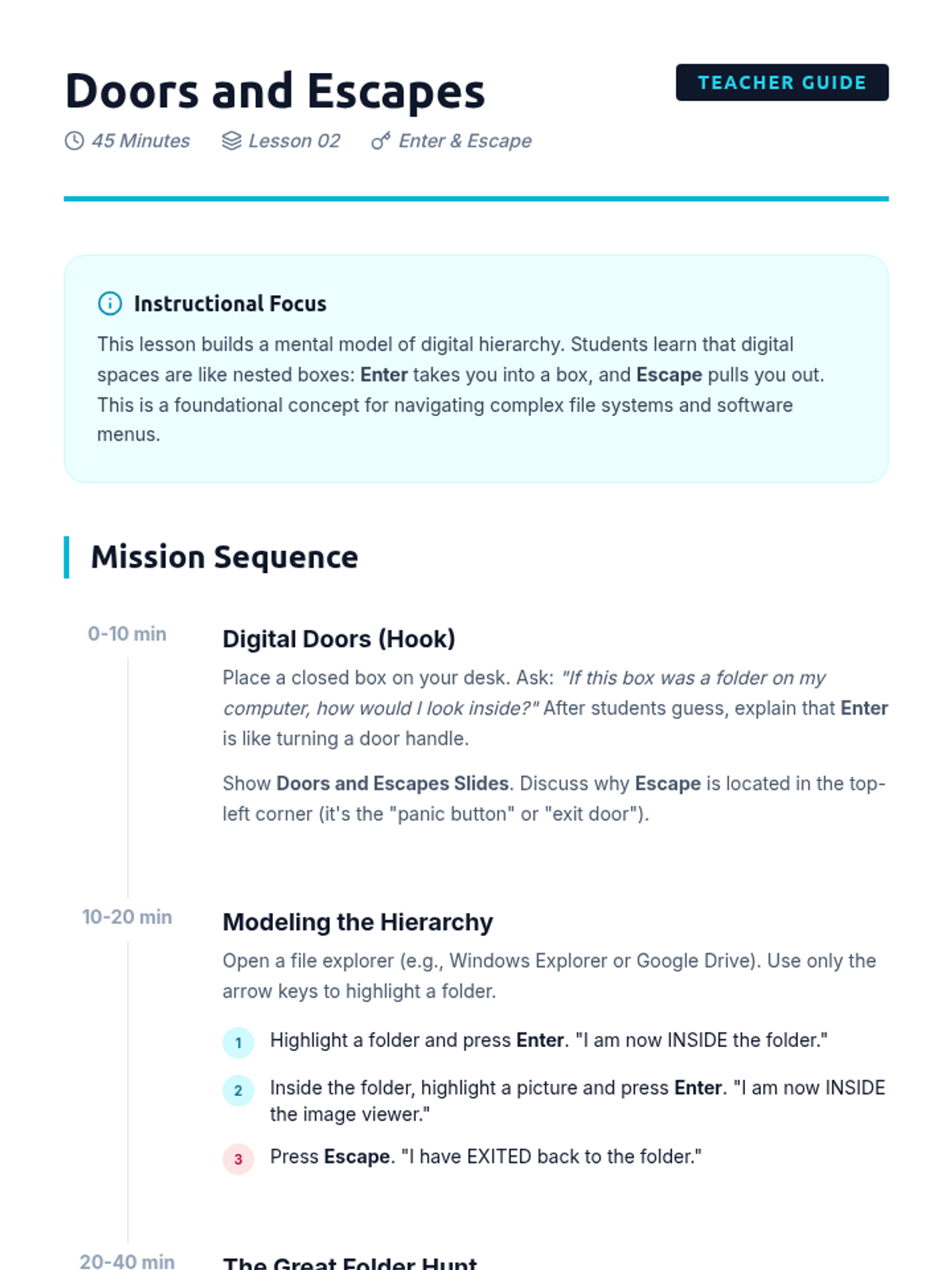 This sequence introduces 3rd-grade students to foundational keyboard navigation skills, focusing on using arrow keys, Tab, Enter, Escape, and Shift+Tab to navigate digital interfaces without a mouse. Students develop spatial awareness and logical progression through interactive simulations and challenges.