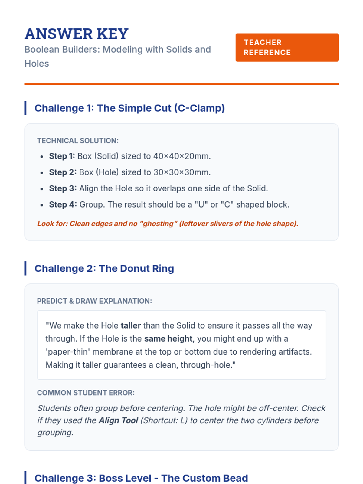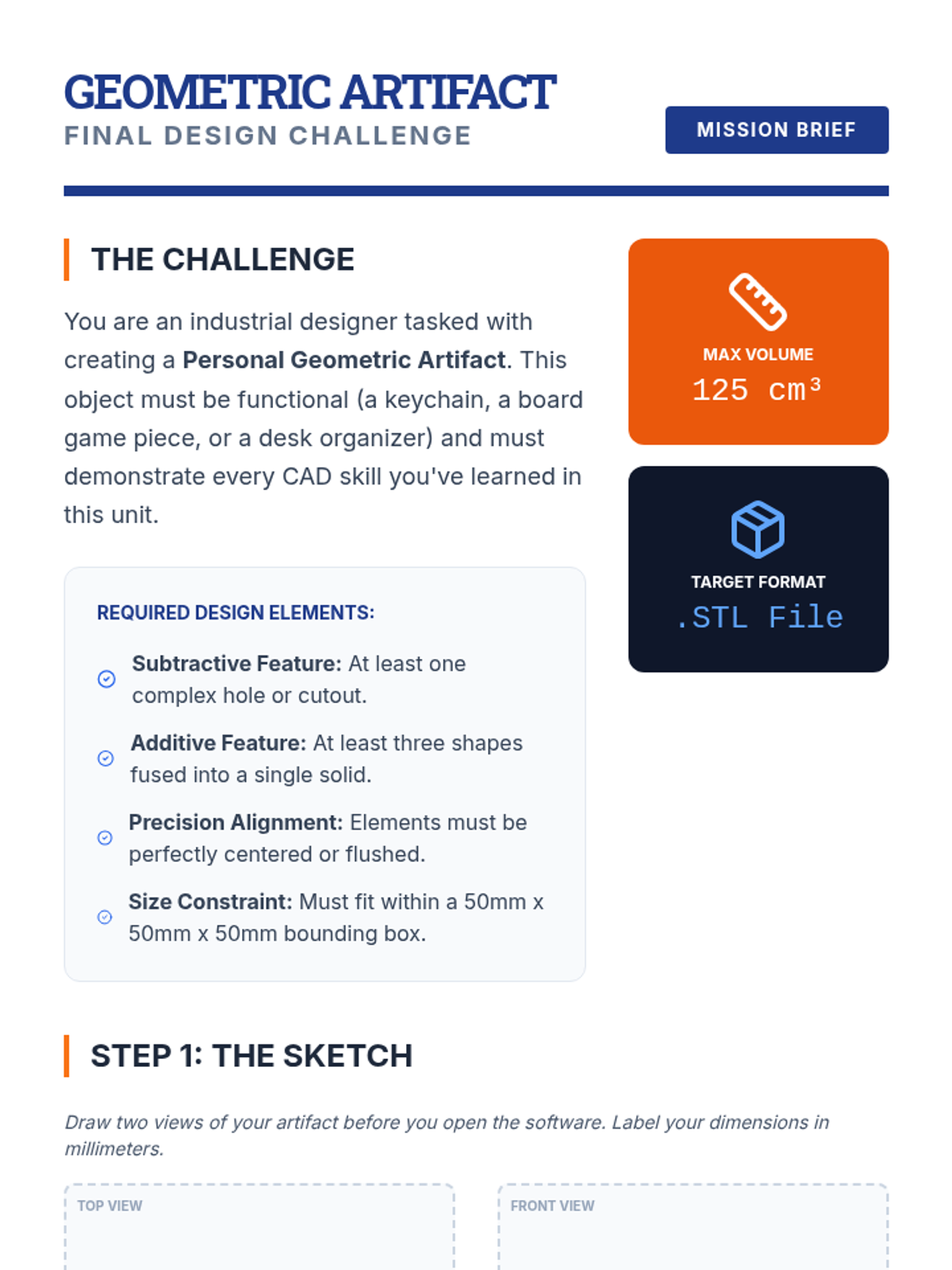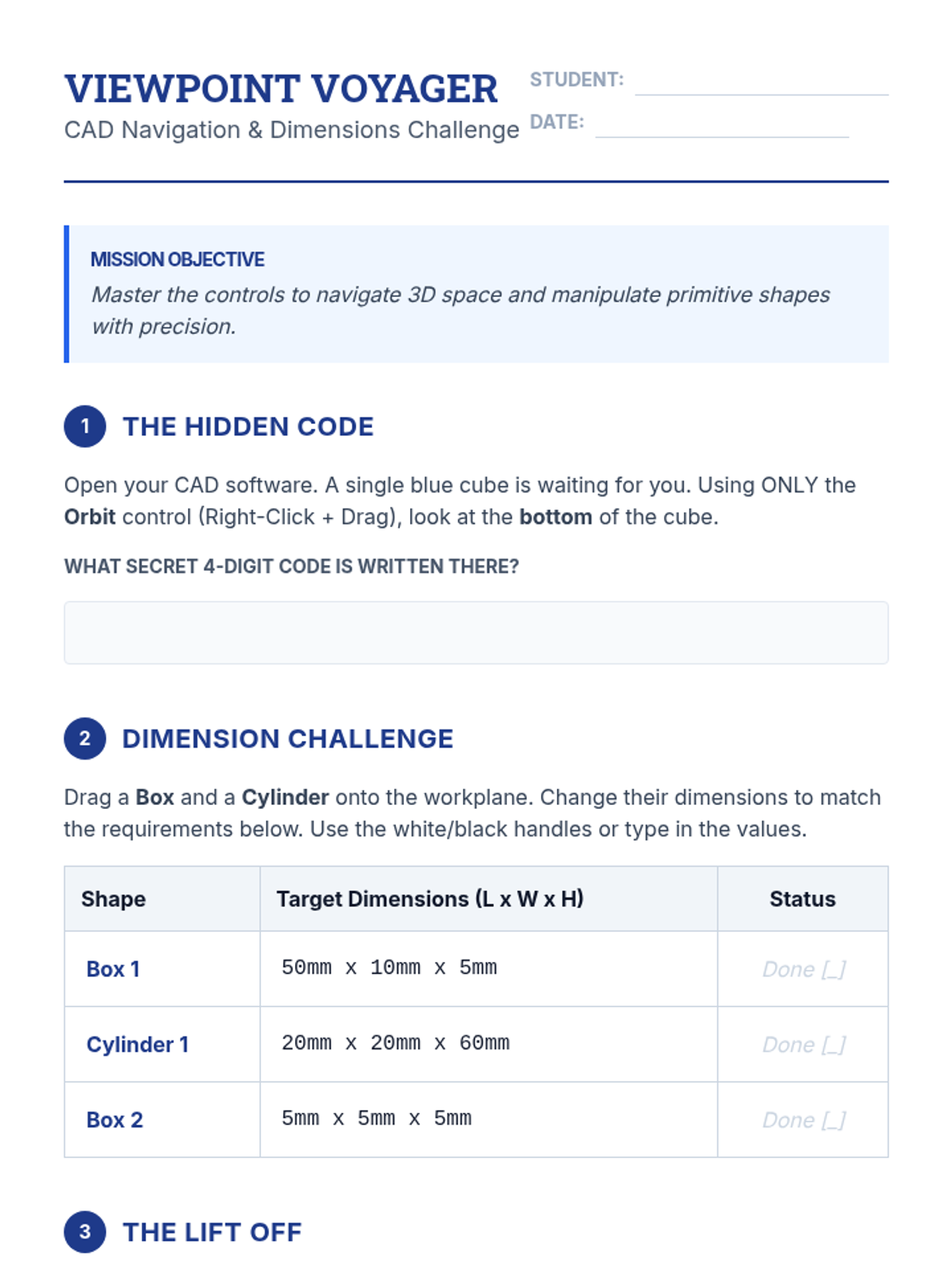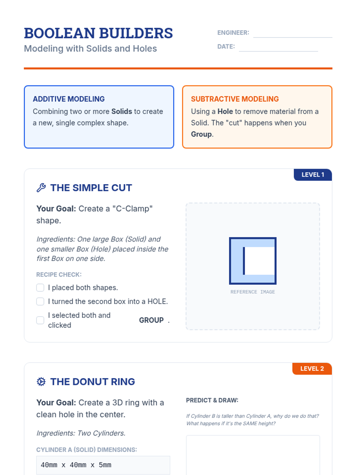 A comprehensive introduction to CAD and 3D geometry for 7th-grade students, focusing on spatial reasoning, boolean operations, precision, and parametric logic through hands-on modeling challenges.