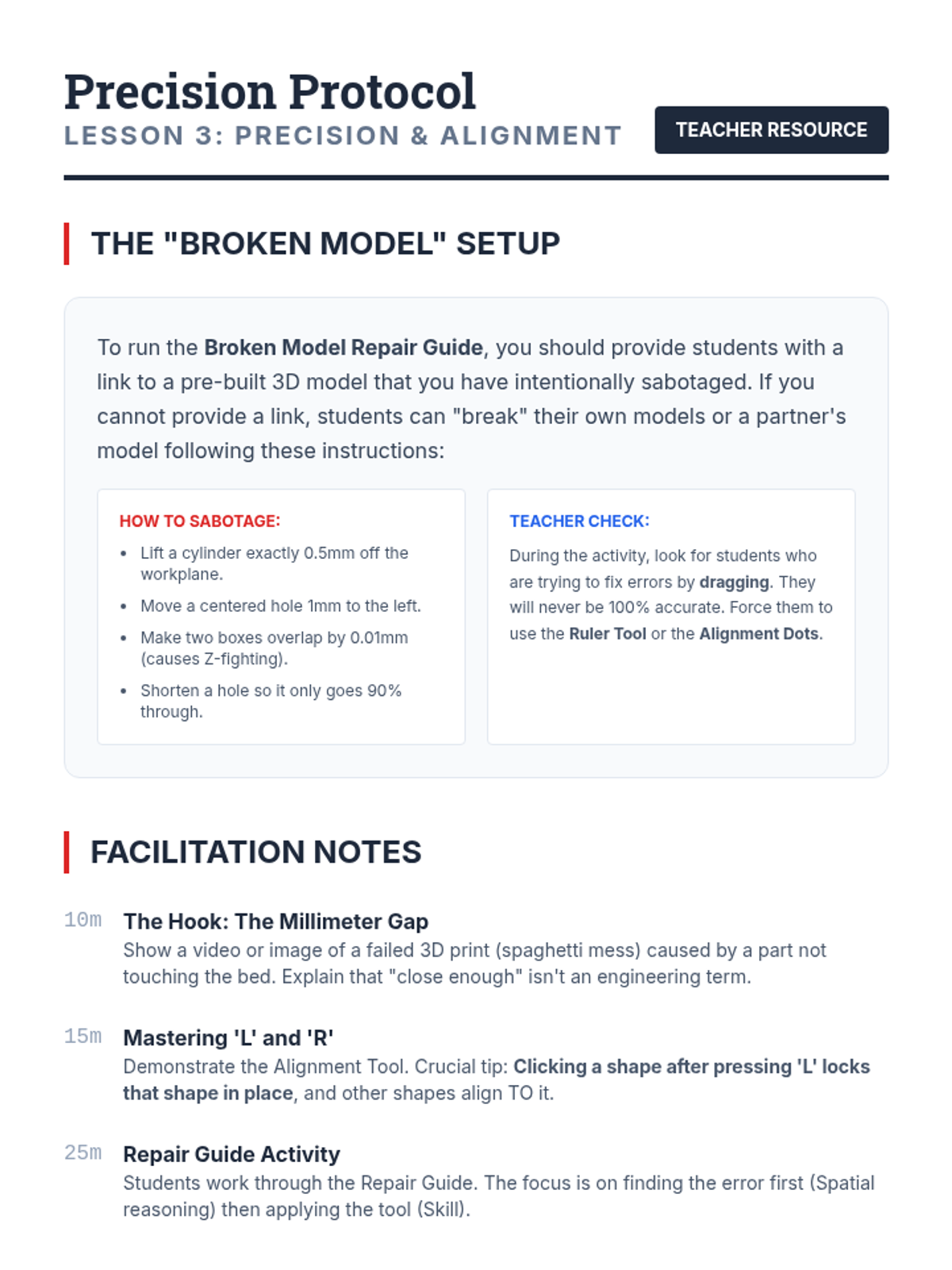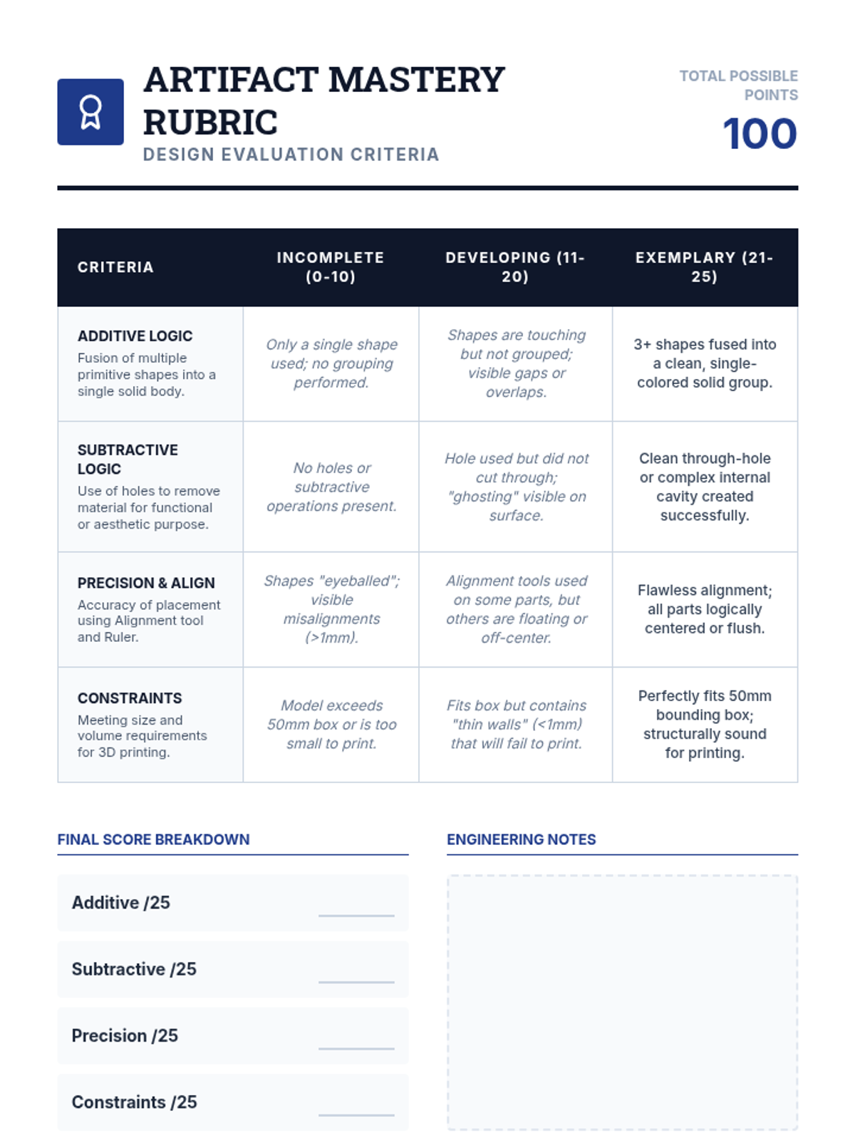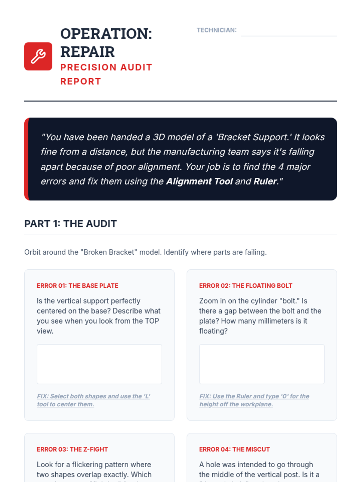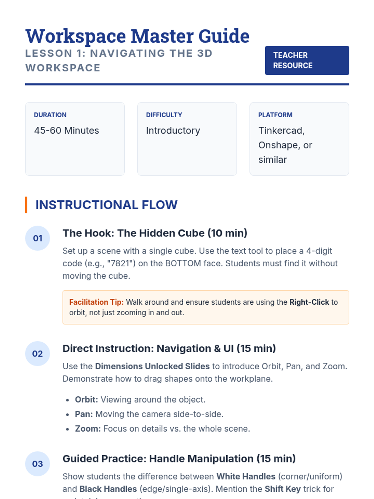 A comprehensive introduction to CAD and 3D geometry for 7th-grade students, focusing on spatial reasoning, boolean operations, precision, and parametric logic through hands-on modeling challenges.
