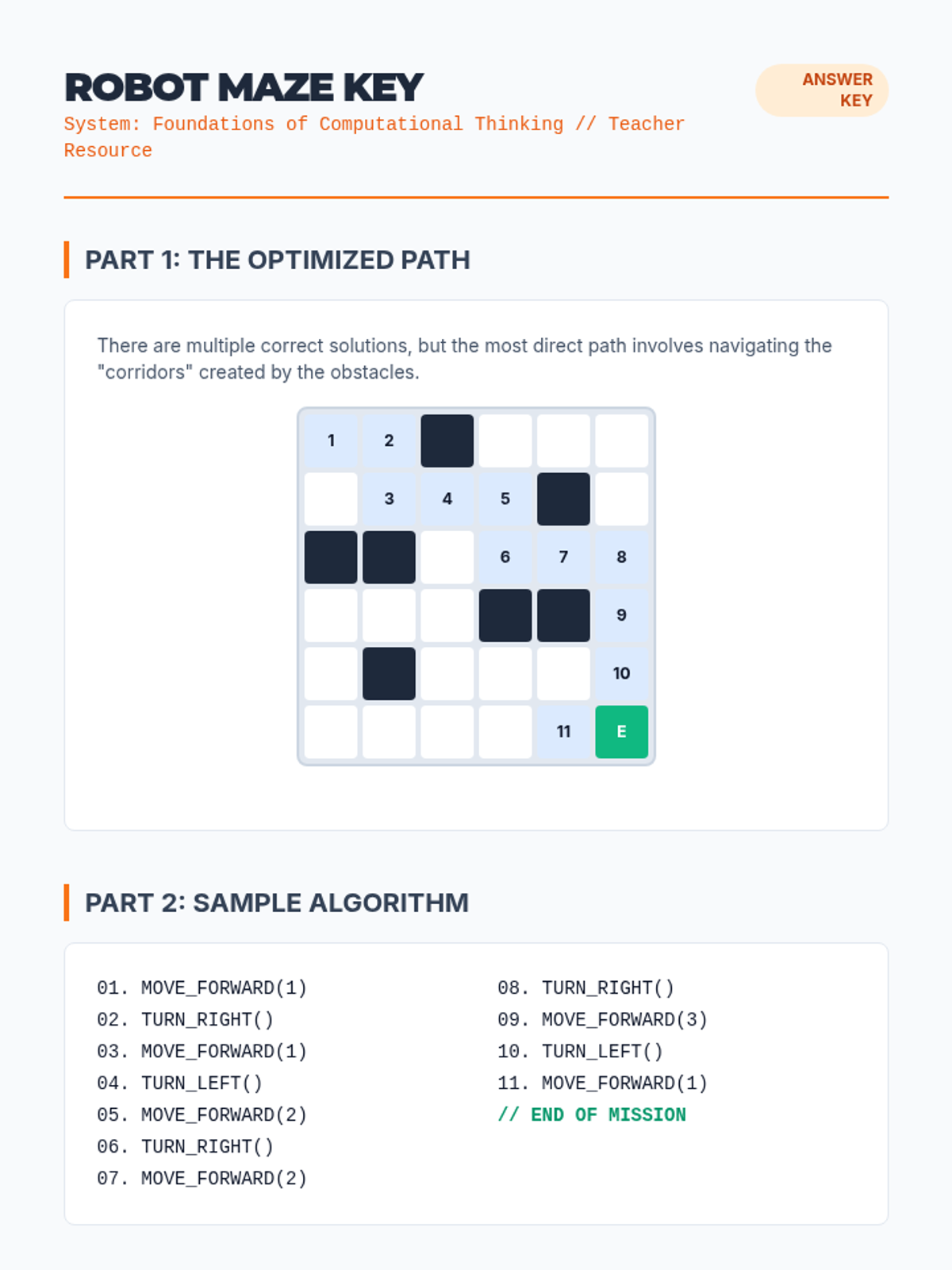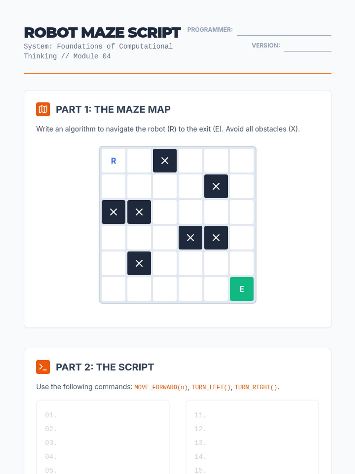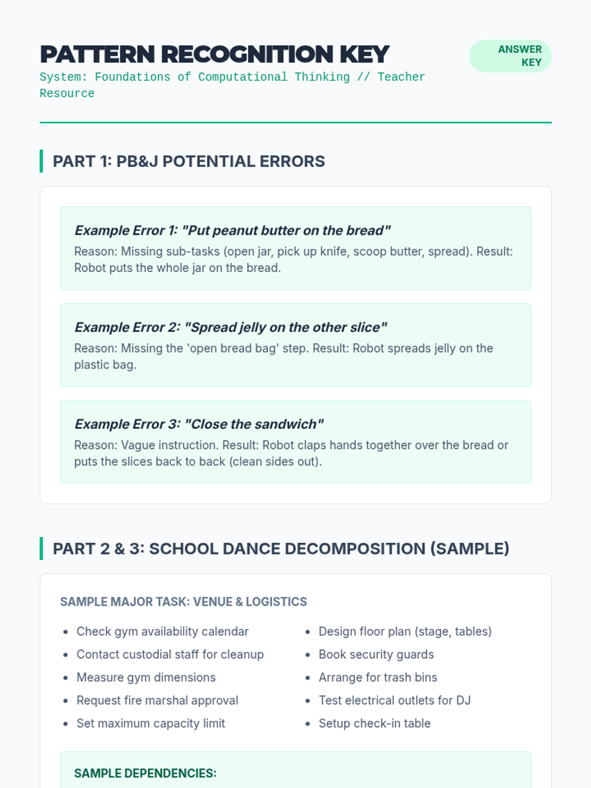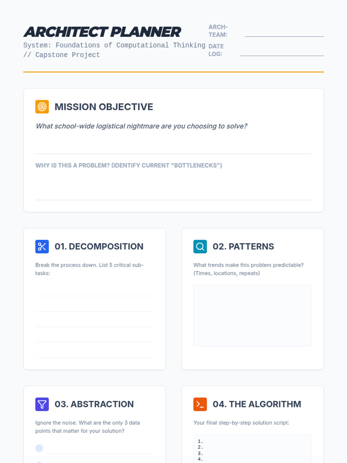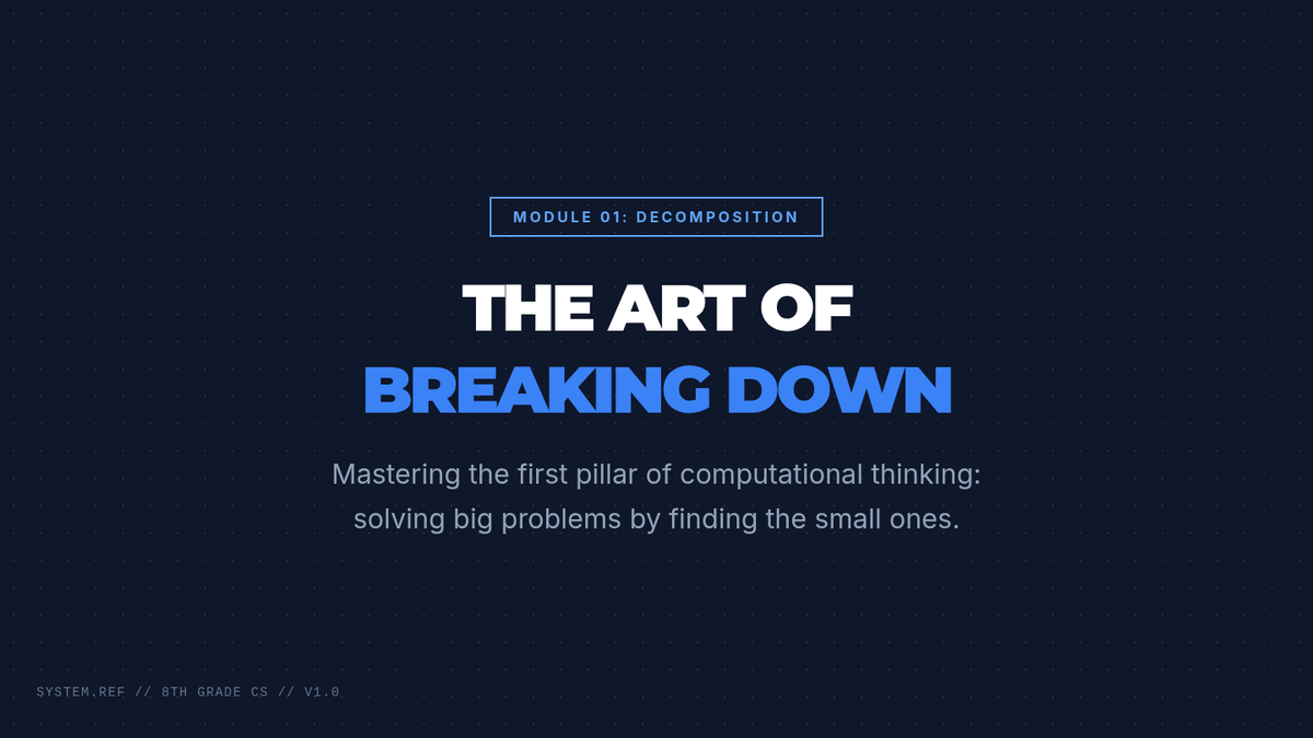 This sequence introduces 8th-grade students to the four pillars of computational thinking: decomposition, pattern recognition, abstraction, and algorithm design. Students progress from breaking down everyday tasks to designing systematic solutions for real-world school logistics problems.