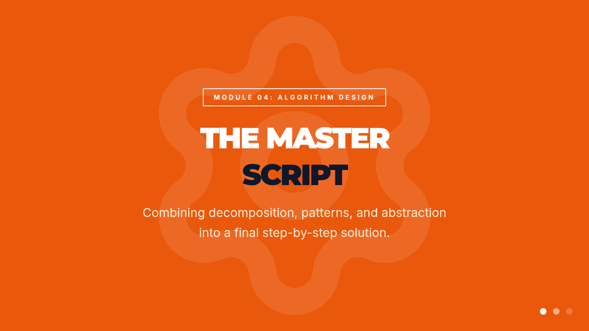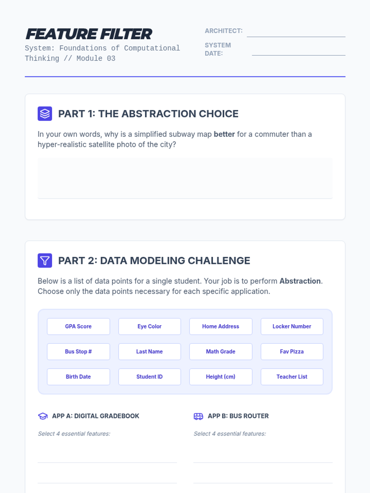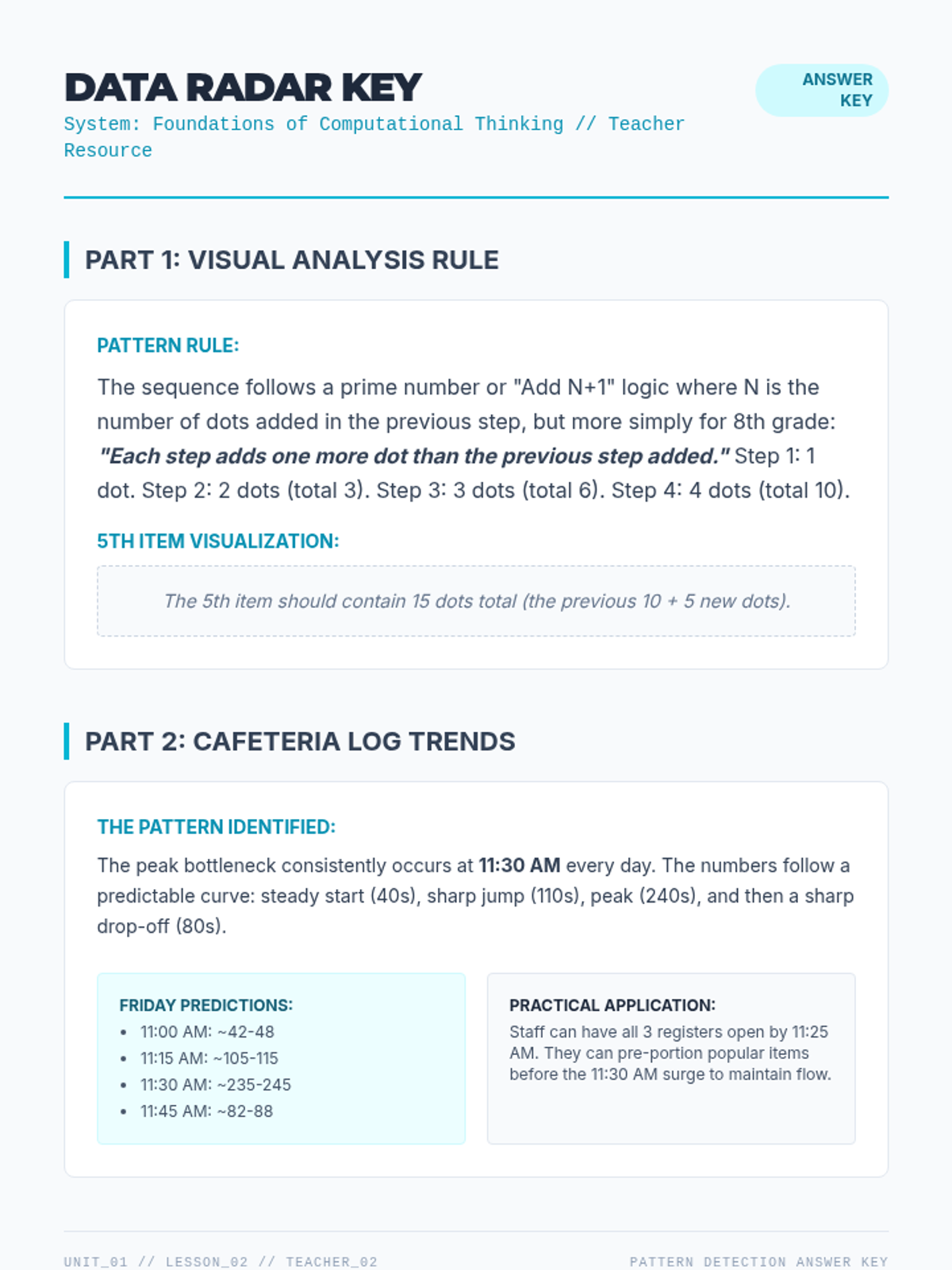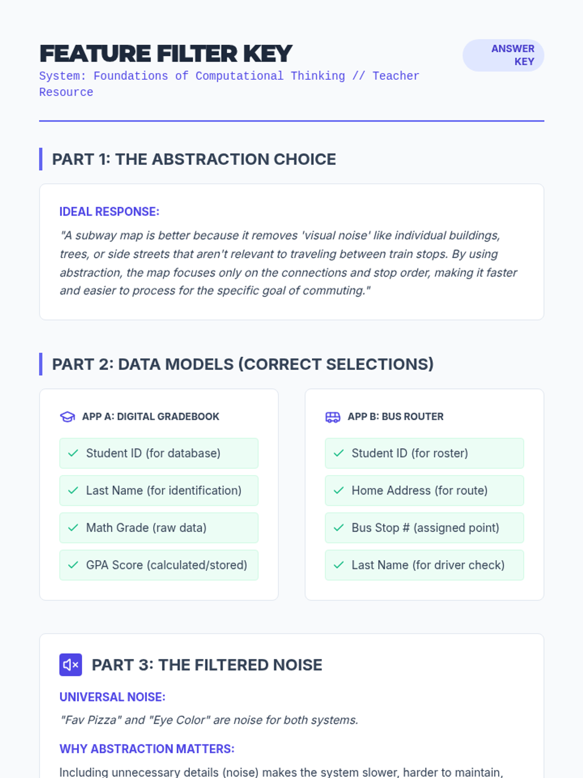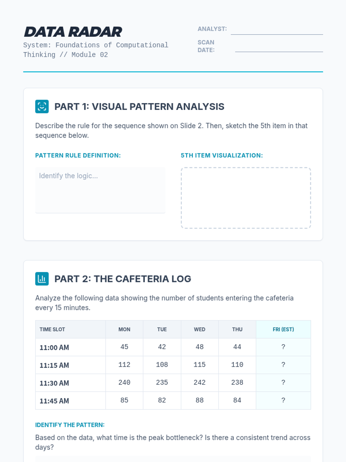 This sequence introduces 8th-grade students to the four pillars of computational thinking: decomposition, pattern recognition, abstraction, and algorithm design. Students progress from breaking down everyday tasks to designing systematic solutions for real-world school logistics problems.