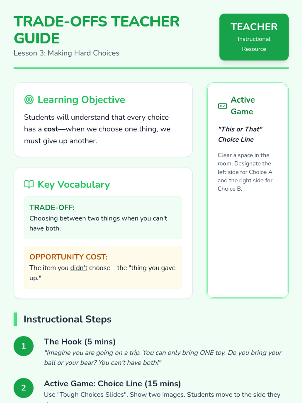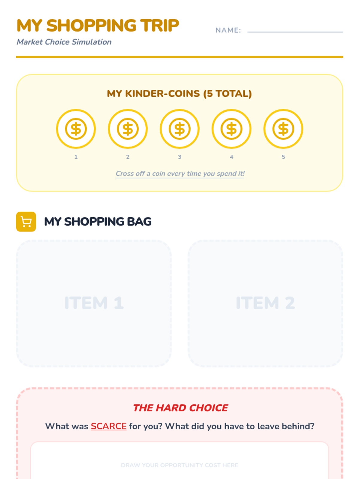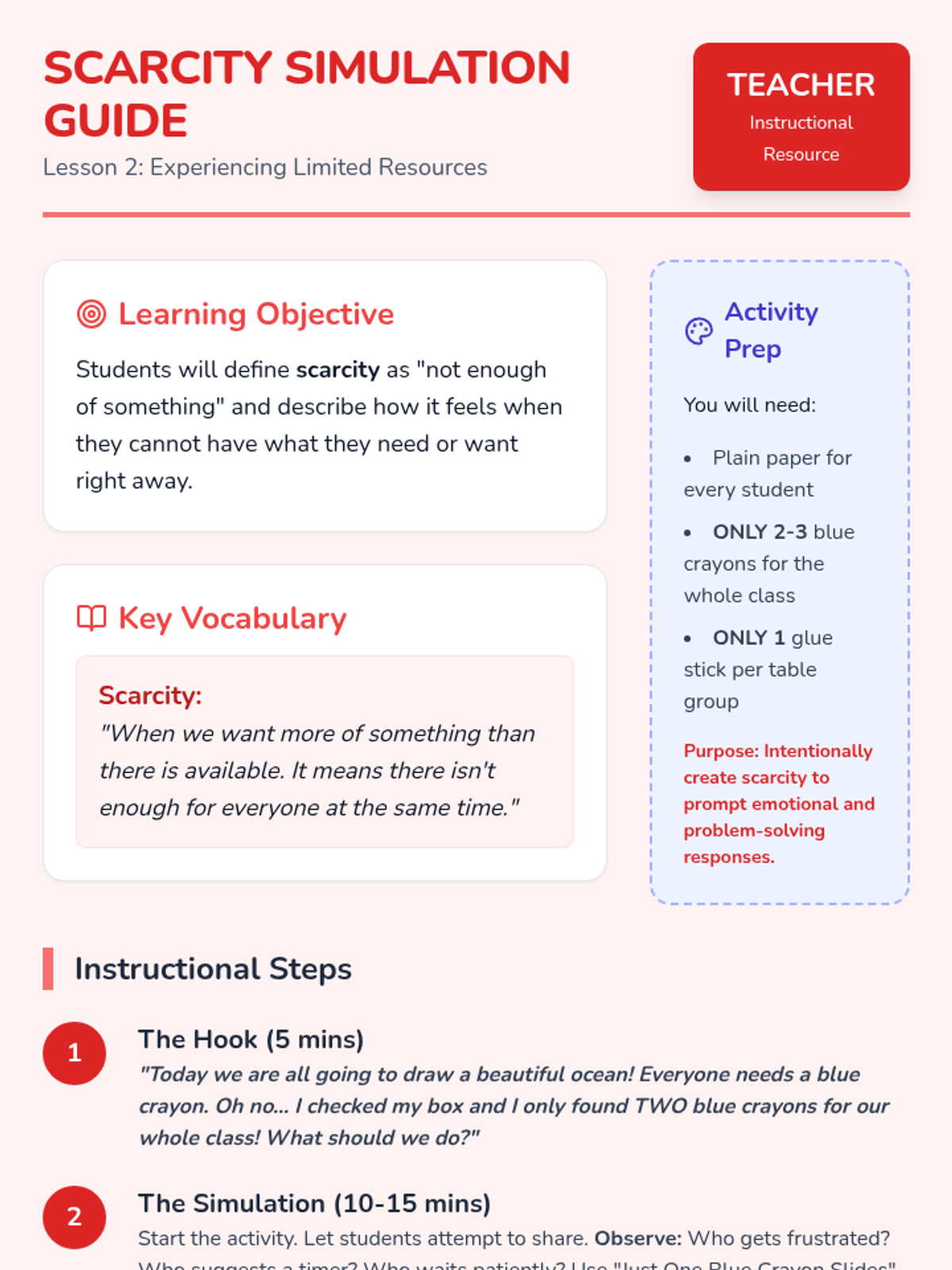 A foundational sequence for Kindergarten students exploring needs versus wants, scarcity, and decision-making through interactive games and hands-on simulations. Students learn that resources are limited and making a choice involves giving something else up, building early financial literacy.