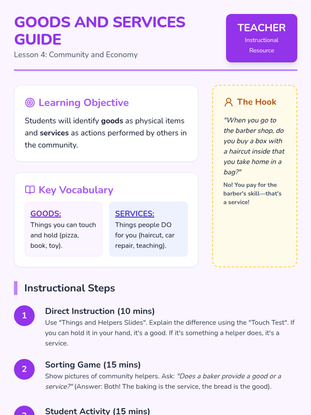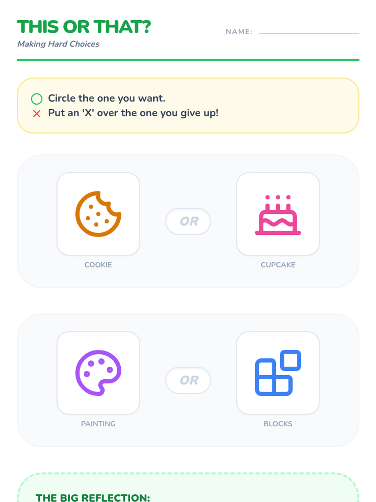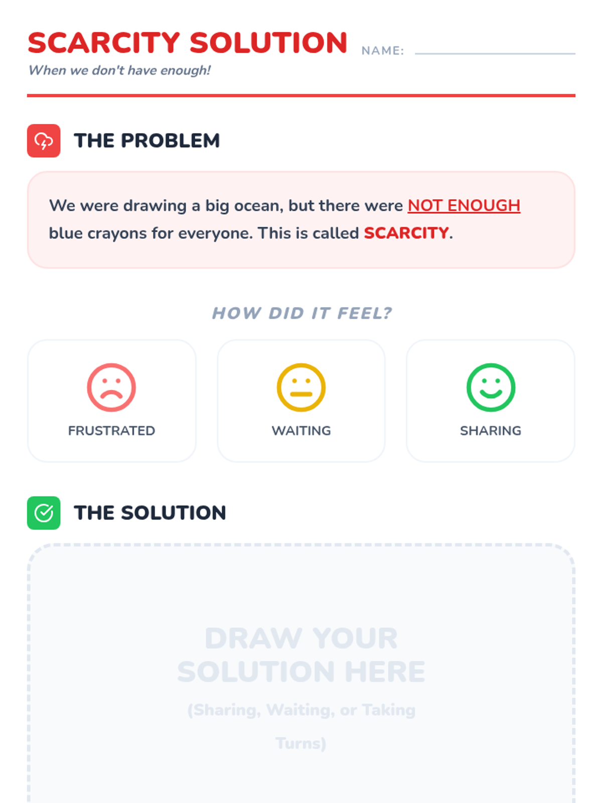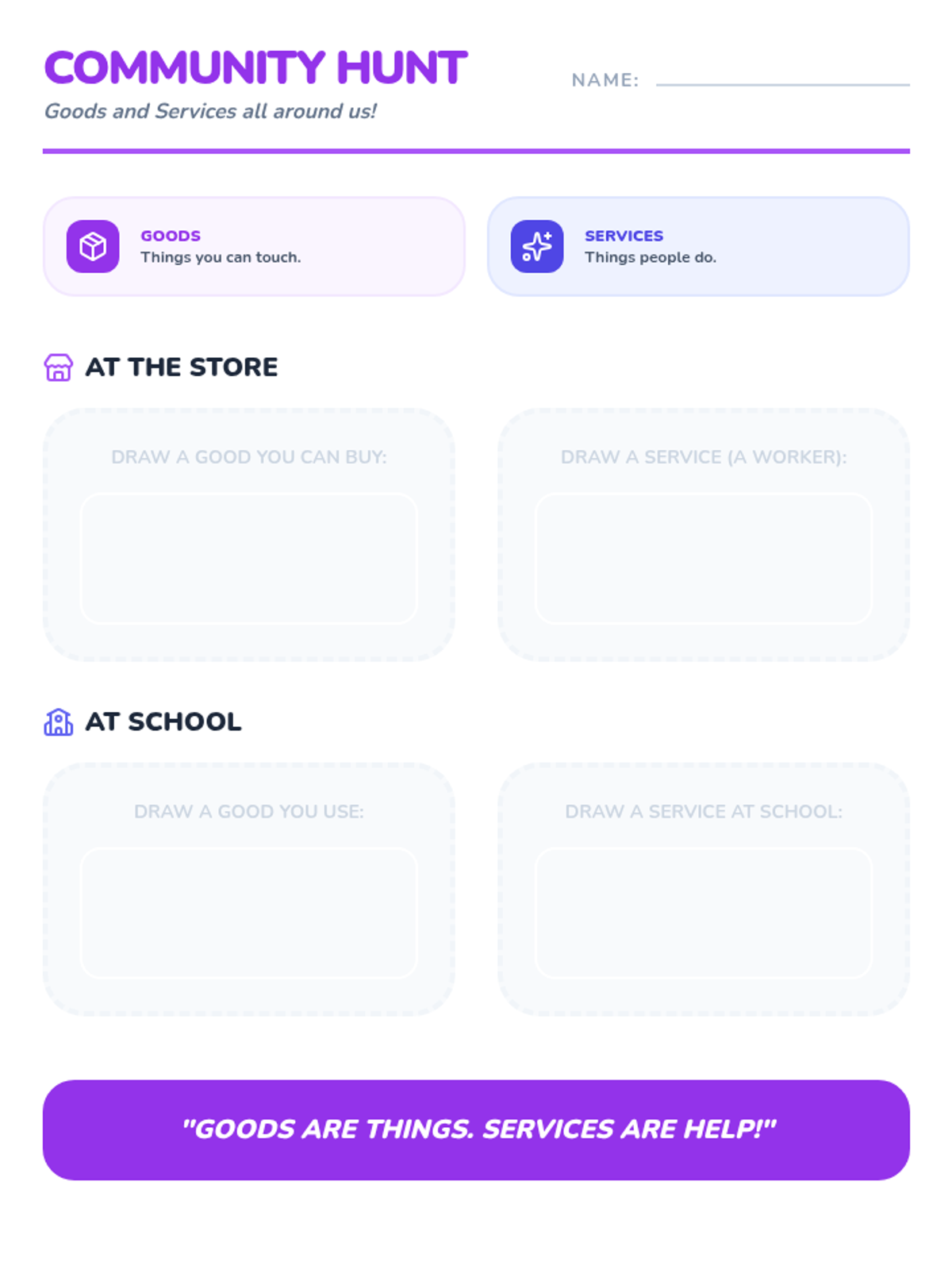 A foundational sequence for Kindergarten students exploring needs versus wants, scarcity, and decision-making through interactive games and hands-on simulations. Students learn that resources are limited and making a choice involves giving something else up, building early financial literacy.