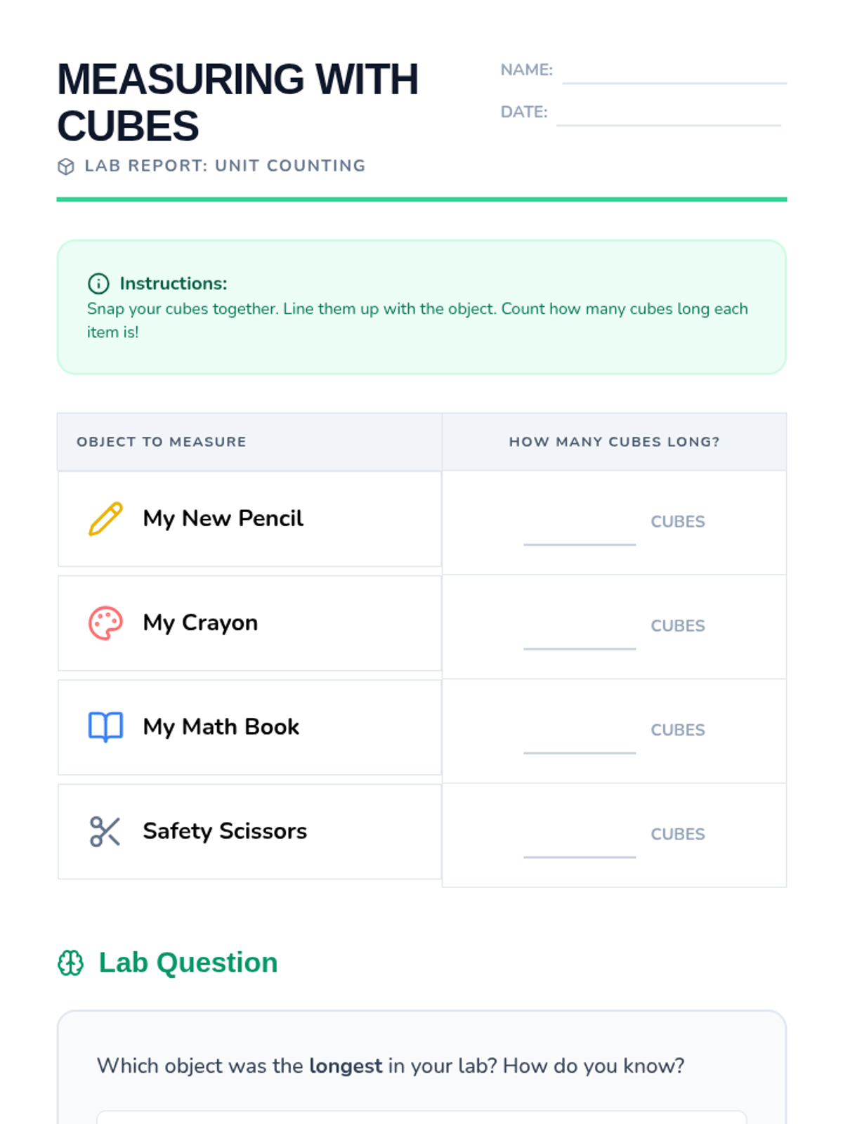 A foundational unit for 1st graders exploring the comparative language and logic of measurement. Students master direct and indirect comparison, ordering by attributes, and spatial reasoning before moving to standard units.