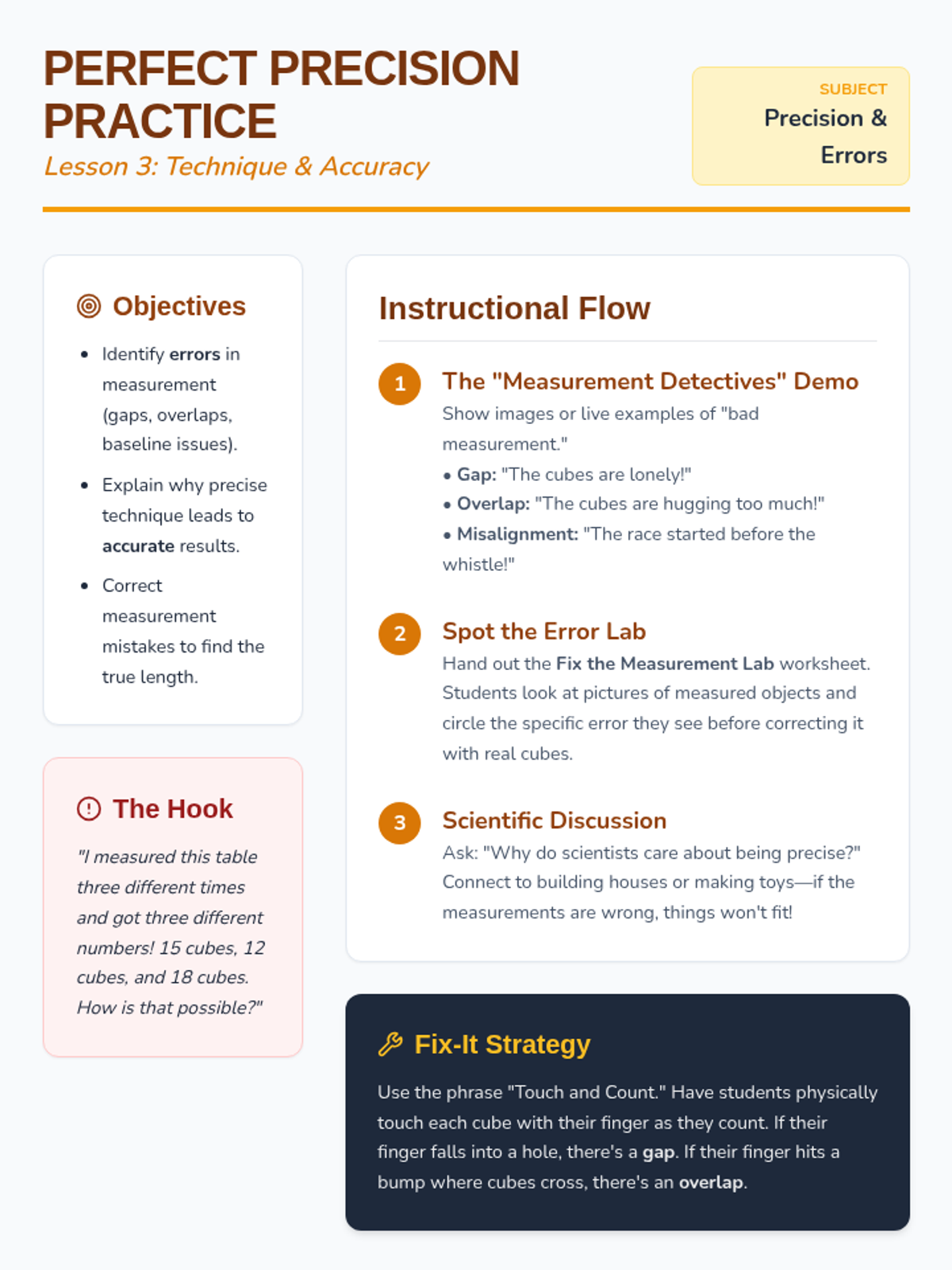 This 1st Grade geometry sequence introduces students to linear measurement and the concept of perimeter using non-standard units. Students progress from direct comparison of lengths to measuring straight edges with cubes, and finally calculating the total distance around shapes in a culminating project.