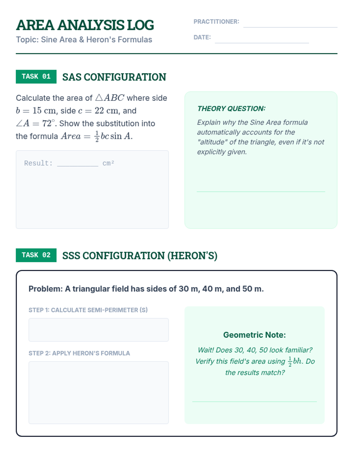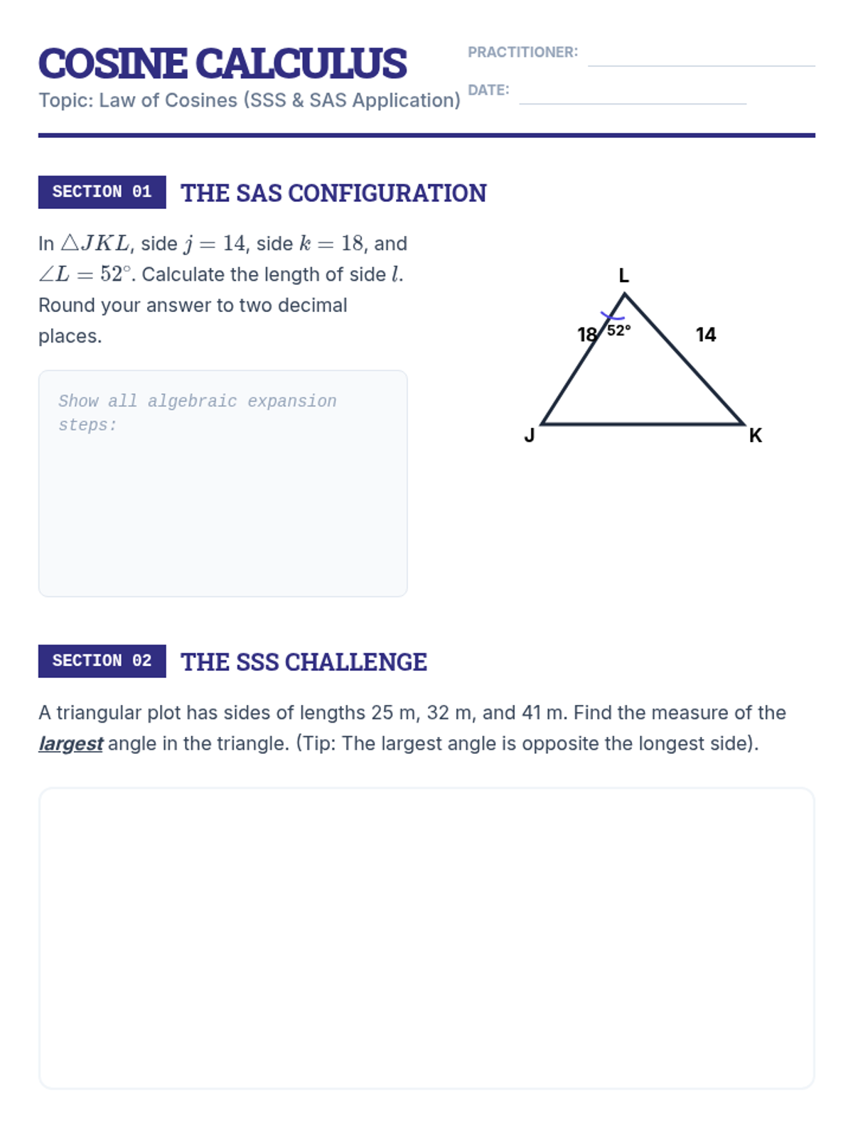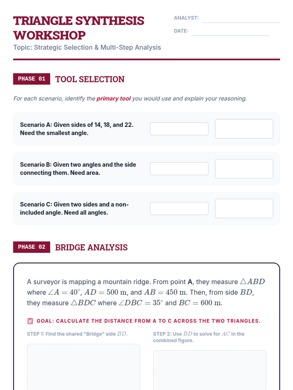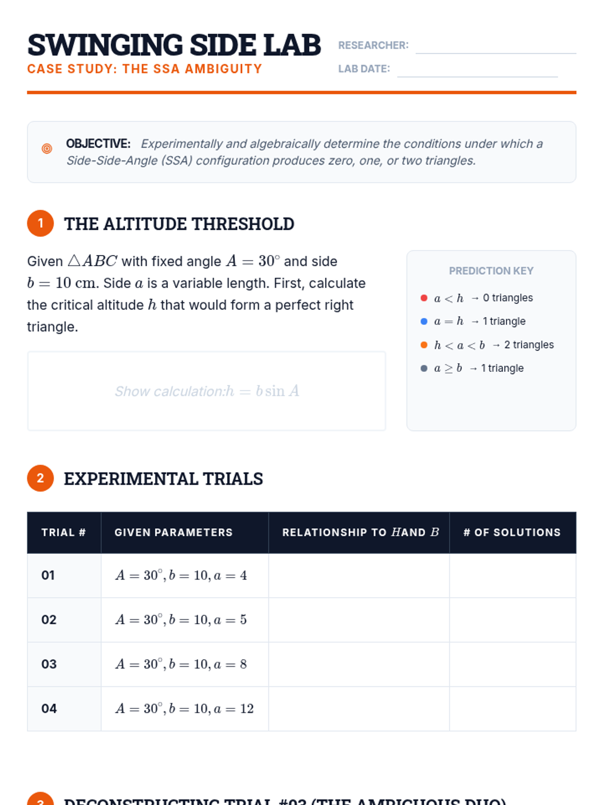 This undergraduate-level sequence explores the theoretical foundations and analytical applications of trigonometry for oblique triangles. Students derive the Law of Sines and Law of Cosines, analyze the geometric nuances of the SSA ambiguous case, and master advanced area formulas like Heron's, preparing them for calculus and physics.