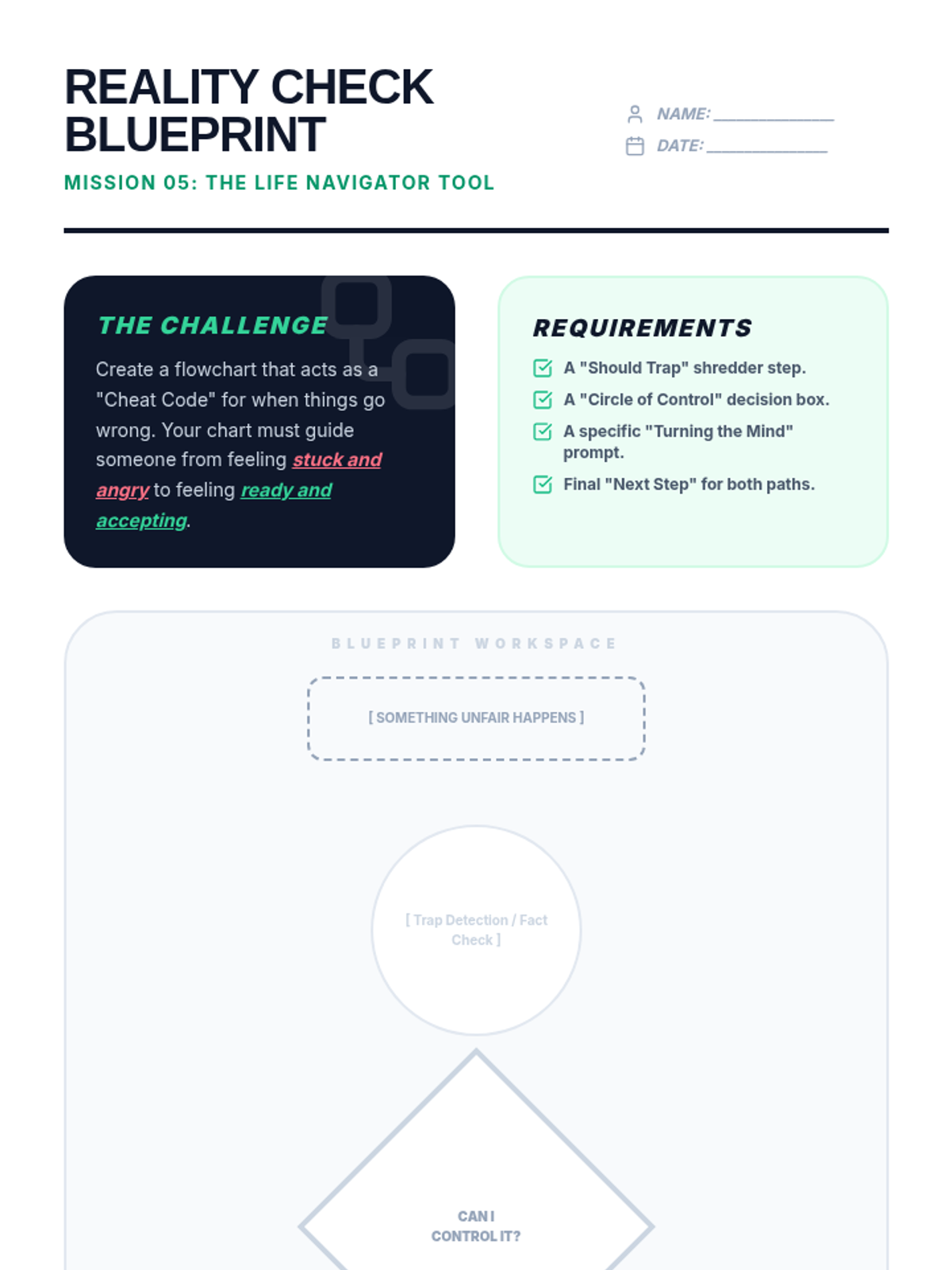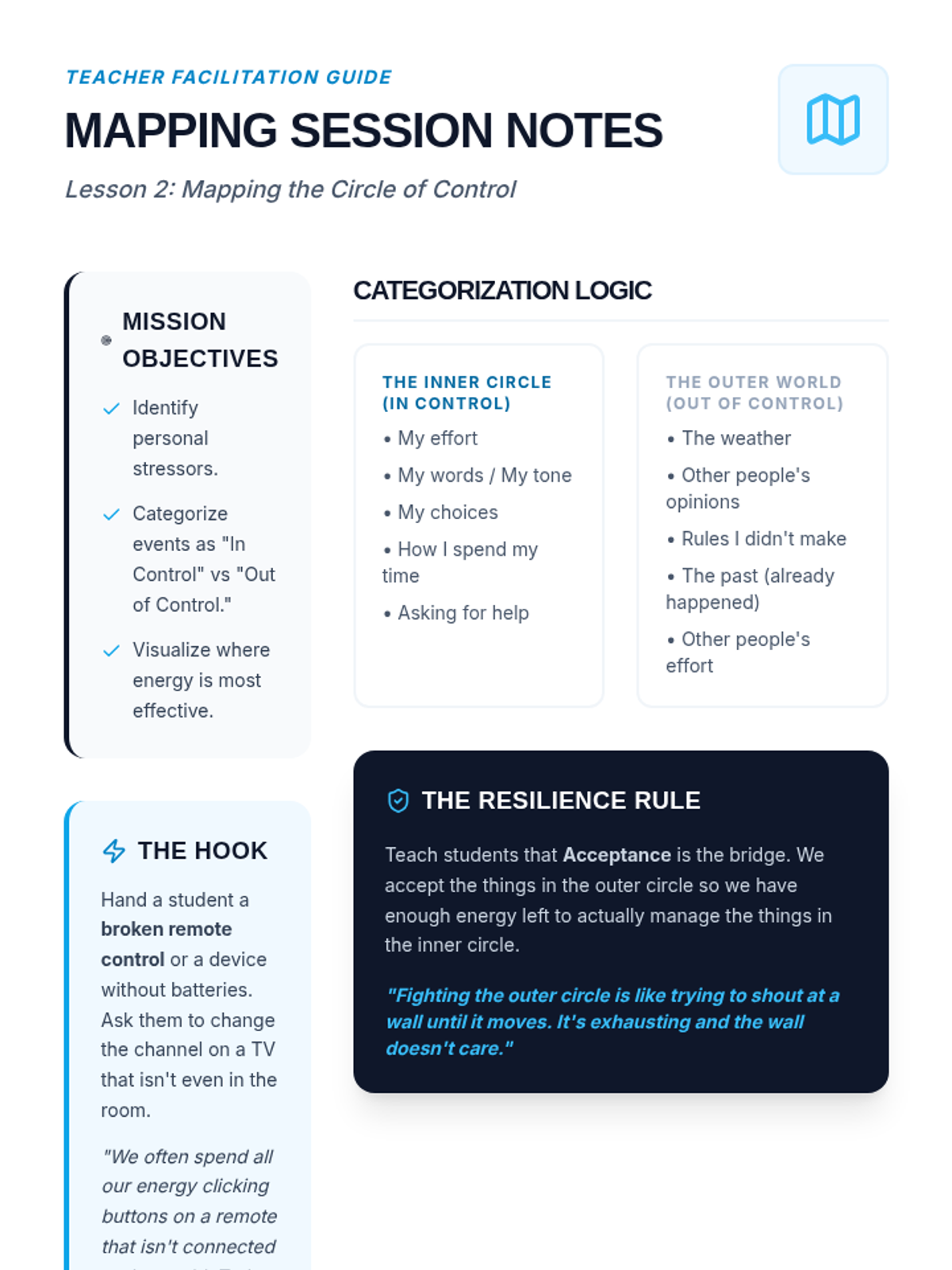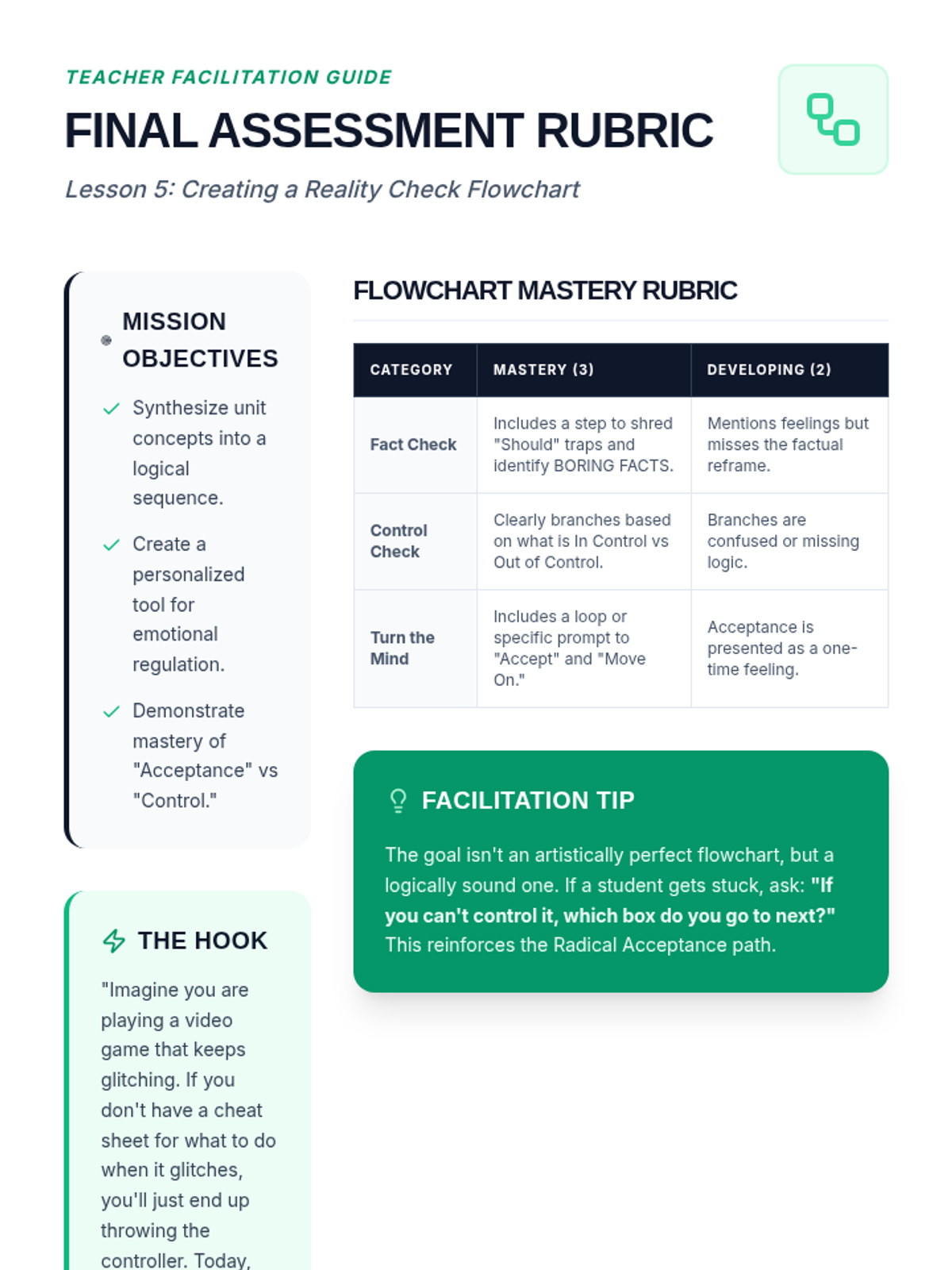 A 5-lesson sequence for 6th graders on radical acceptance, distinguishing control, and building emotional resilience through logic-based tools.