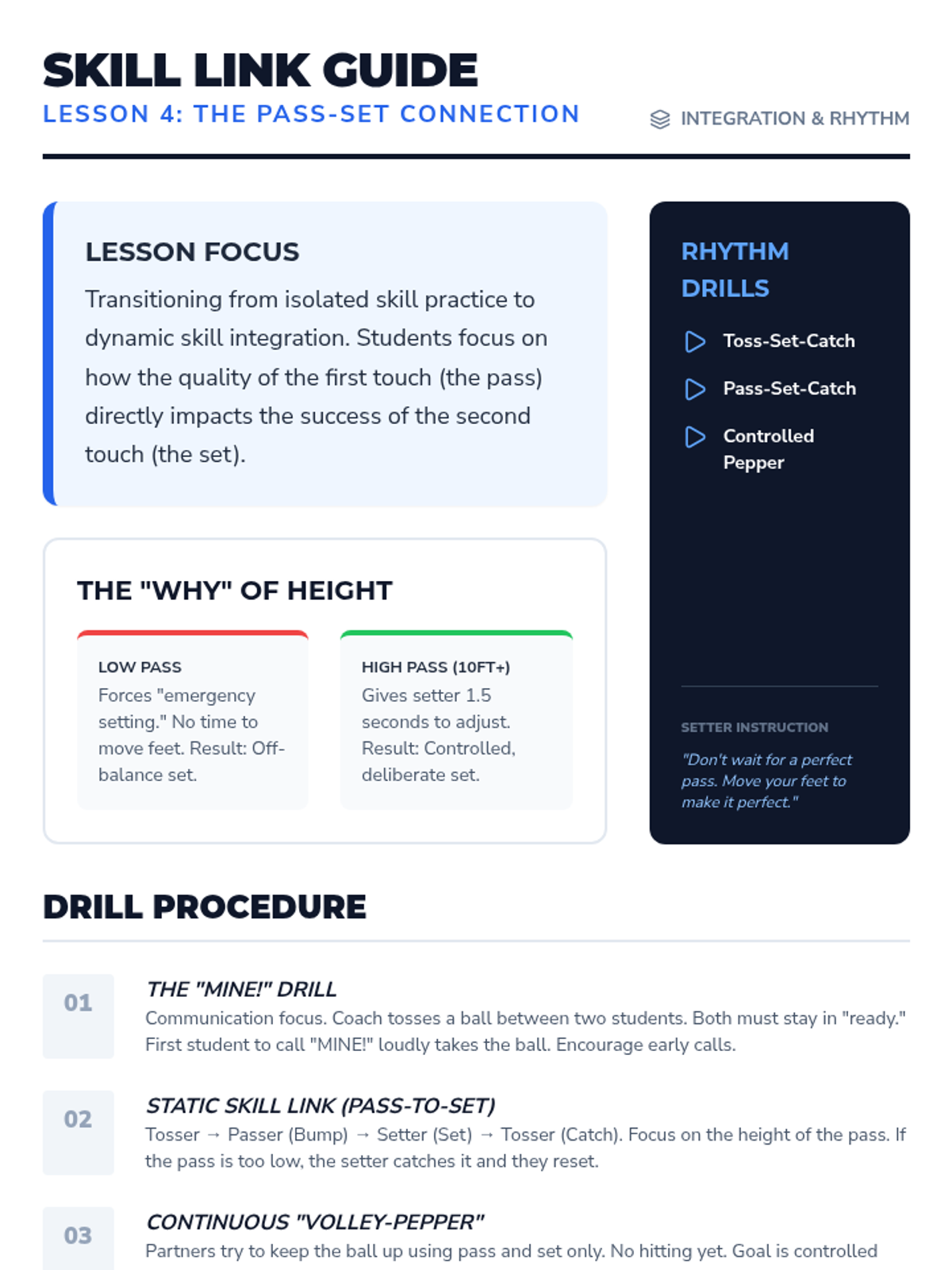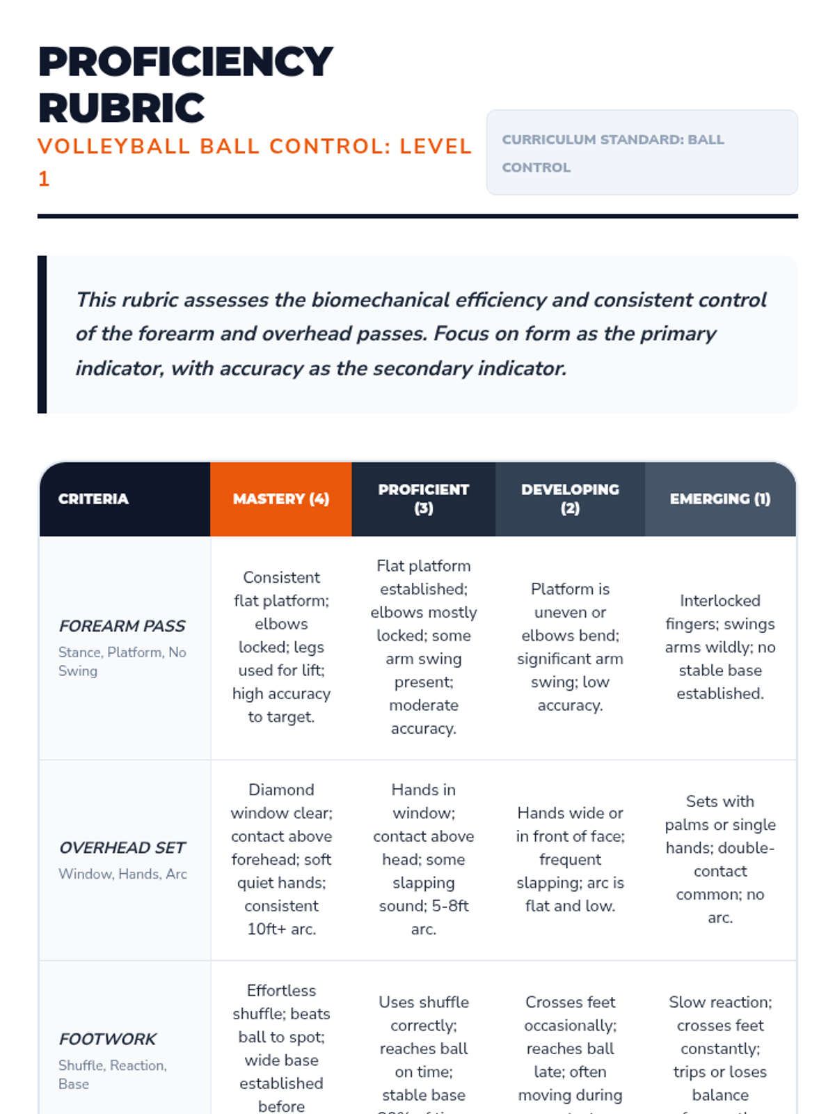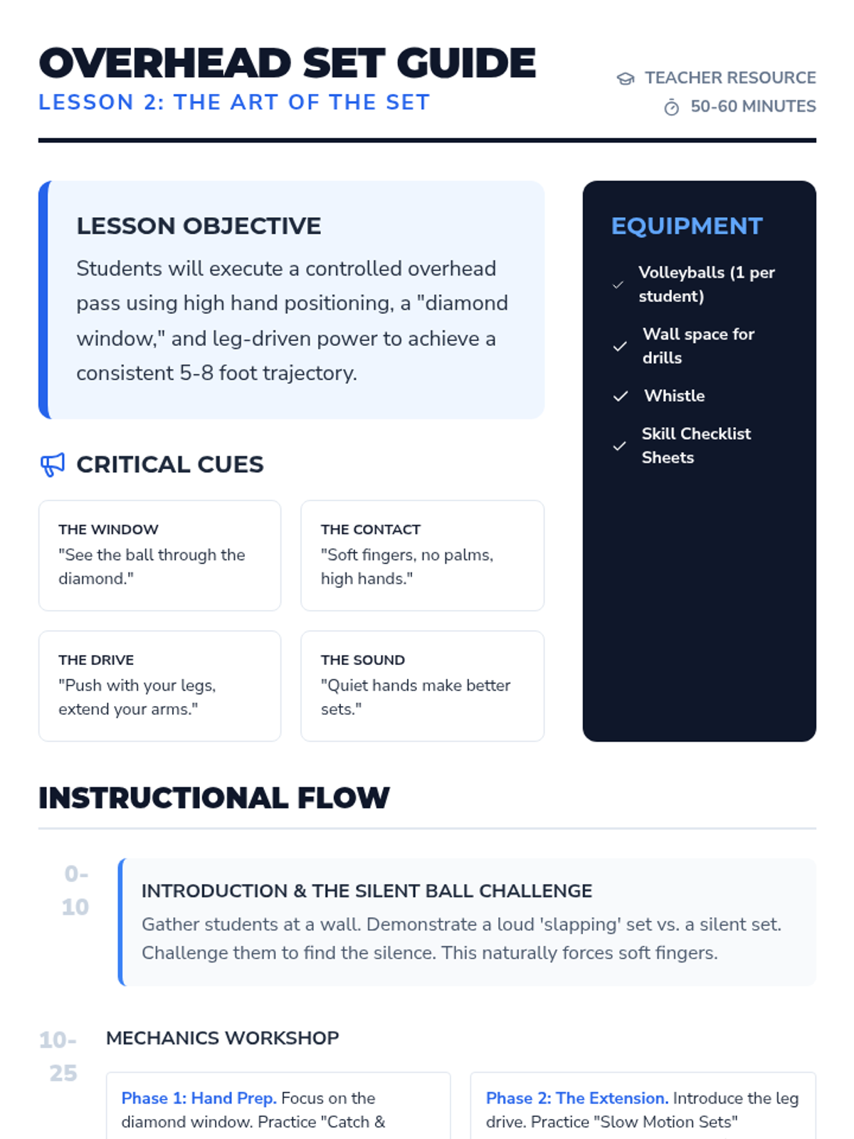 A comprehensive introduction to volleyball biomechanics, focusing on the forearm pass and overhead set. Students progress from basic athletic stance to dynamic partner play, emphasizing ball control, platform stability, and hand positioning.