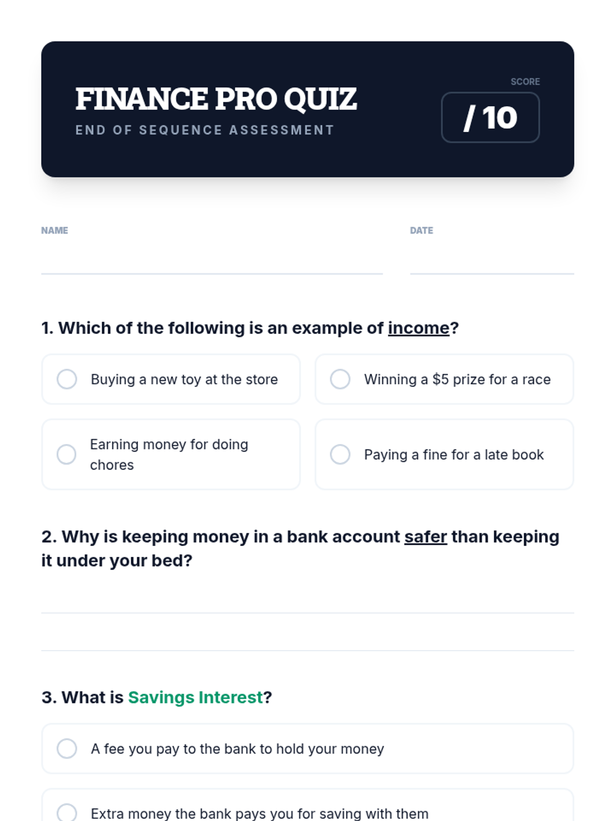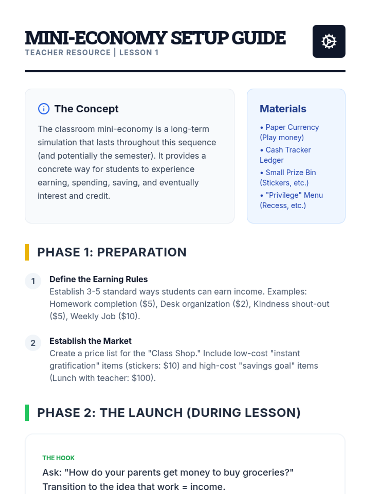 An introductory economics sequence for third-graders exploring personal finance, banking functions, and the concepts of interest and credit. Students learn through a classroom mini-economy, simulations, and real-world scenarios to build financial literacy.