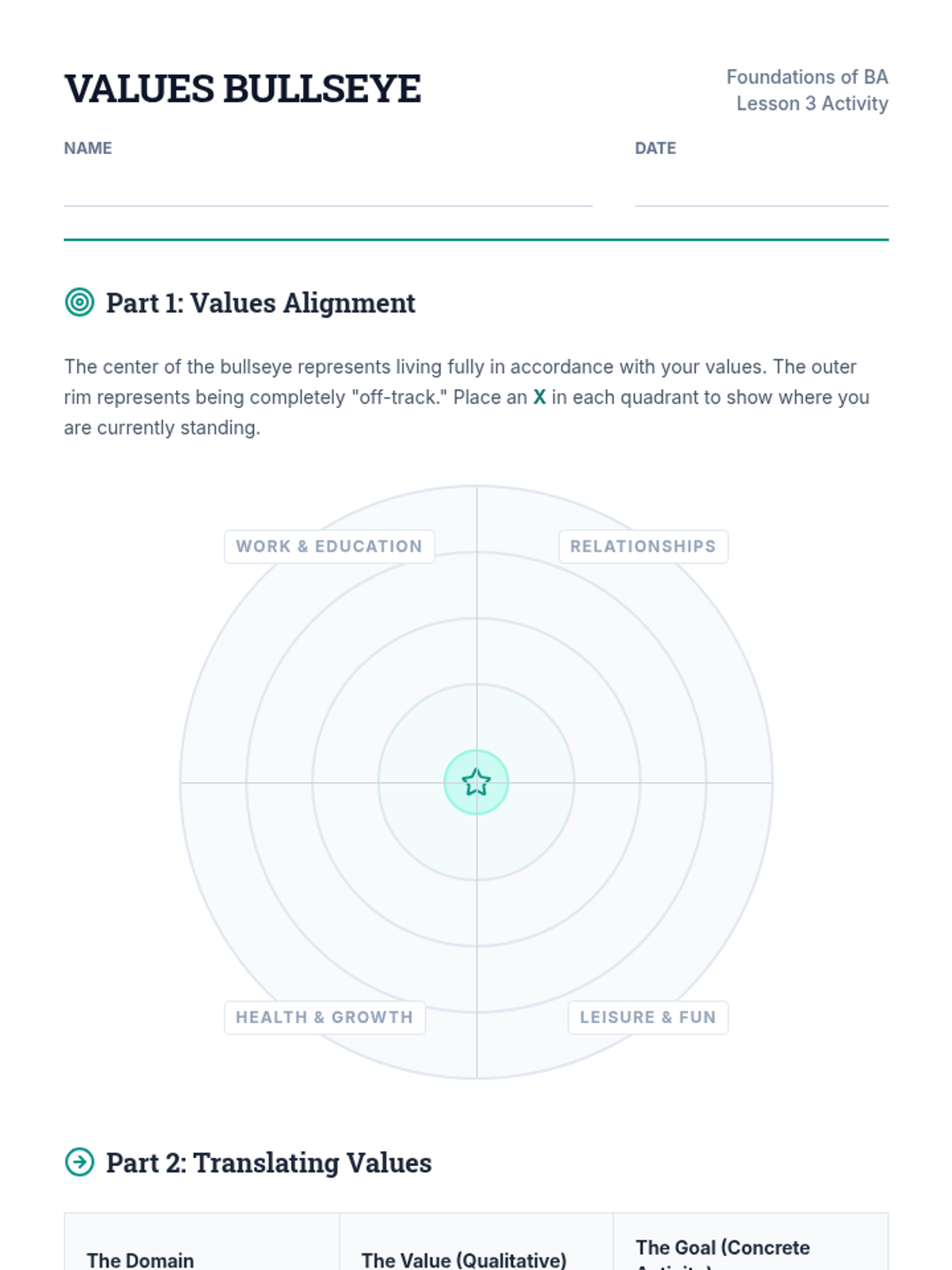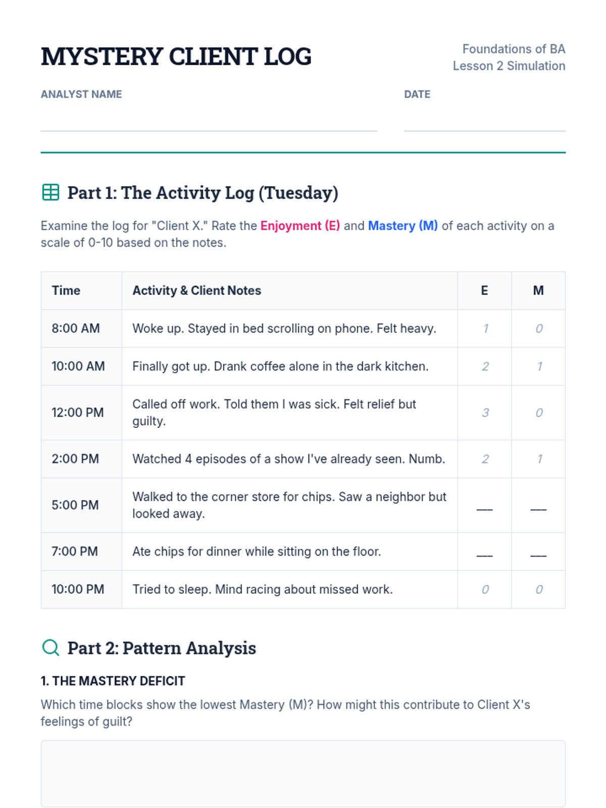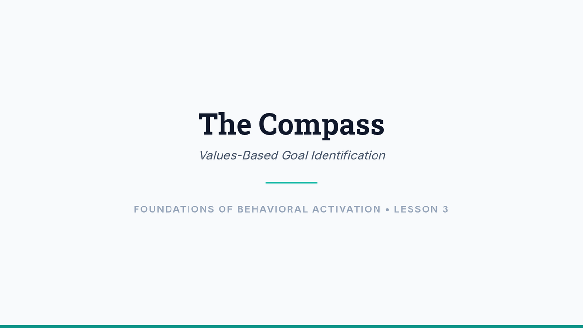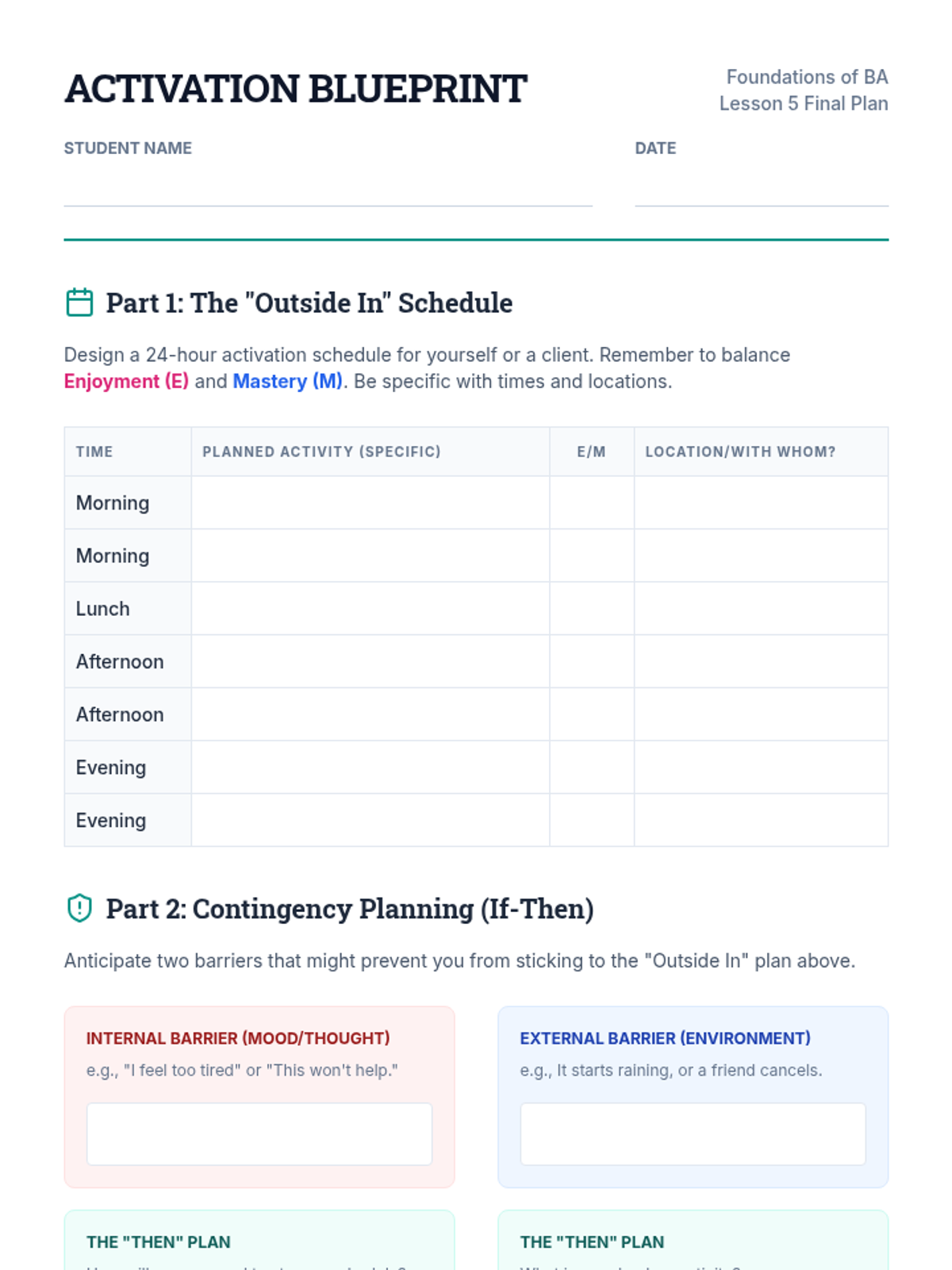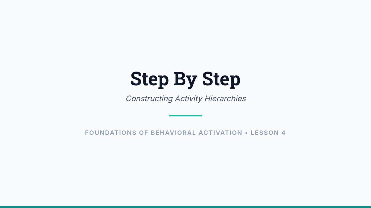 This sequence introduces undergraduate students to Behavioral Activation (BA), focusing on the theoretical cycle of depression, activity monitoring, values-based goal setting, and intervention planning. Students move from understanding the 'vicious cycle' of withdrawal to designing structured, values-aligned activity schedules.